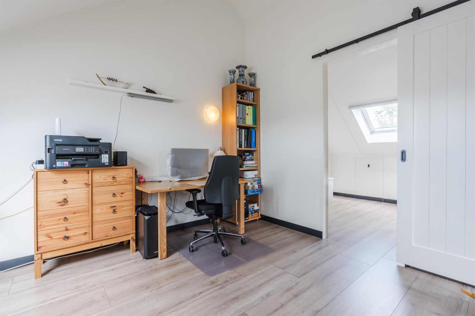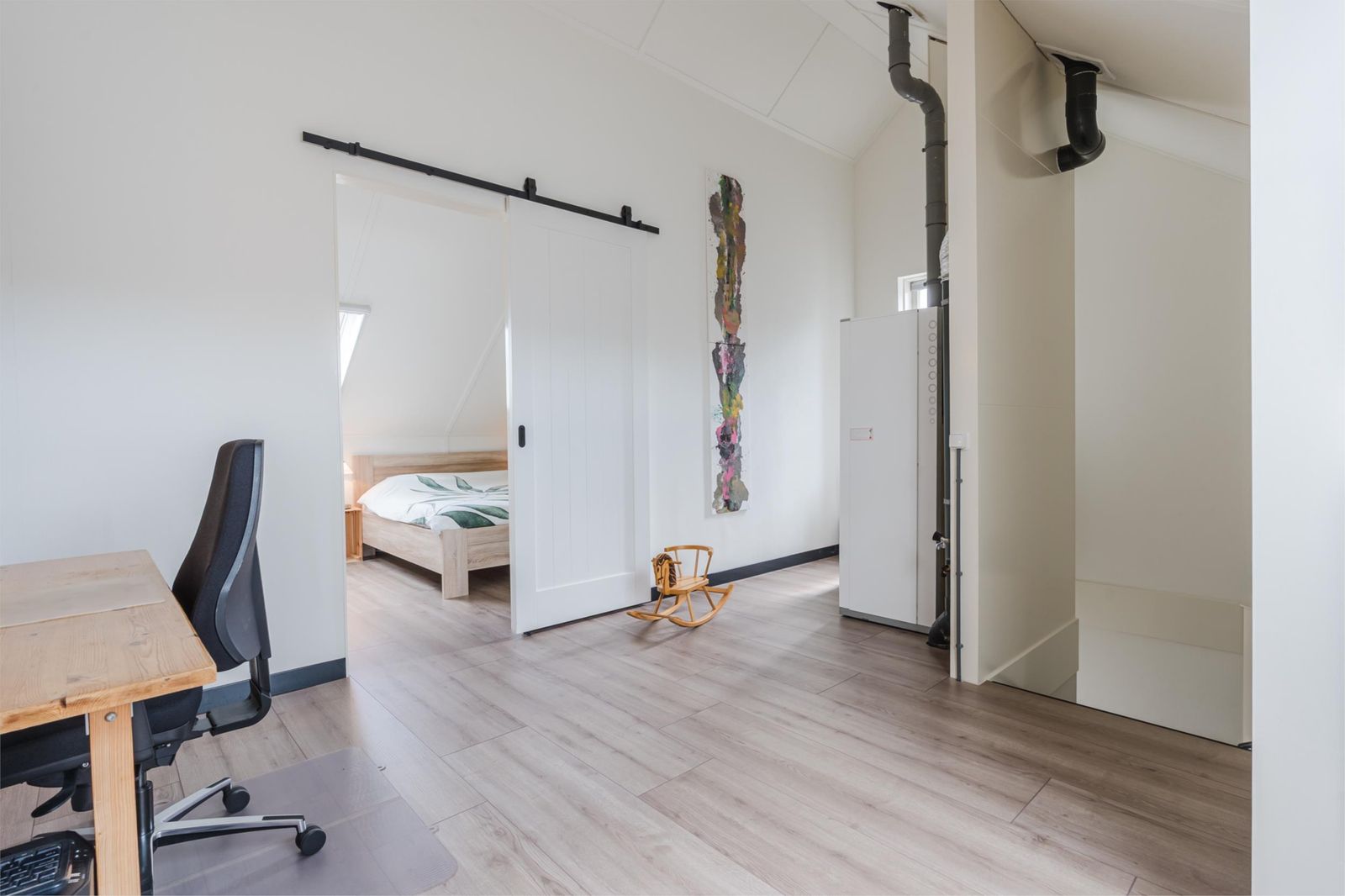 De tweede verdieping bevat de vierde slaapkamer en heeft daarnaast nog ruimte voor een thuiskantoor of werkruimte en nog veel bergruimte. Het is mogelijk om hier nog een vliering te realiseren. Daglicht en frisse lucht komen hier binnen via 2 Velux dakramen. Op deze verdieping staat de ATAG warmtepomp die in 2021 in gebruik is genomen. De buitenunit van de warmtepomp hangt aan de buitenmuur, boven de werkkamer. Boven de warmtepomp hangt de centrale kast voor de mechanische ventilatie.