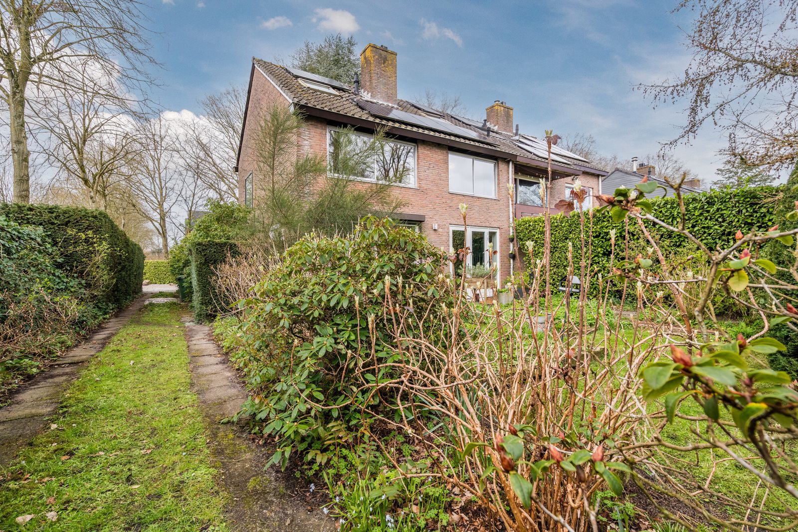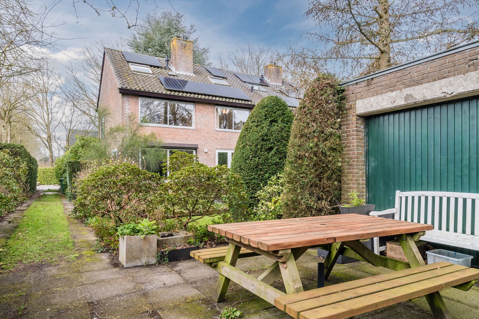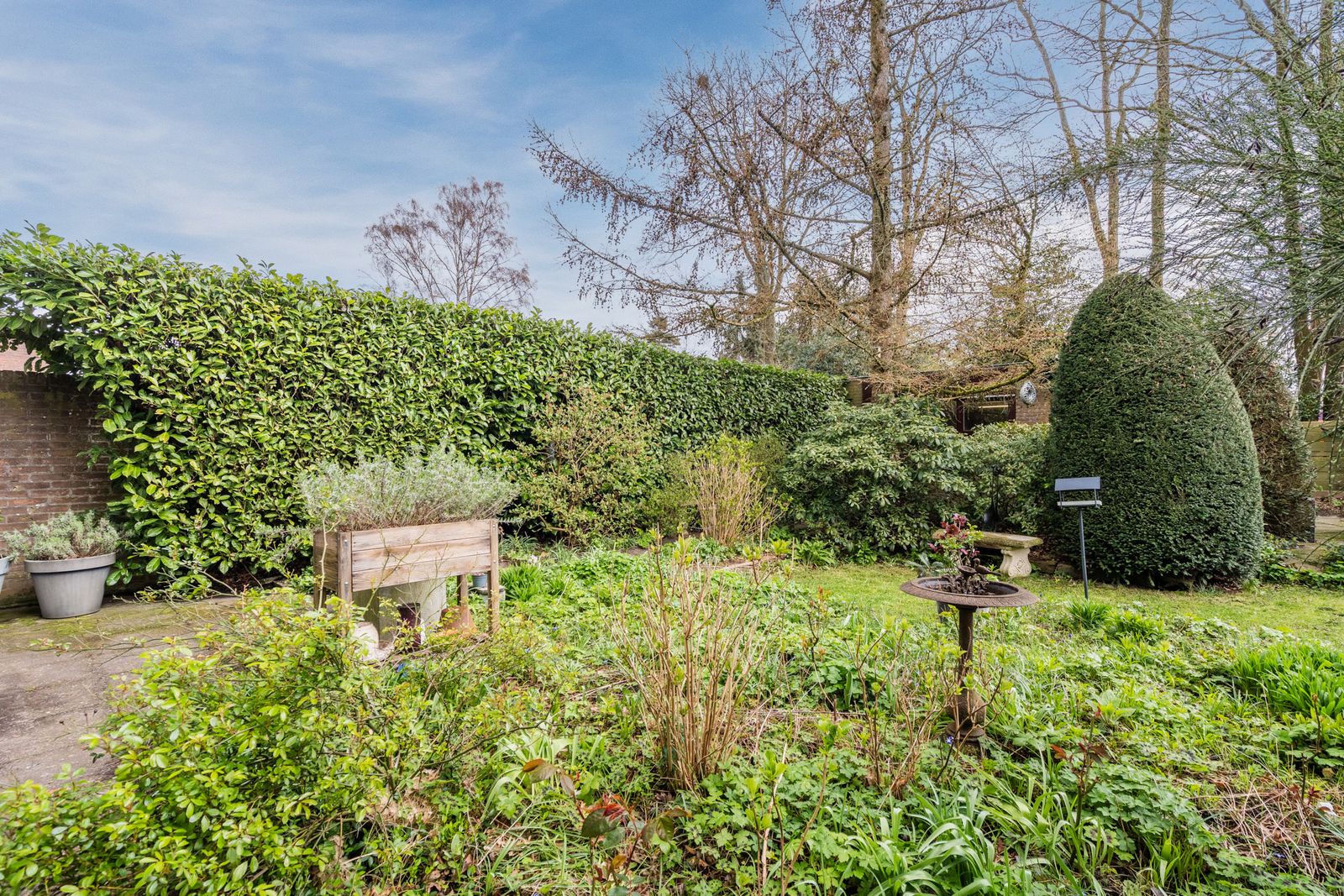 De fraai aangelegde tuin rondom de woning biedt volop privacy en zon, met volwassen hagen, een gazon en meerdere terrassen – een heerlijke plek om te ontspannen.