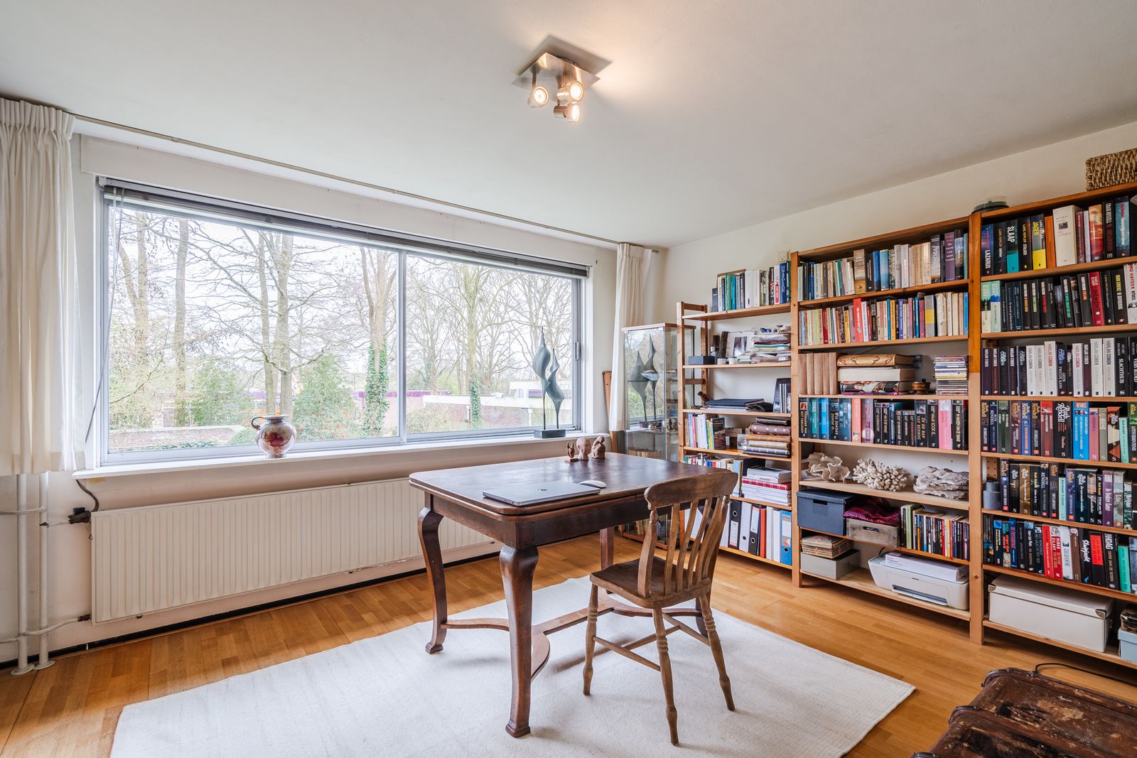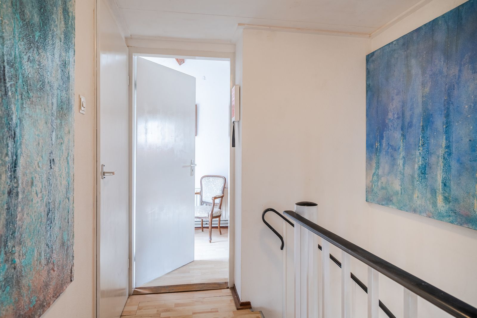 Overloop met toegang tot vier slaapkamers: een ruime L-vormige master bedroom, een grote tweede slaapkamer en twee extra kamers, ideaal als kinder-, werk- studeer- of kleedkamer. Eén kamer beschikt over een balkon aan de voorzijde, waar u op zomerse dagen heerlijk koel kunt zitten met uitzicht op de laan. De badkamer is compleet uitgerust met douche, ligbad, wastafel en tweede toilet.