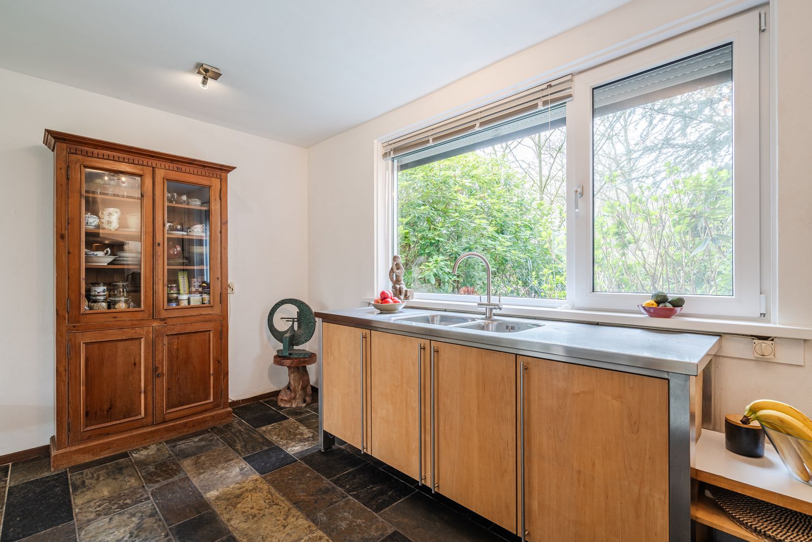 De dubbele garage is bereikbaar via de lange oprit en beschikt over water, elektra en een wasmachineaansluiting.