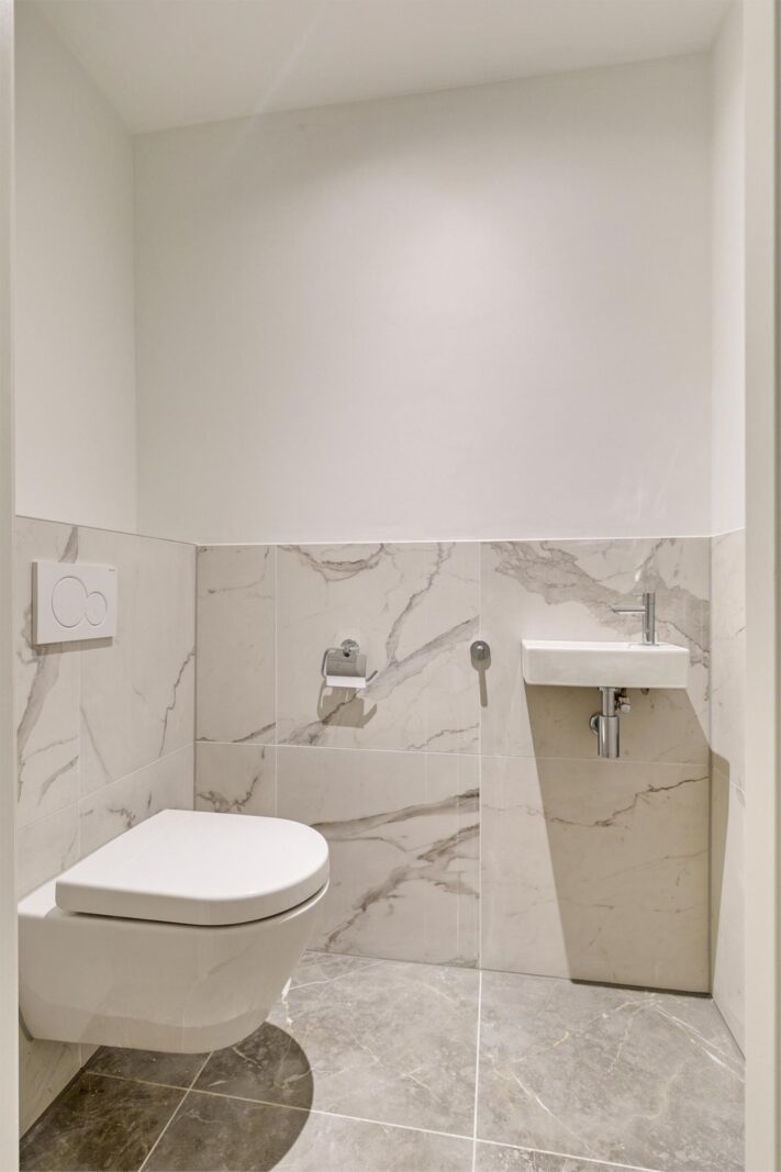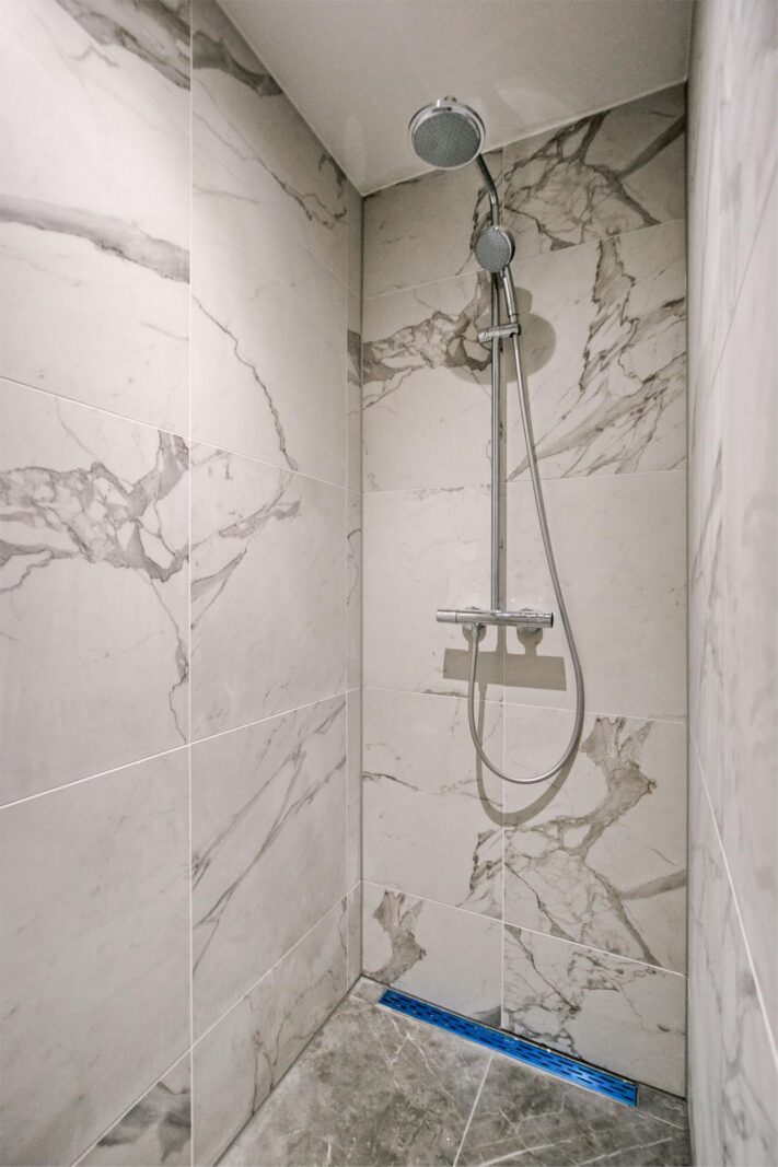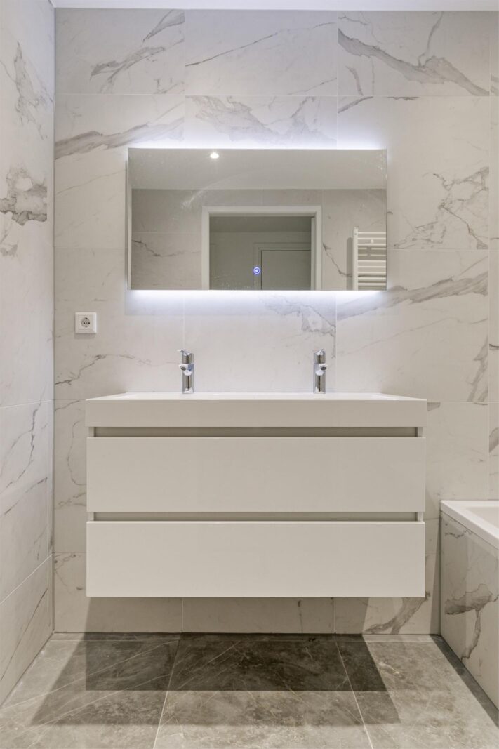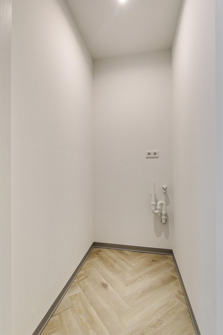 Je komt binnen in een ruime hal die toegang biedt tot een royale slaapkamer en een luxe badkamer met ligbad, aparte douche en dubbele wastafel. Daarnaast vind je een separaat toilet en een praktische berging met CV-ketel en aansluitingen voor wasmachine en droger. Achterin bevindt zich nog een tweede ruime slaapkamer, met extra kastruimte onder de trap.