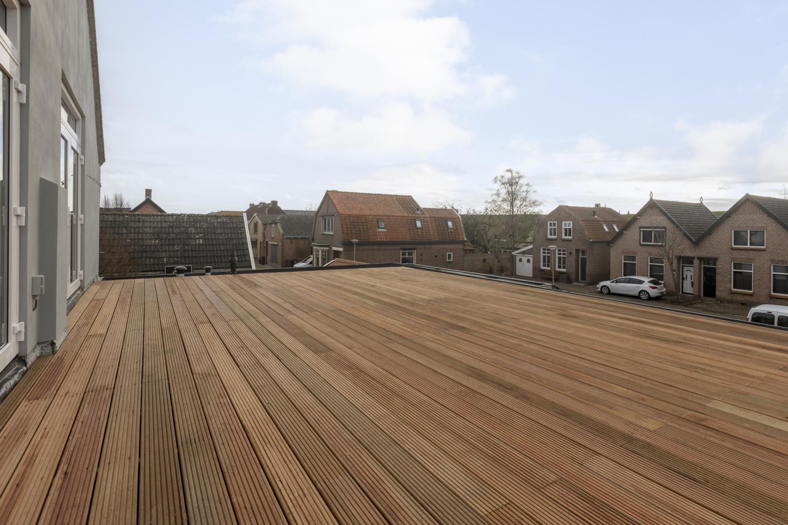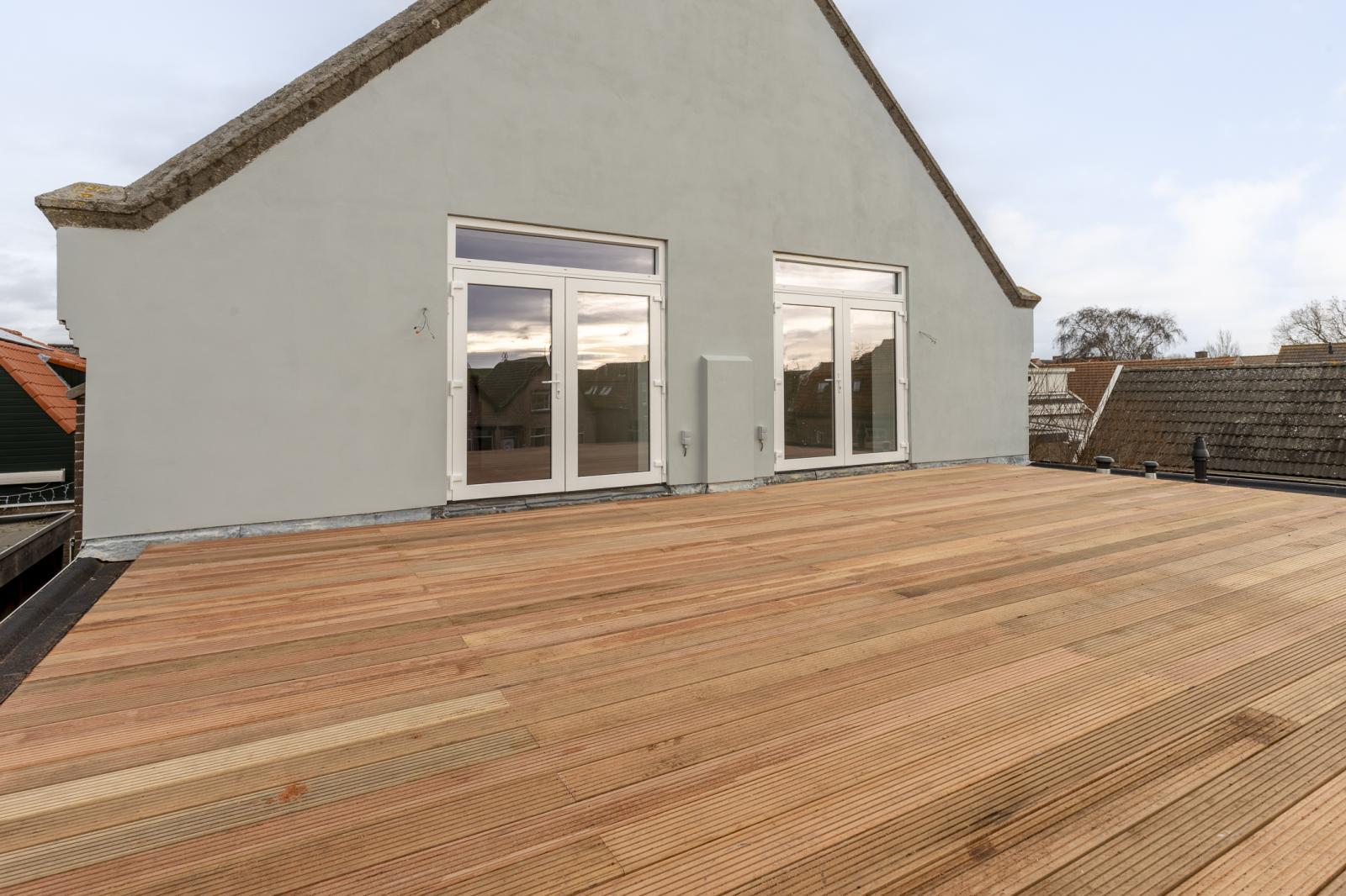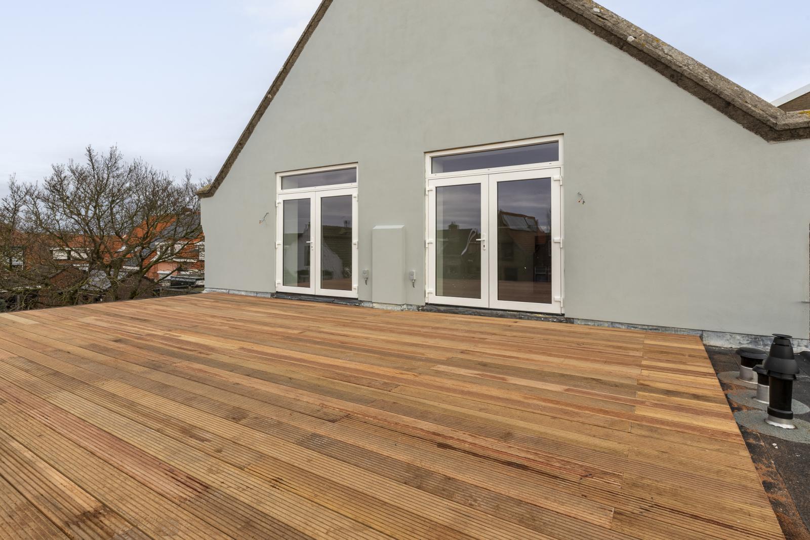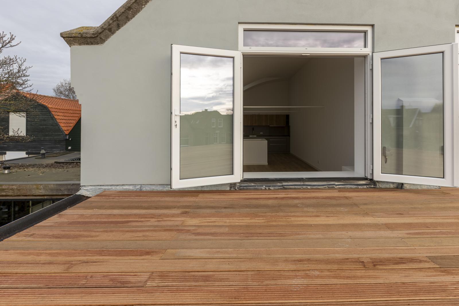 Aan de zijkant van het gebouw bevindt zich de gezamenlijke entree met toegang tot de appartementen. De indeling van dit appartement is verrassend: de slaapkamers en badkamer bevinden zich op de begane grond, terwijl de woonkamer en keuken op de verdieping zijn gesitueerd. Hierdoor geniet je van een fraai uitzicht en optimaal gebruik van het ruime dakterras.