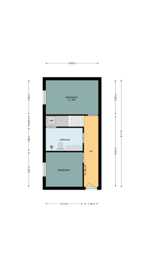 Achter de voordeur kom je in een hal met toegang tot de eerste slaapkamer van circa 9 m². Aangrenzend bevindt zich de fraai betegelde badkamer, voorzien van een douche, wastafelmeubel en toilet. Vanuit de hal leidt de trap naar de verdieping. Aan het einde van de hal bevindt zich de tweede slaapkamer van ruim 13 m².