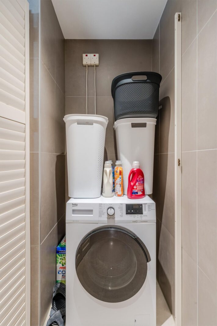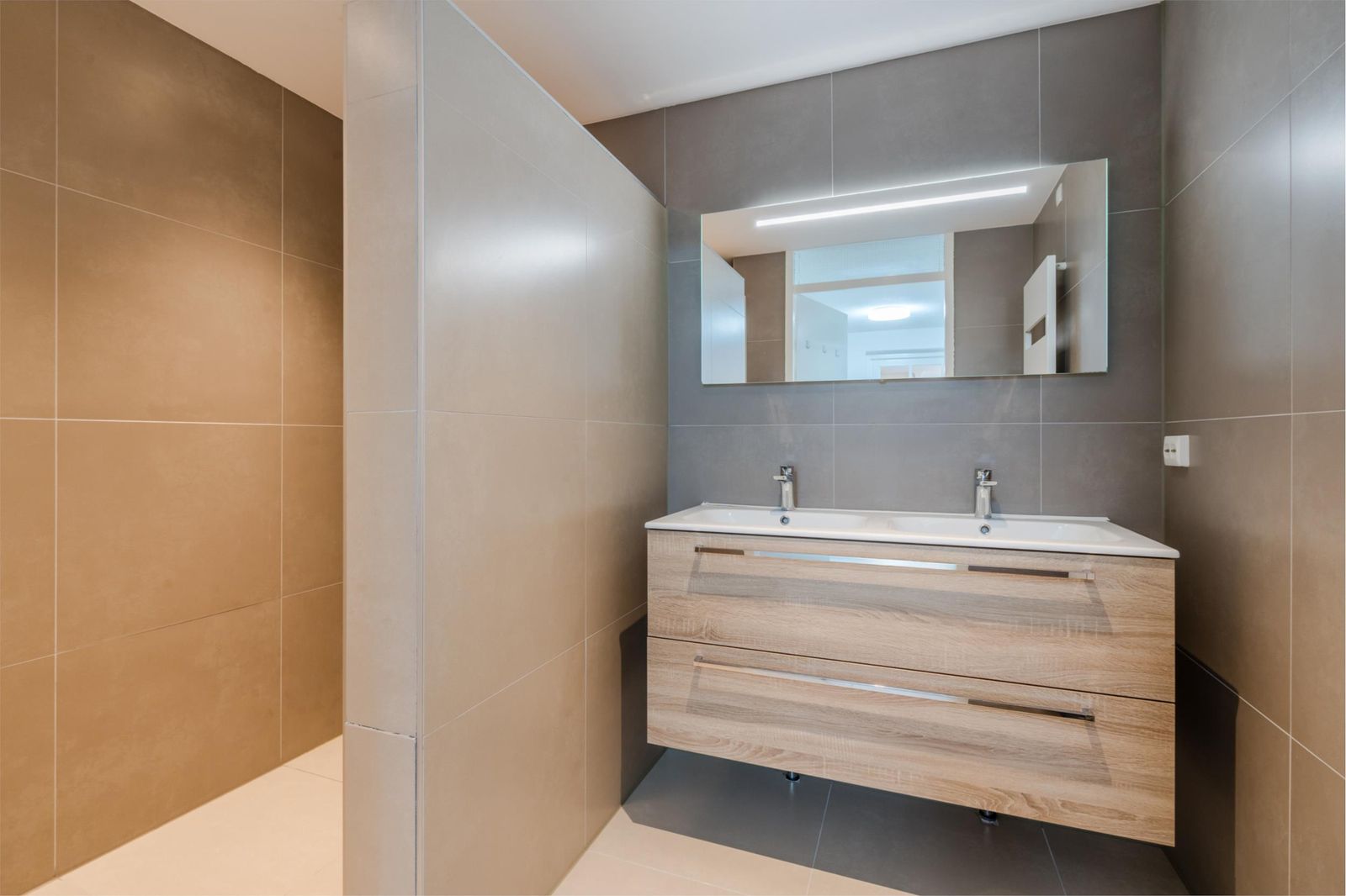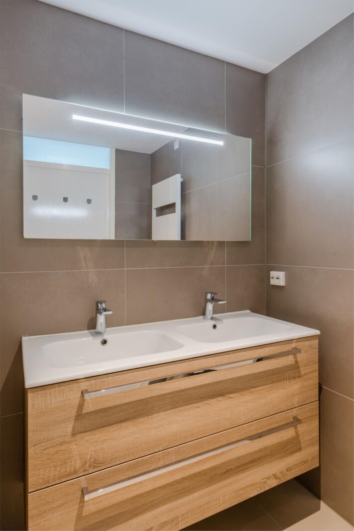 De luxe badkamer is modern ingericht met een dubbele wastafel, royale inloopdouche en aansluiting voor de wasmachine – strak, praktisch en elegant.