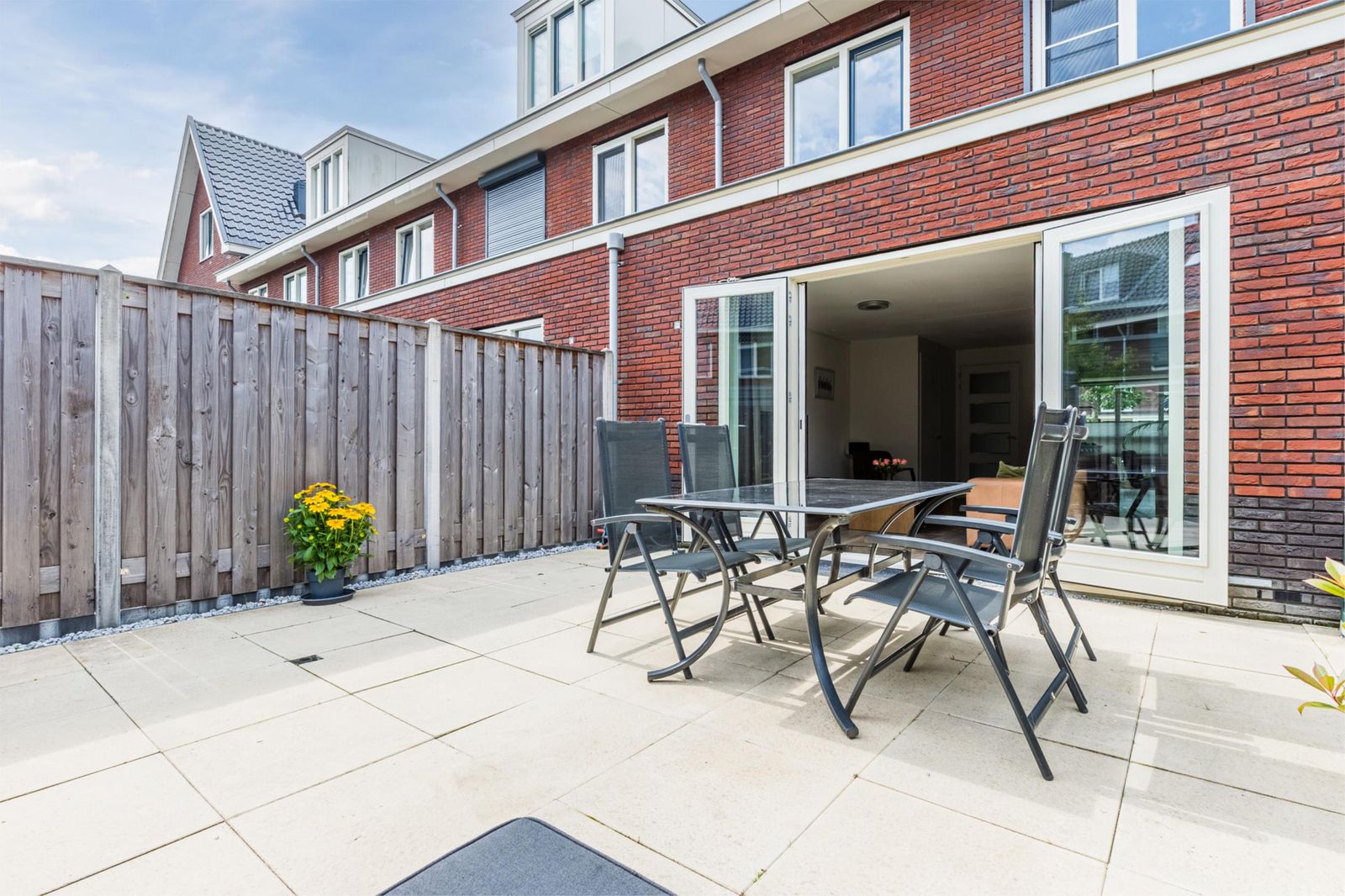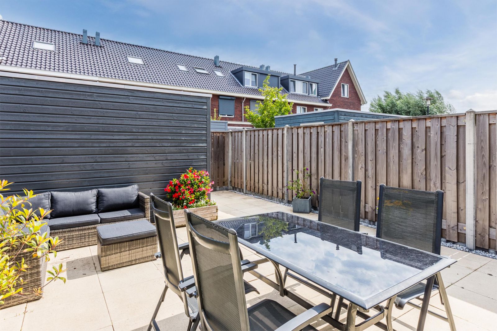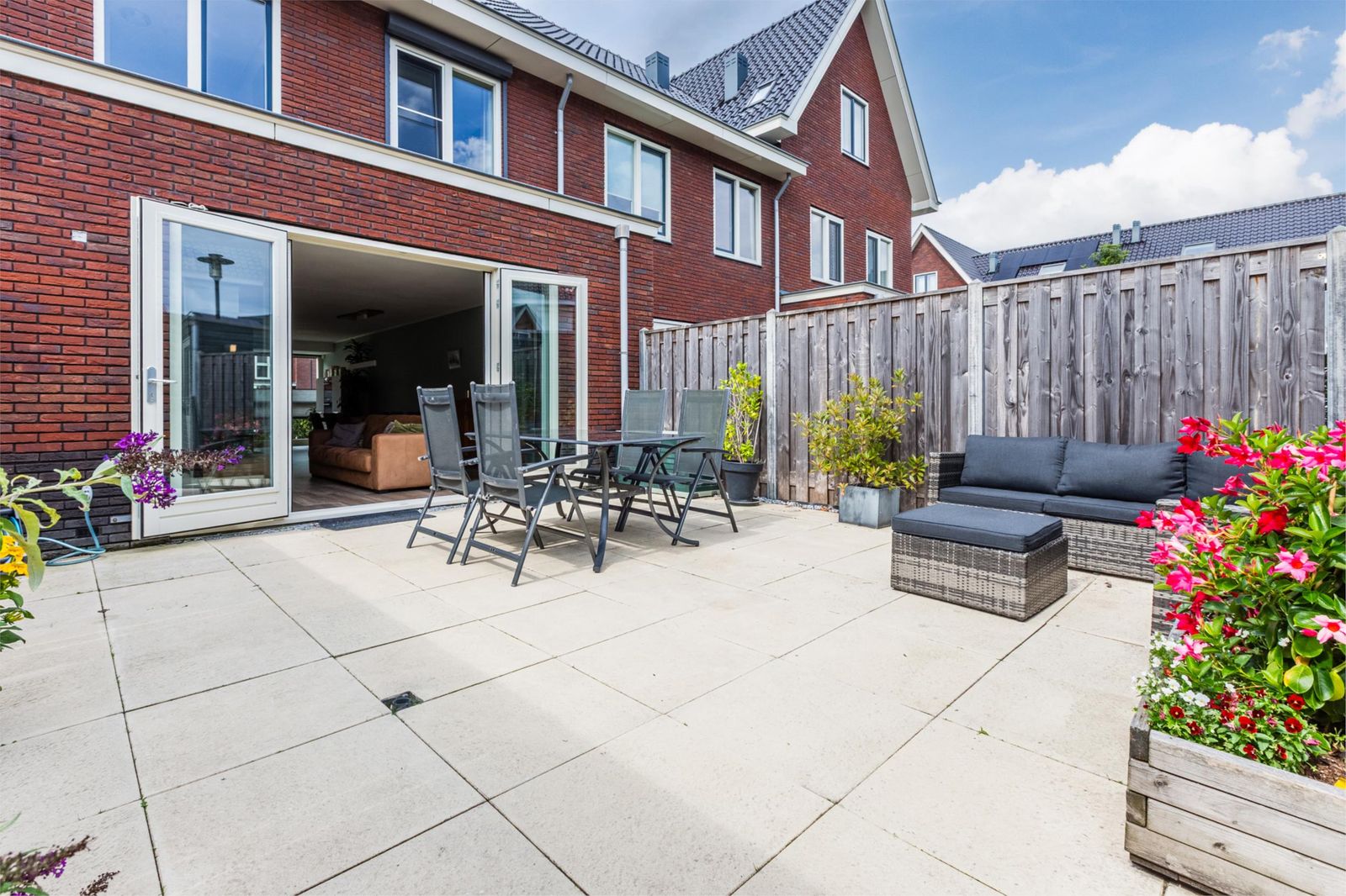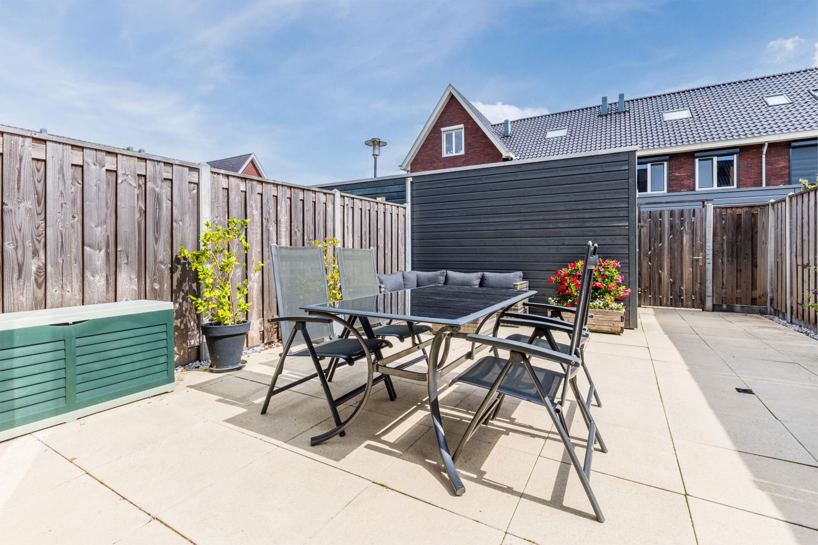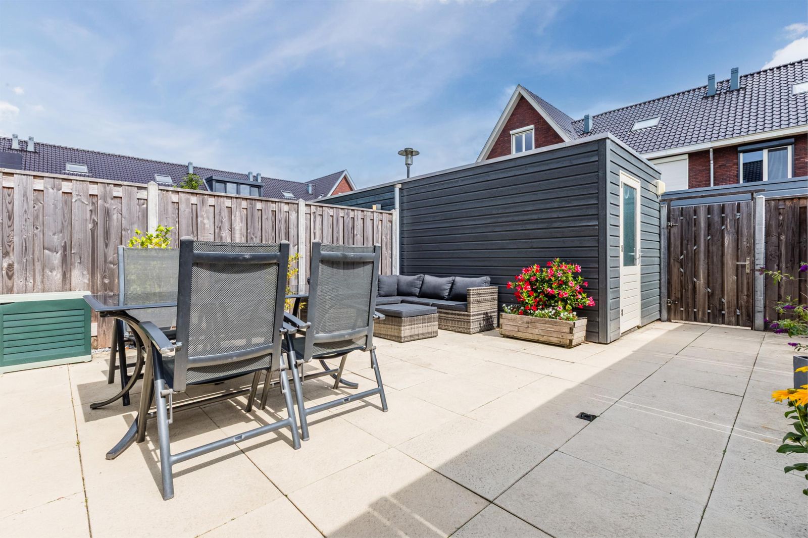De achtertuin biedt volop privacy en beschikt over een berging en achterom. Dankzij de openslaande deuren is de tuin een natuurlijk verlengstuk van de woonkamer – ideaal op zonnige dagen!