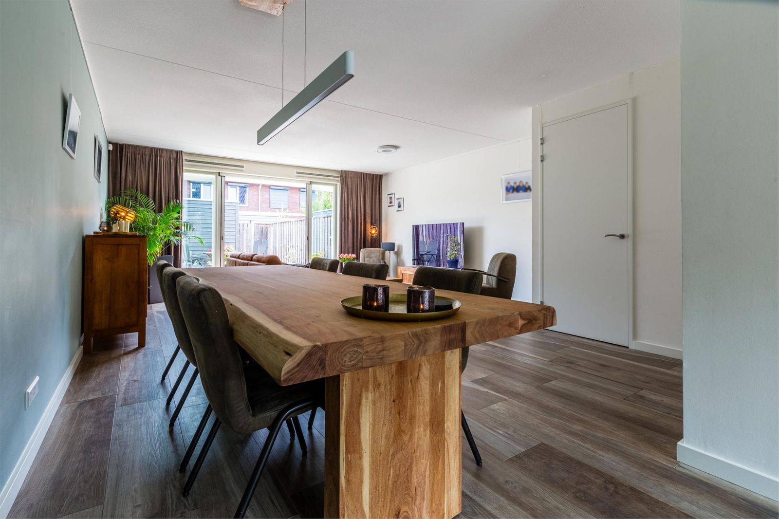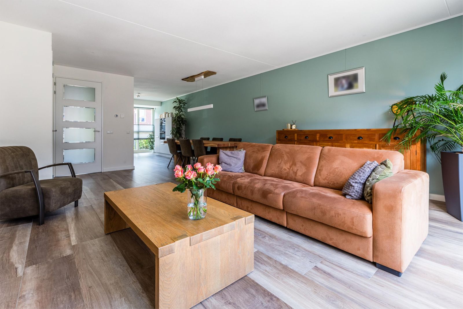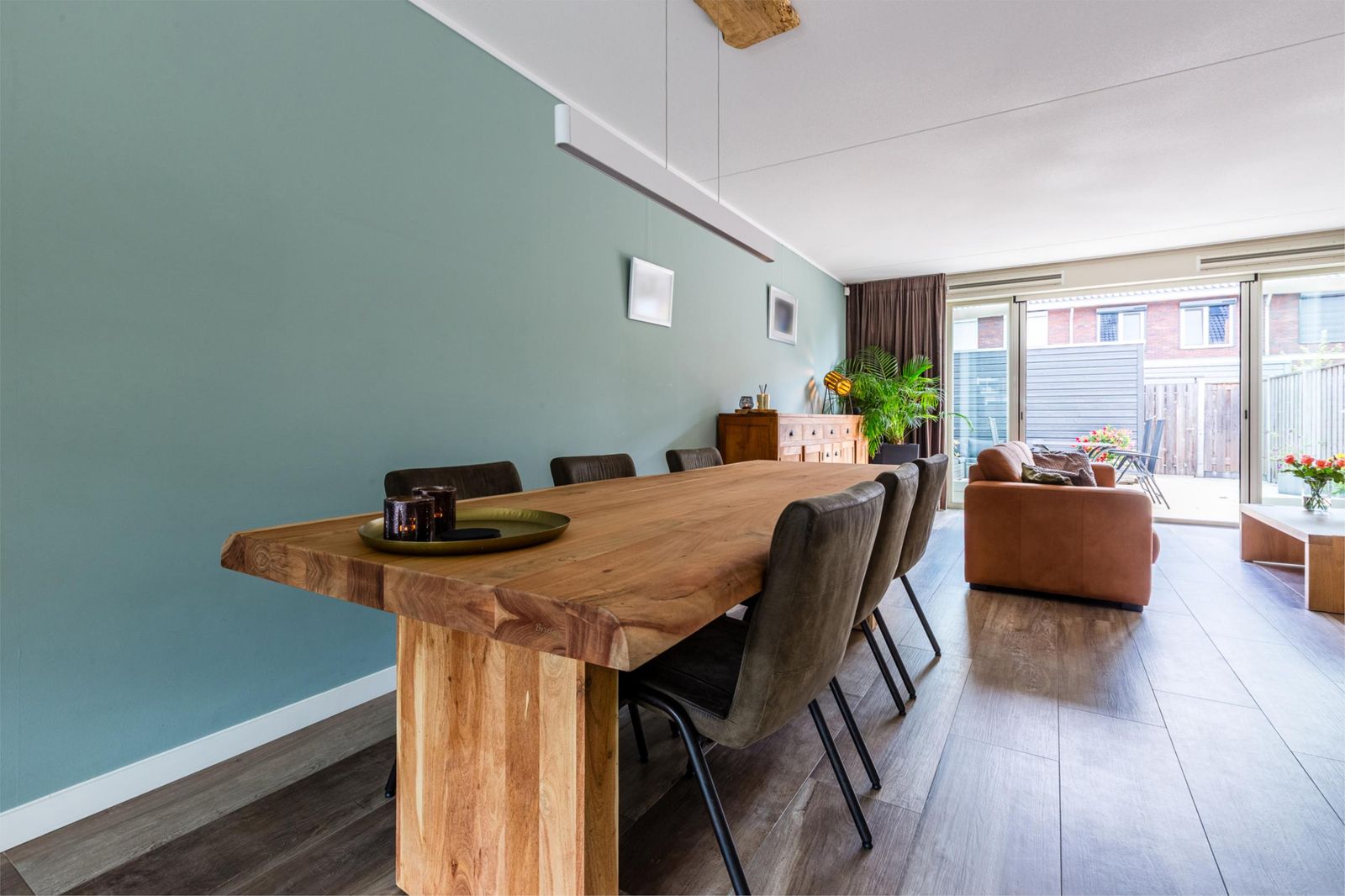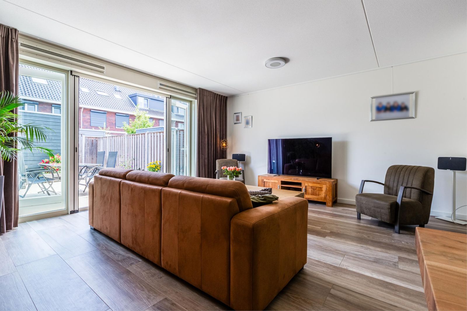 De ruime woonkamer is modern ingericht en voorzien van een fraaie houtlook plavuizenvloer met comfortabele vloerverwarming. Grote raampartijen en openslaande deuren naar de tuin zorgen voor een prettige lichtinval en een mooie verbinding tussen binnen en buiten.