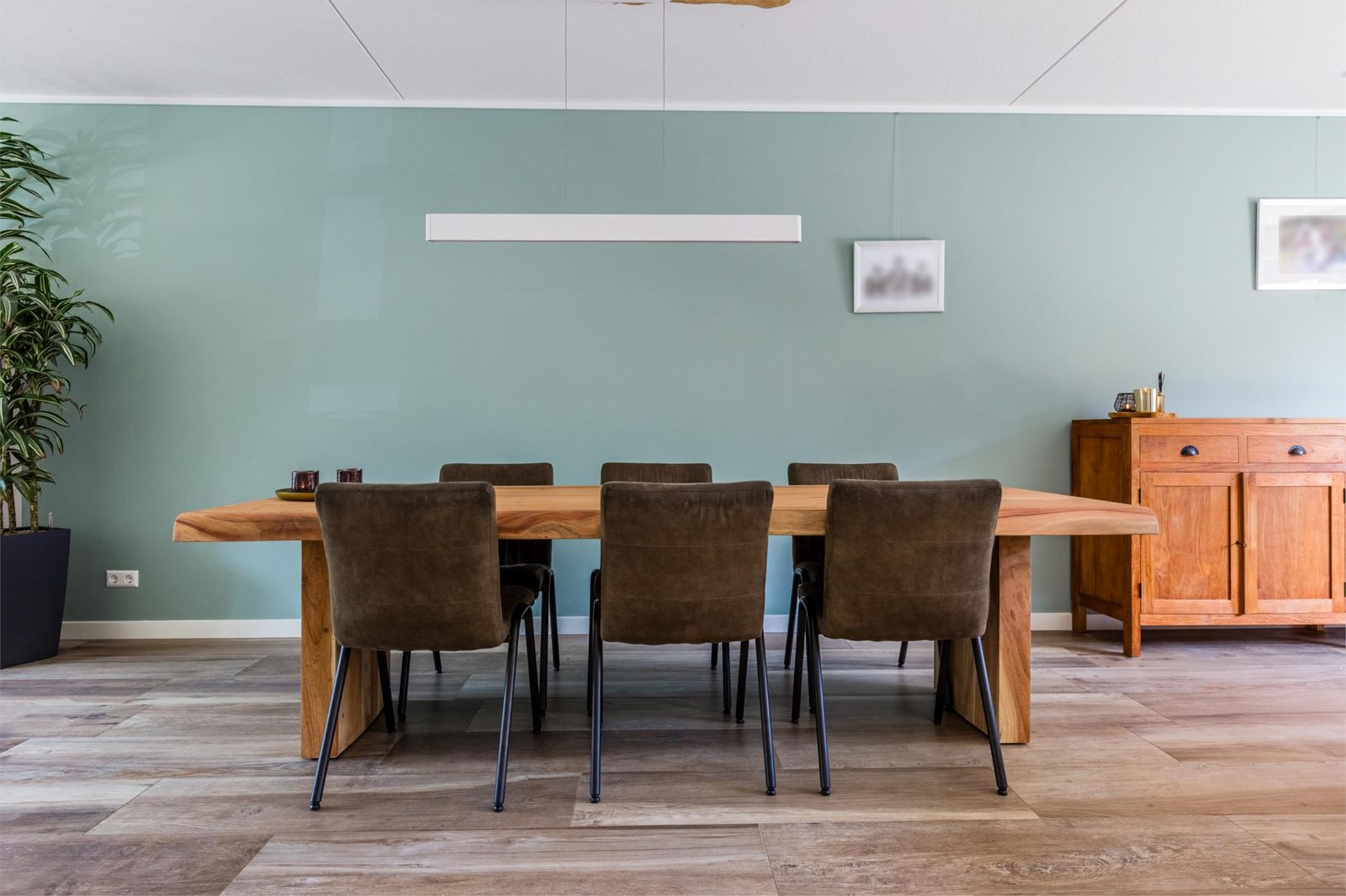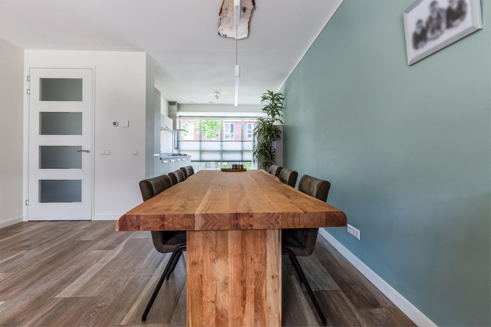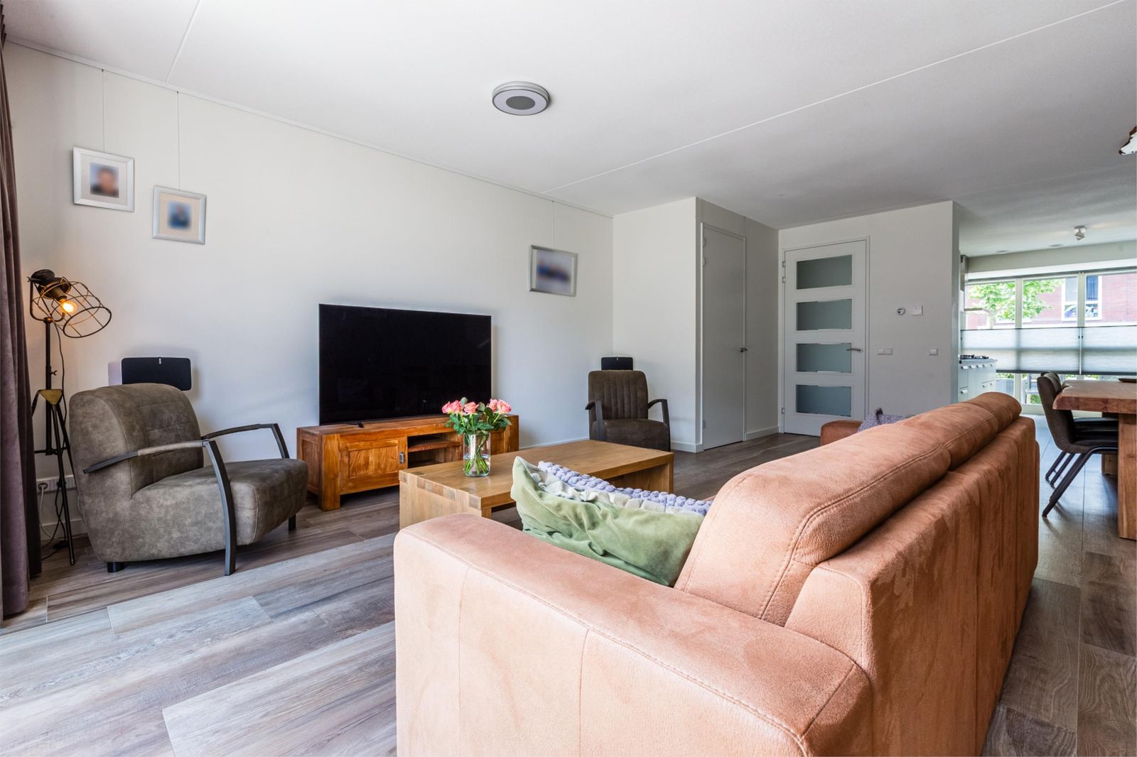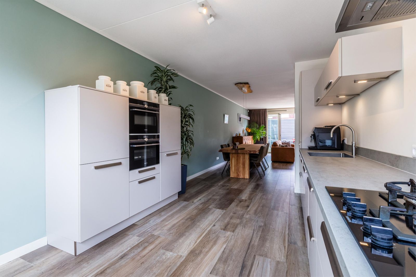 De ruime woonkamer is modern ingericht en voorzien van een fraaie houtlook plavuizenvloer met comfortabele vloerverwarming. Grote raampartijen en openslaande deuren naar de tuin zorgen voor een prettige lichtinval en een mooie verbinding tussen binnen en buiten.