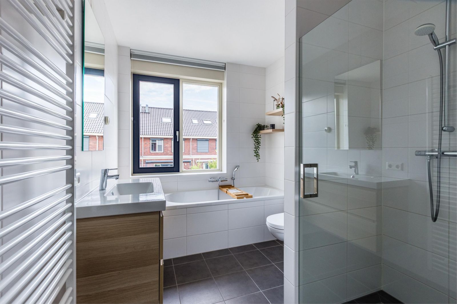 •Badkamer met inloopdouche, ligbad en wastafelmeubel