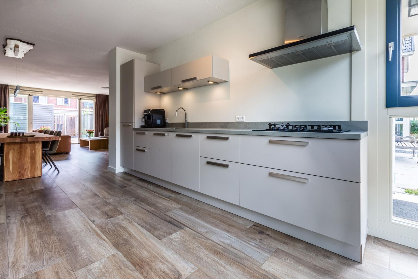 Aan de voorzijde bevindt zich de luxe open keuken, compleet met hoogwaardige apparatuur: een combi-stoomoven, combi-oven, Quooker, grote koelkast en aparte vriezer. Dankzij de grote ramen is de keuken heerlijk licht.