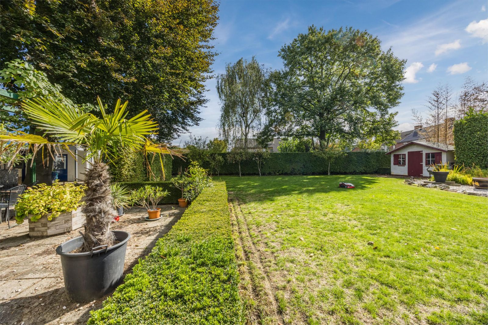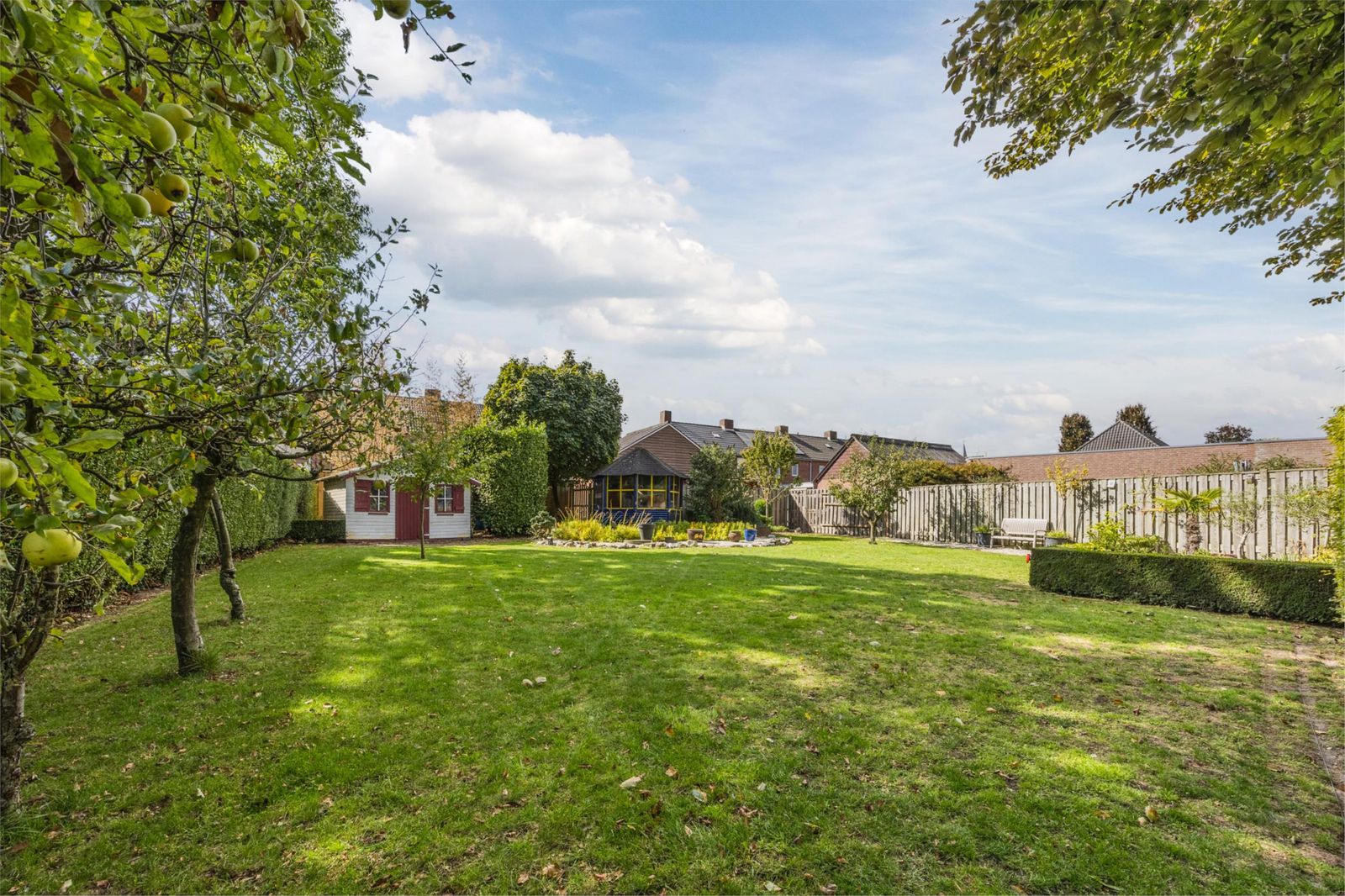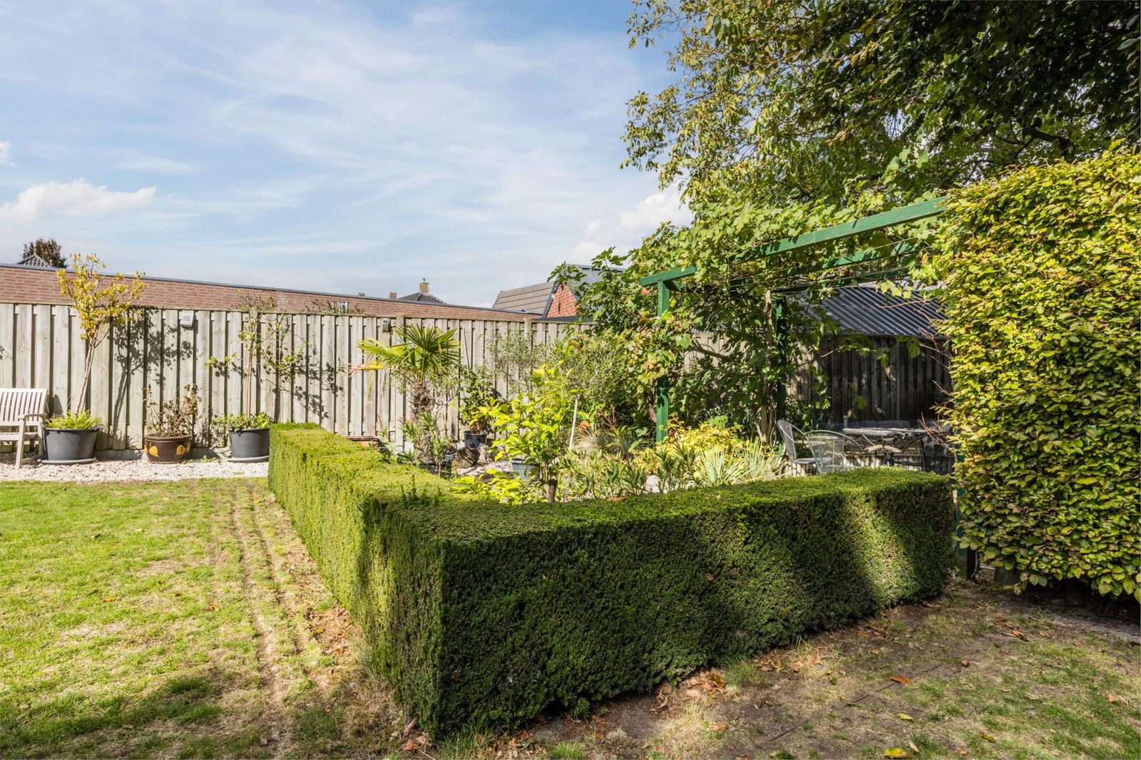 De achtertuin ligt pal op het zuiden en biedt volop privacy en natuurbeleving. Je vindt hier diverse fruitbomen (appel, peer, kers en pruim), druivenranken, een grote vijgenboom, een notenboom en een eigen puls voor de beregening. Onder de imposante beuk is een verhoogd terras gerealiseerd. Helemaal achter in de tuin bevinden zich een tuinhuisje, een prieeltje en een grote vijver: een idyllische plek om te ontspannen.