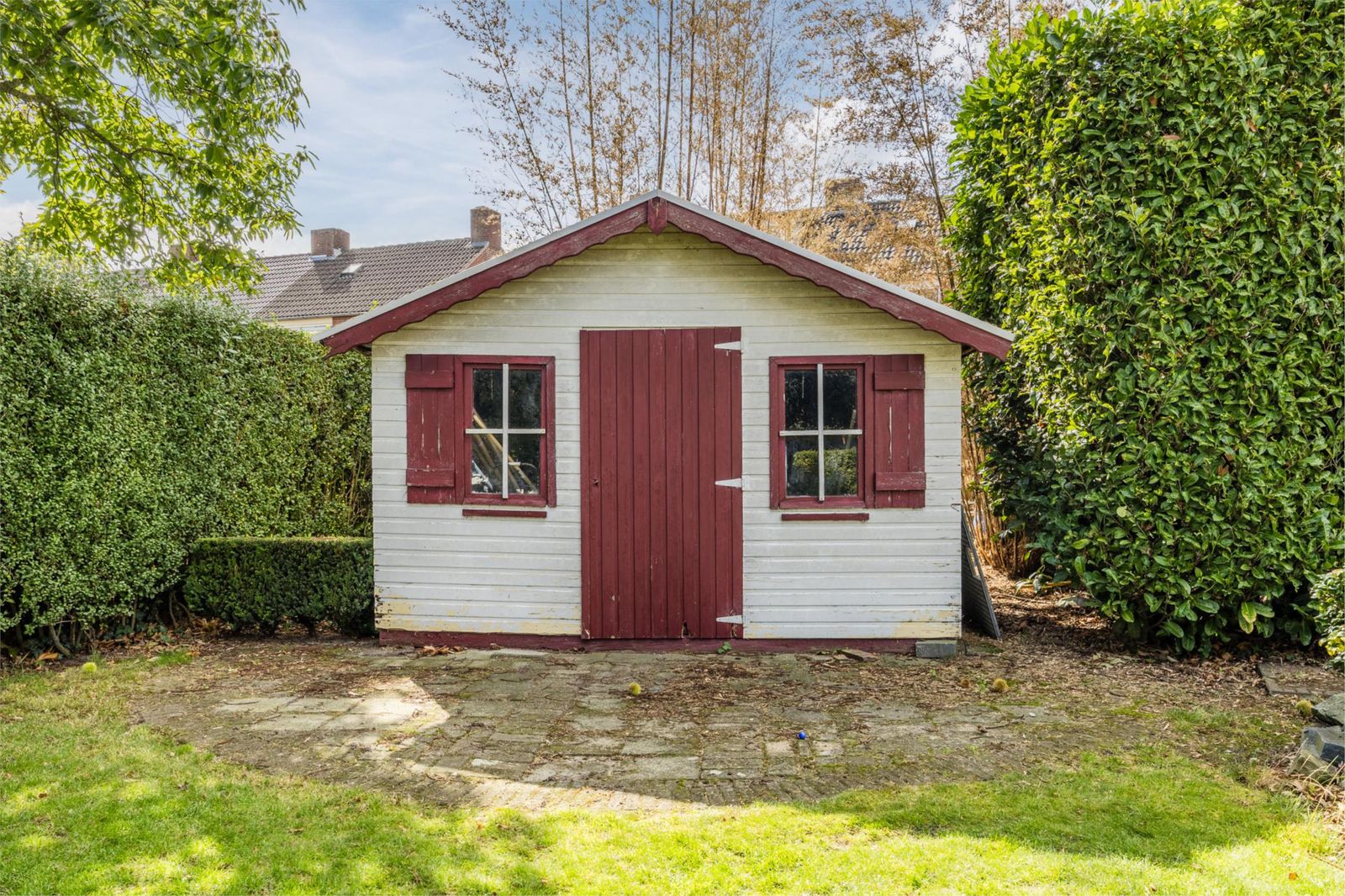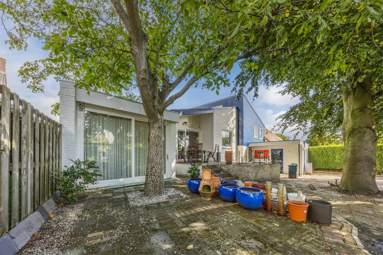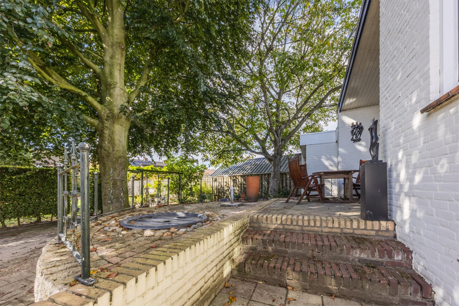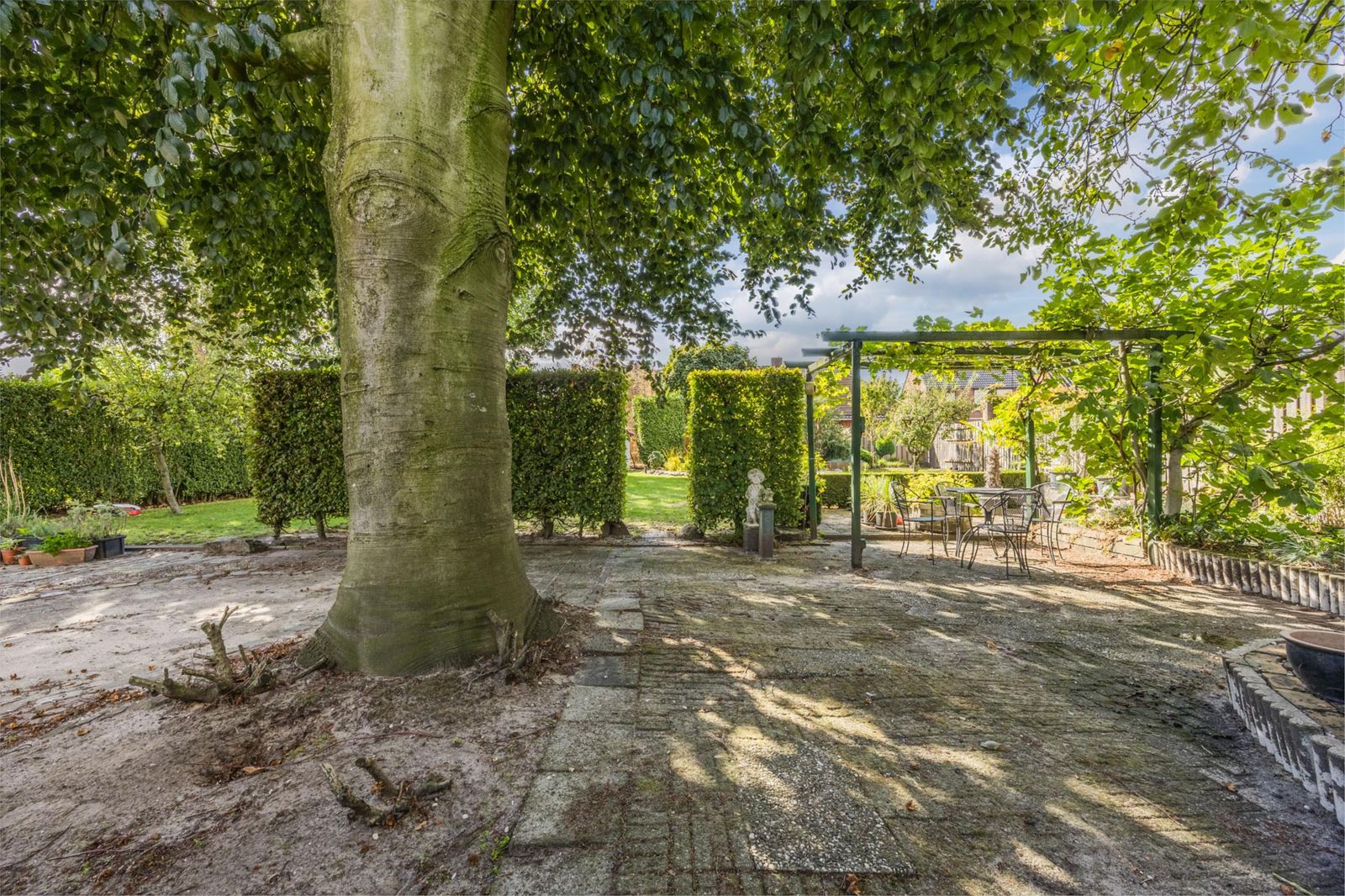 De achtertuin ligt pal op het zuiden en biedt volop privacy en natuurbeleving. Je vindt hier diverse fruitbomen (appel, peer, kers en pruim), druivenranken, een grote vijgenboom, een notenboom en een eigen puls voor de beregening. Onder de imposante beuk is een verhoogd terras gerealiseerd. Helemaal achter in de tuin bevinden zich een tuinhuisje, een prieeltje en een grote vijver: een idyllische plek om te ontspannen.