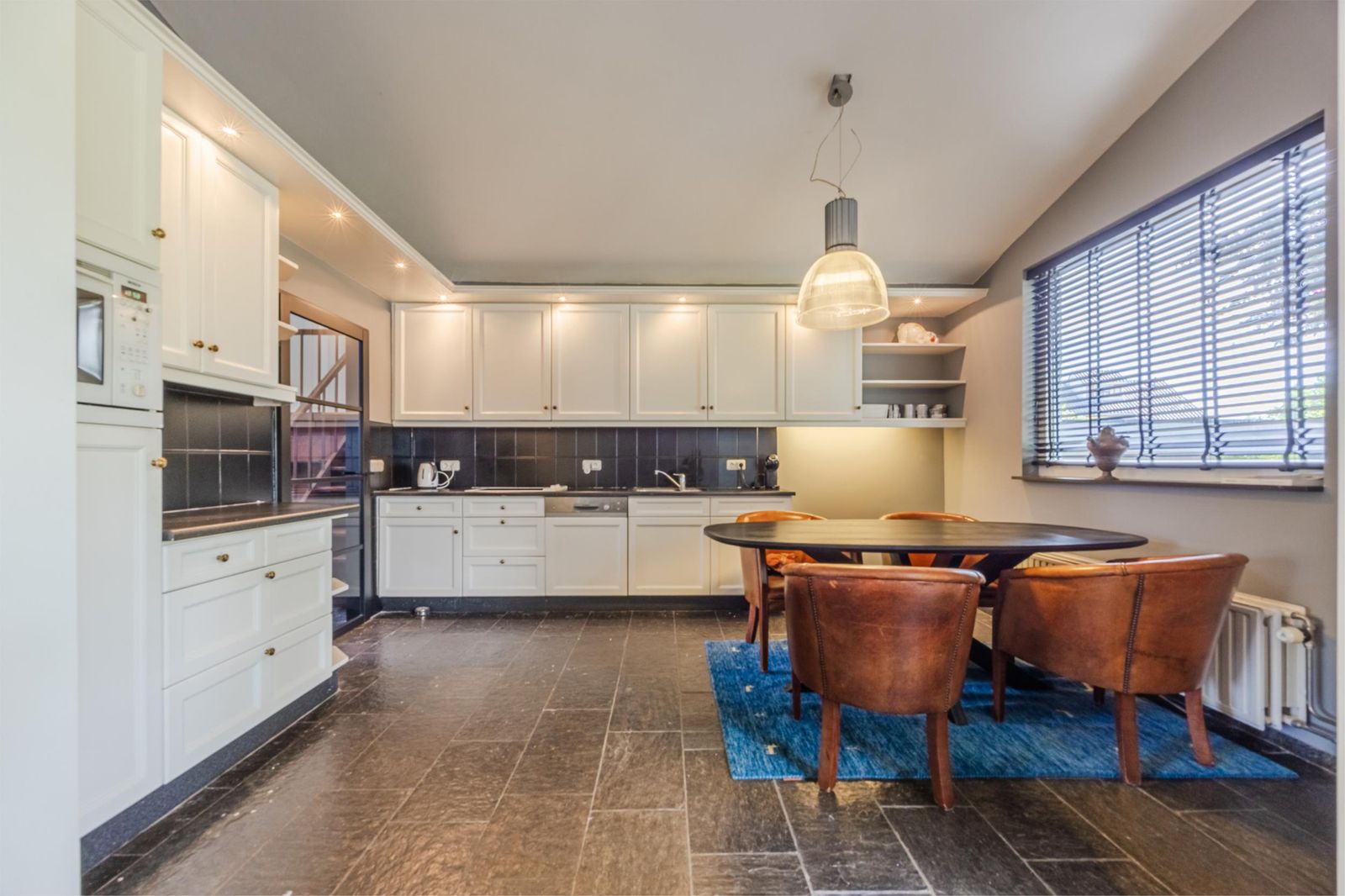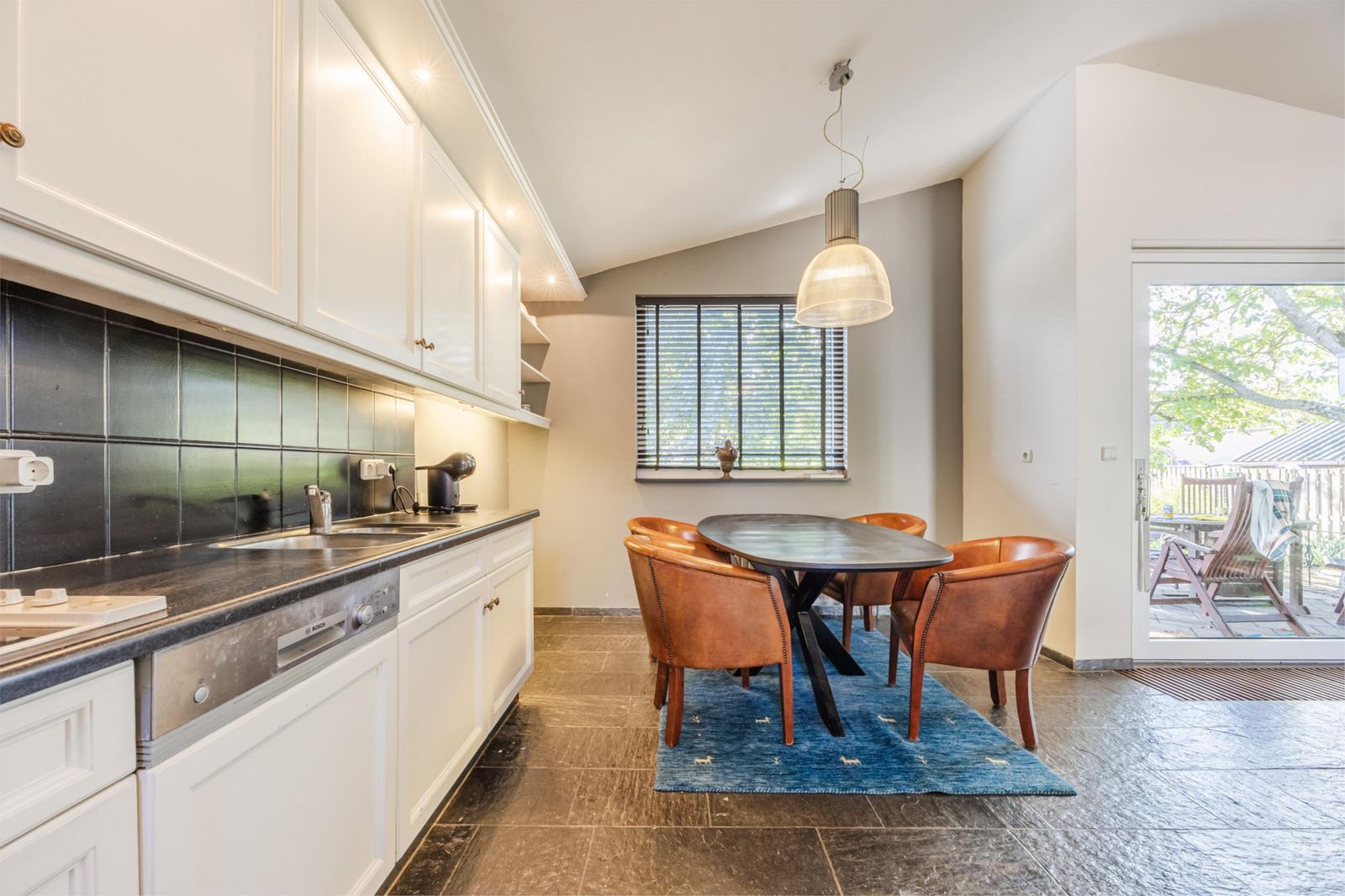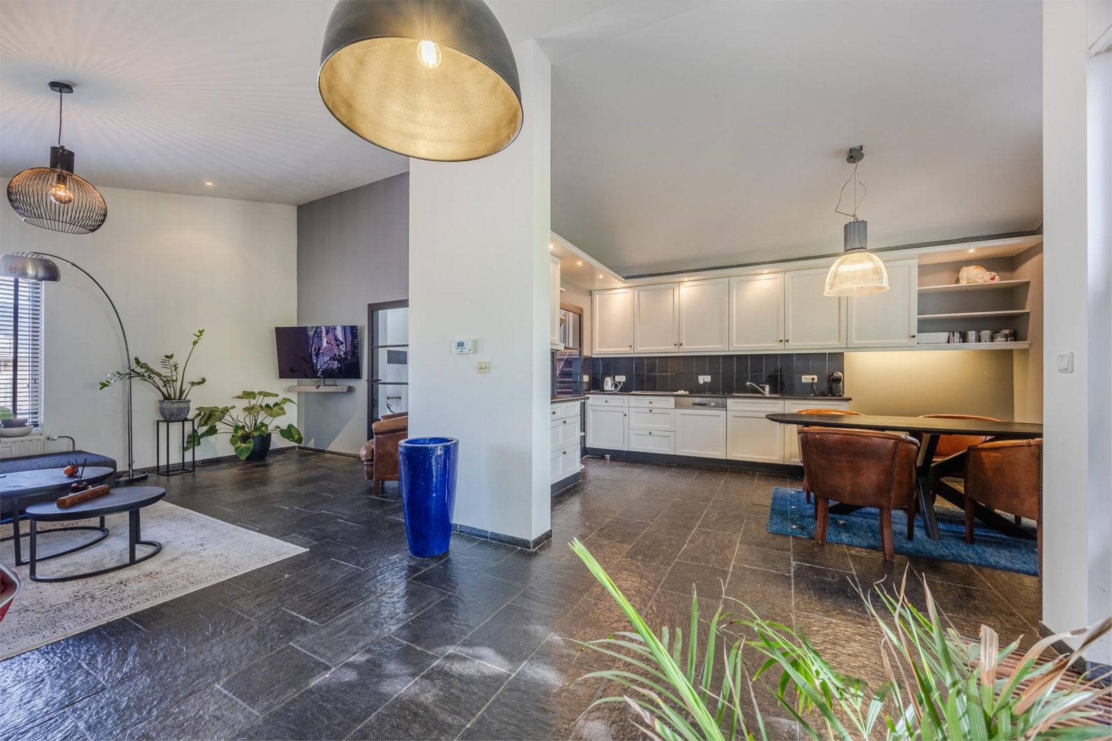 Via de hal bereik je het woongedeelte. De woonkamer met open keuken heeft een natuurstenen vloer met vloerverwarming. De keuken is uitgerust met moderne inbouwapparatuur zoals een inductiekookplaat, koelkast en vaatwasser. Via de grote schuifpui stap je zo het terras op, met een prachtig uitzicht over de diepe tuin.