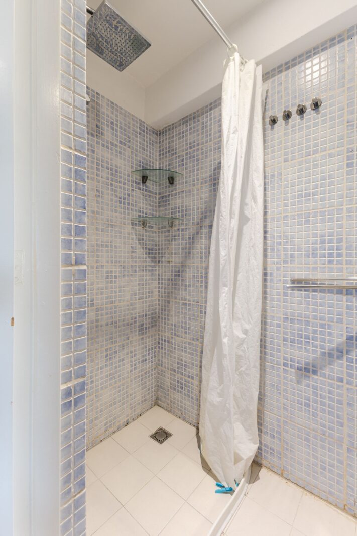 De badkamer is volledig betegeld en uitgerust met een douchehoek met regendouche, een wastafelmeubel en een spiegelkast.