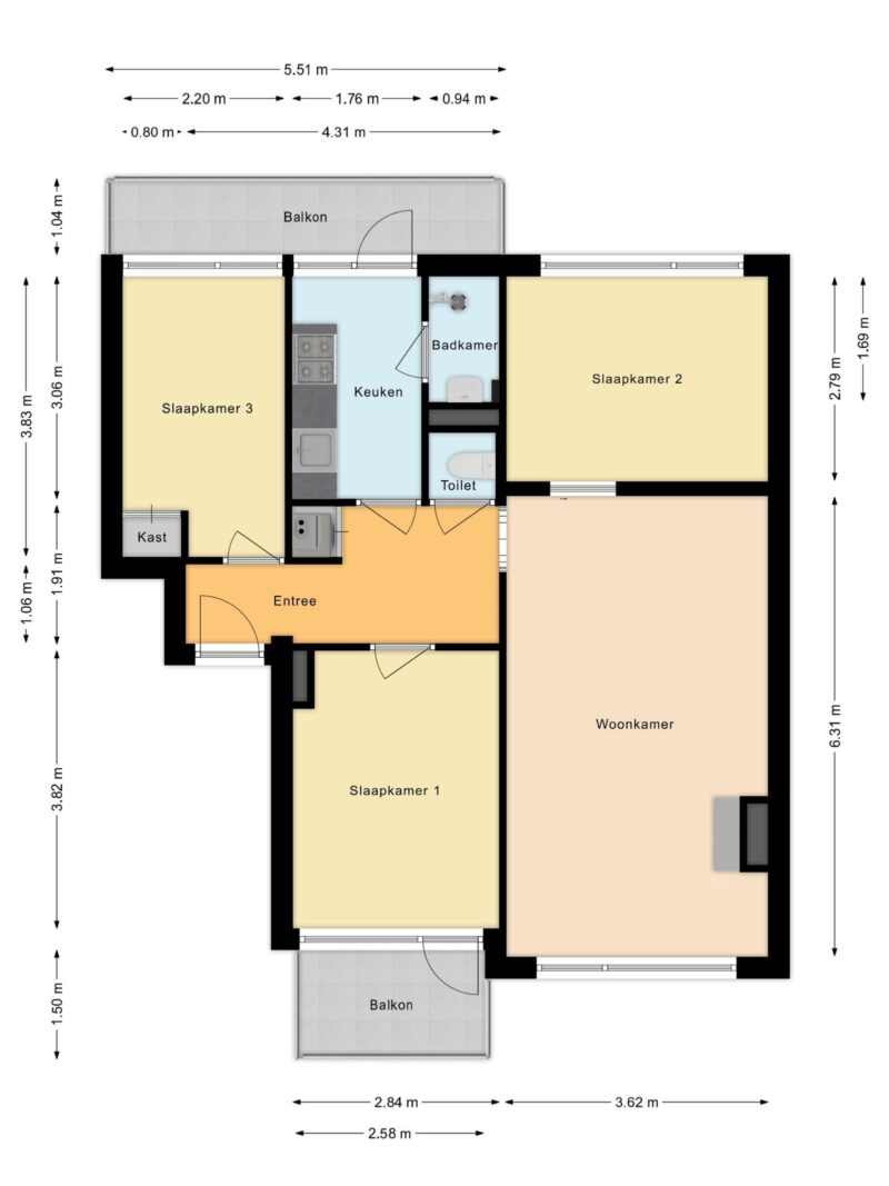 Mooi 4-kamer appartement met 2 balkons en 3 slaapkamers.