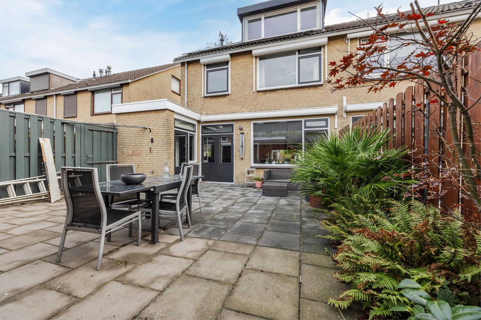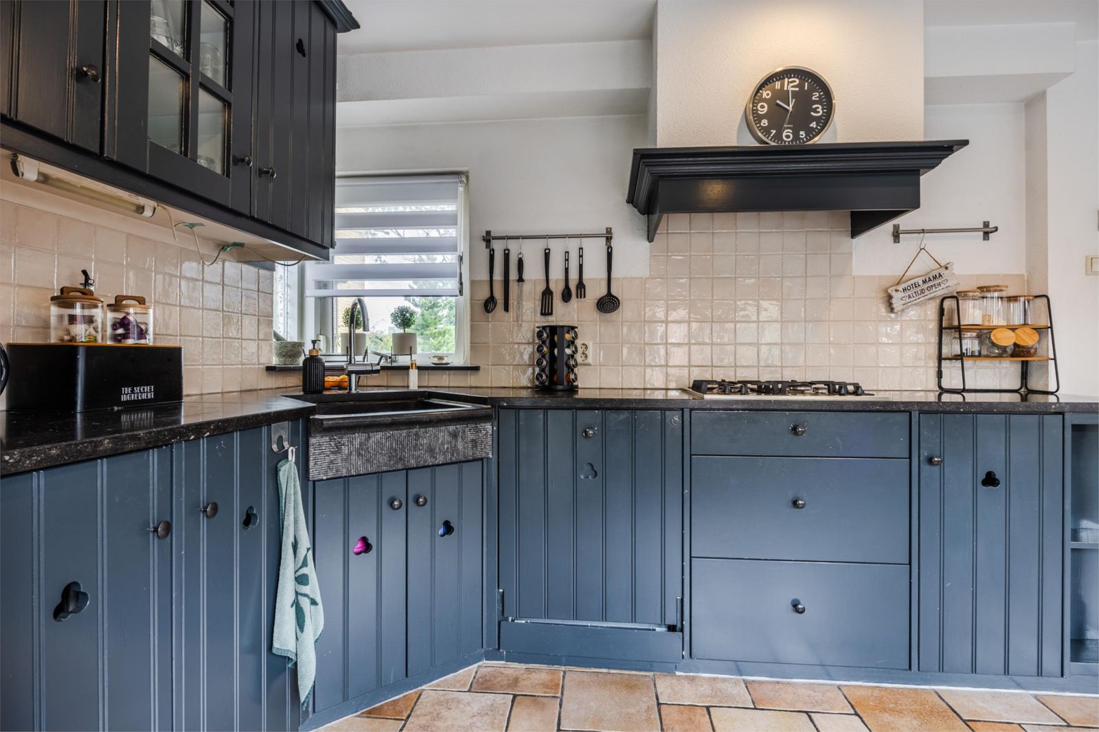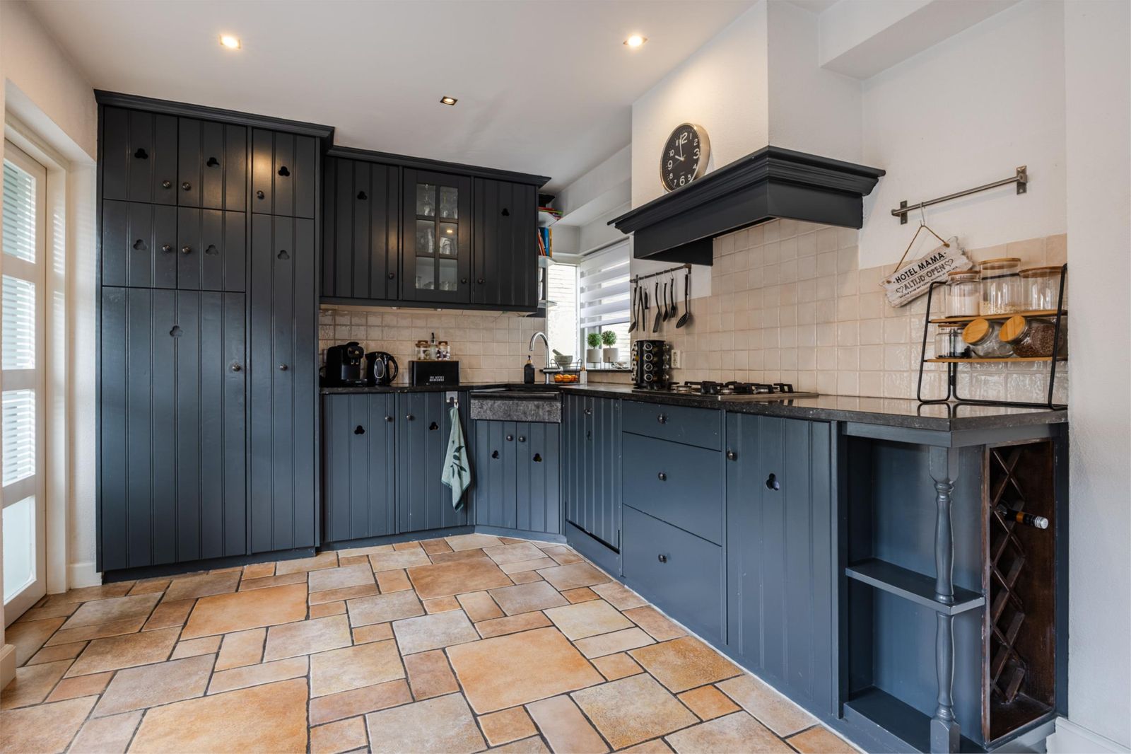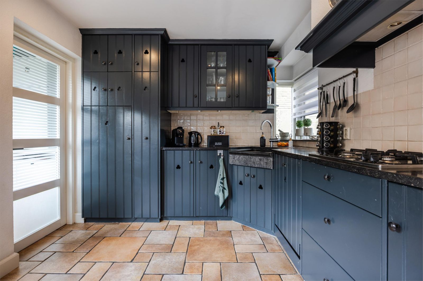 De woning heeft een hardhouten open keuken met een granieten aanrechtblad en openslaande deuren naar de ruime zonnige tuin met daarin een vaste ruime schuur en een fietsenberging. In de bijkeuken bevindt zich nog extra kastruimte. De riante woonkamer is voorzien van een plavuizen vloer met vloerverwarming en losse radiatoren.
