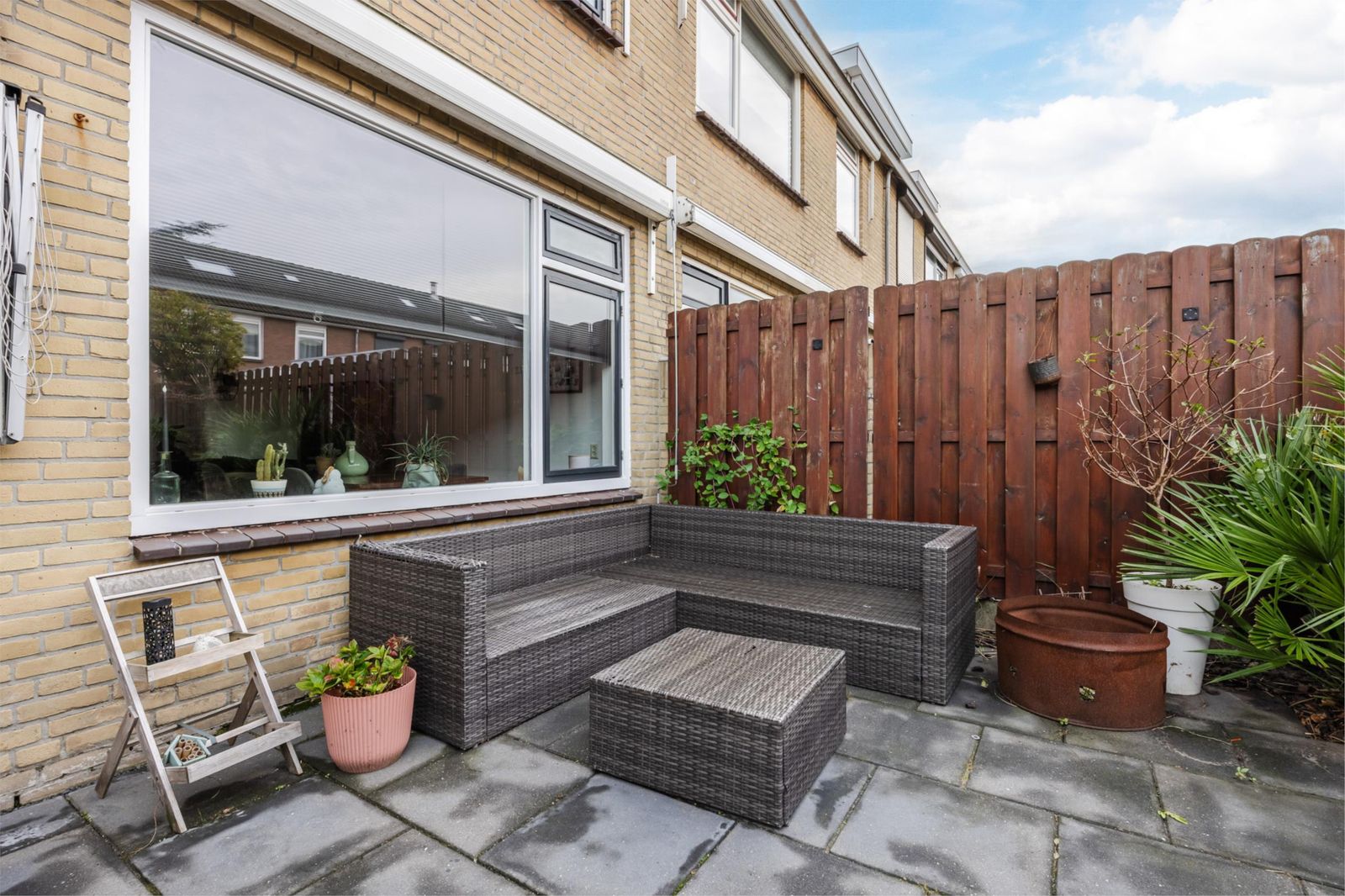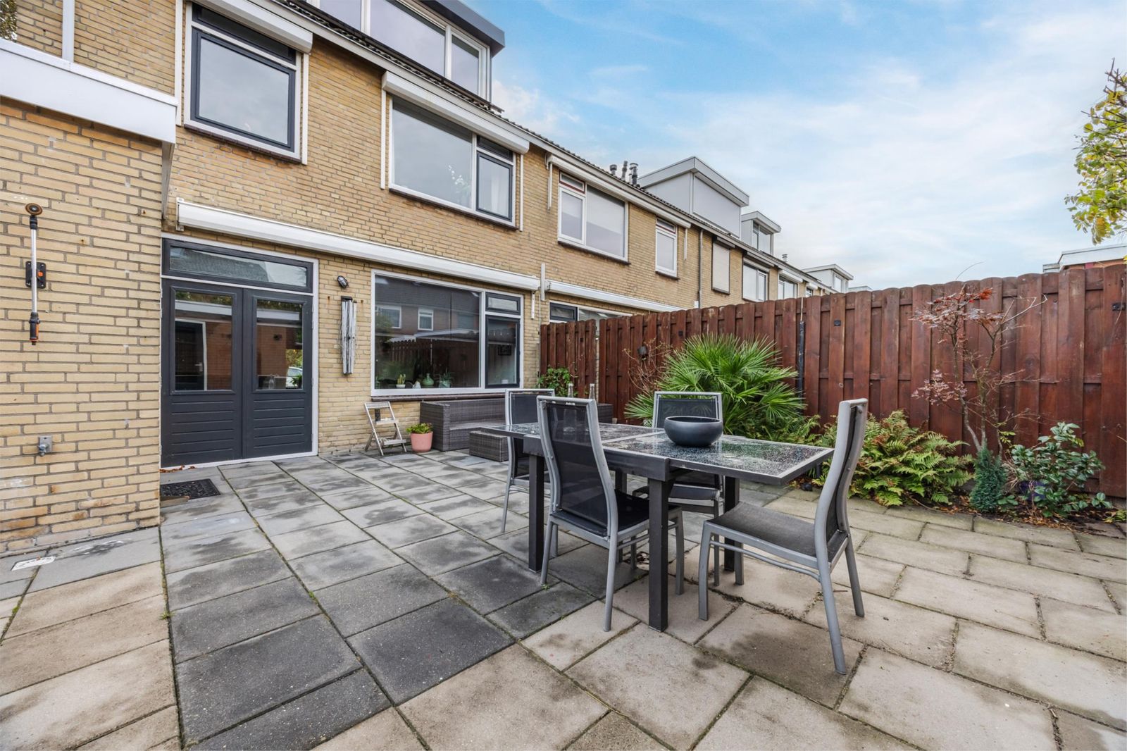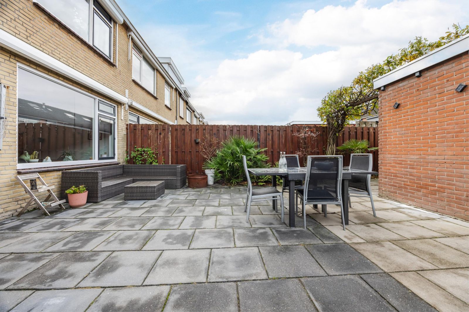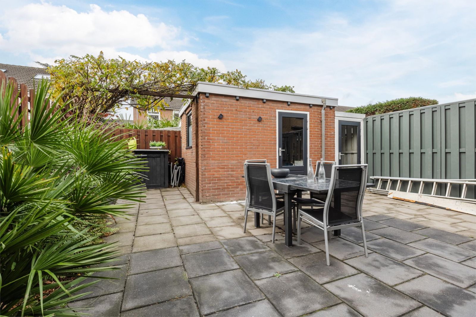 De woning heeft een hardhouten open keuken met een granieten aanrechtblad en openslaande deuren naar de ruime zonnige tuin met daarin een vaste ruime schuur en een fietsenberging. In de bijkeuken bevindt zich nog extra kastruimte. De riante woonkamer is voorzien van een plavuizen vloer met vloerverwarming en losse radiatoren.