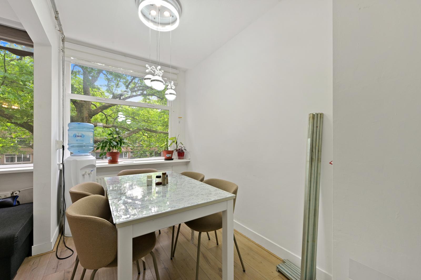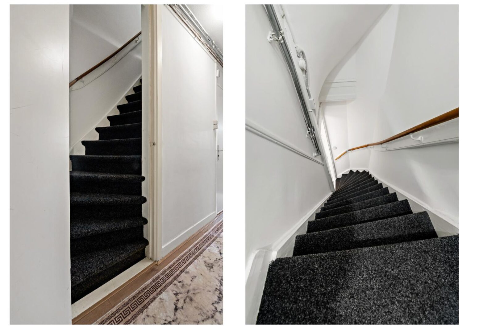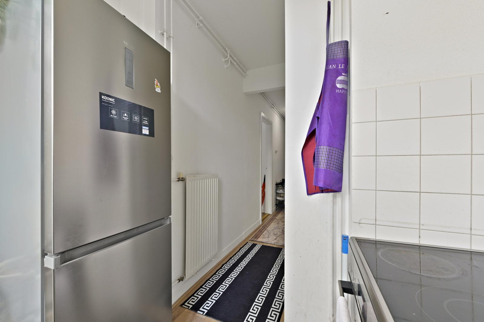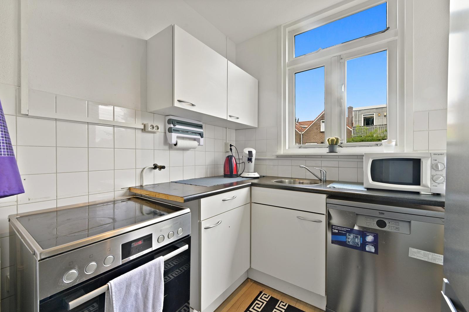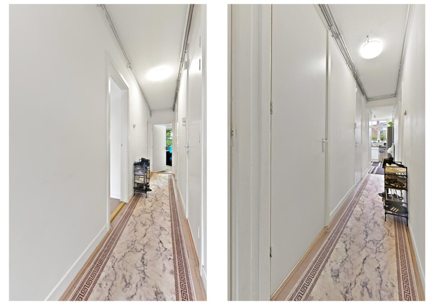 Via het trappenhuis bereik je de voordeur. Aan de voorzijde van de woning vind je een royale en lichte woonkamer, die door het samenvoegen van een voormalige zijkamer extra ruim aanvoelt. Vanuit de hal heb je toegang tot een ruime tussenkamer, een achterkamer met balkon en de keuken, voorzien van een hoekopgestelde keukenopstelling. Deze verdieping heeft ook een apart toilet.