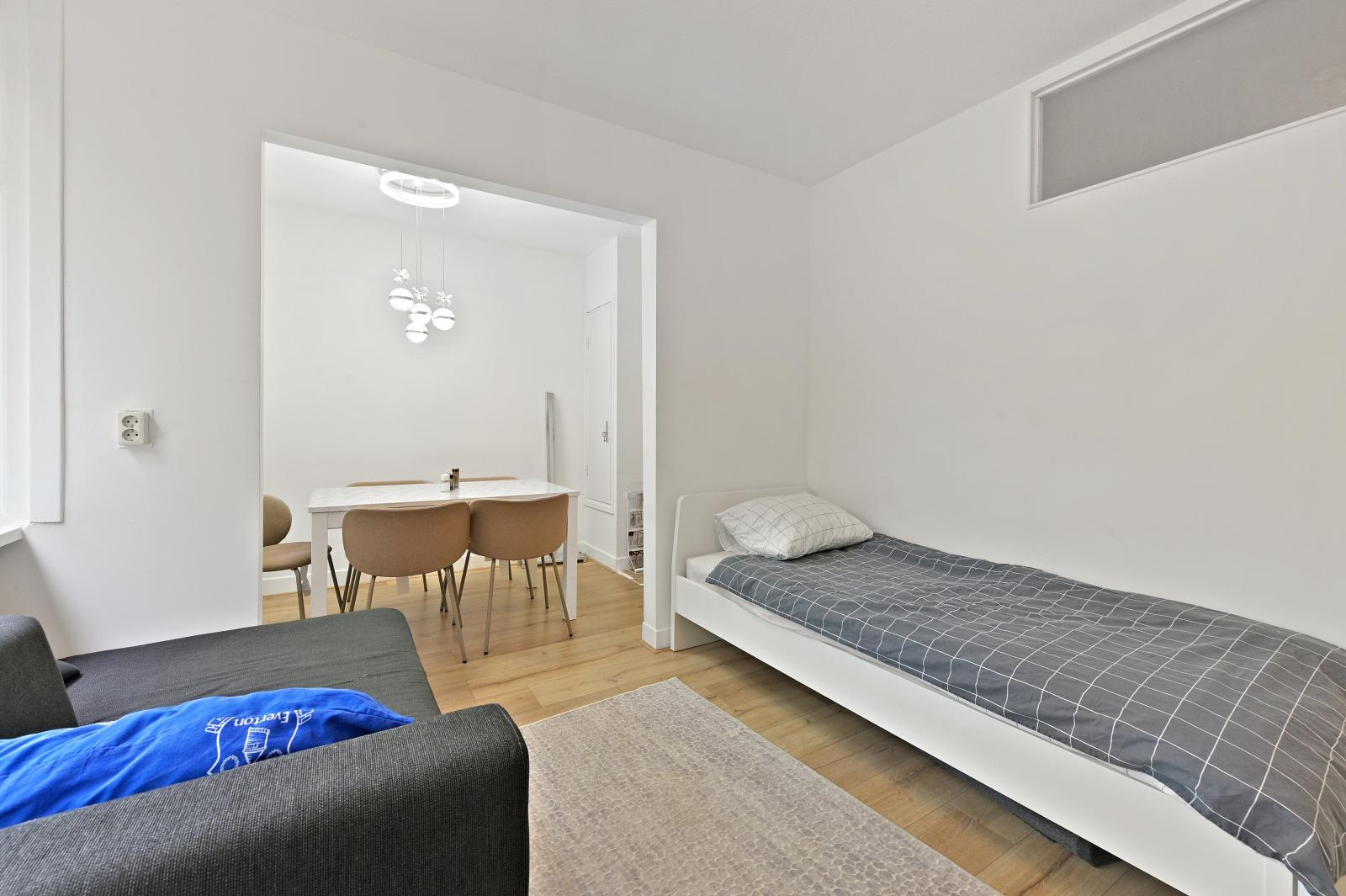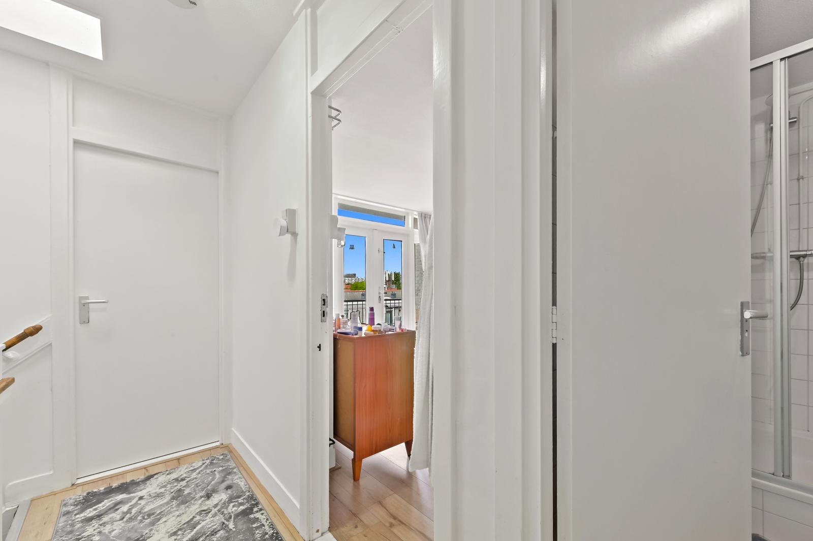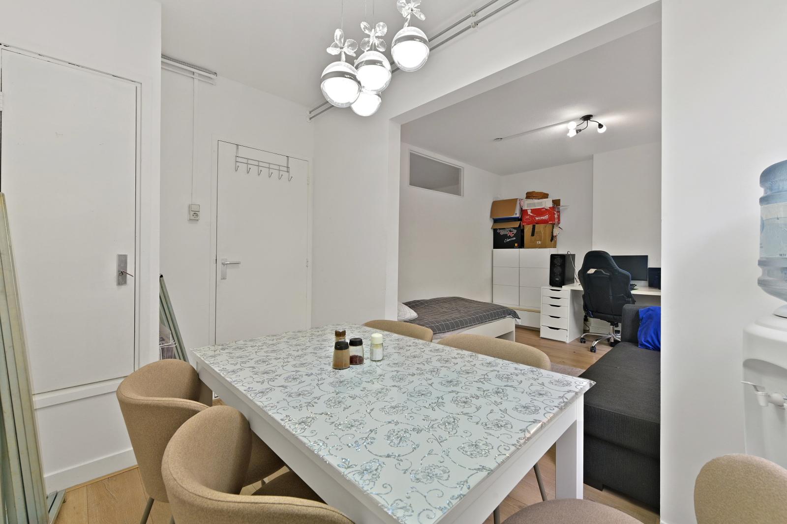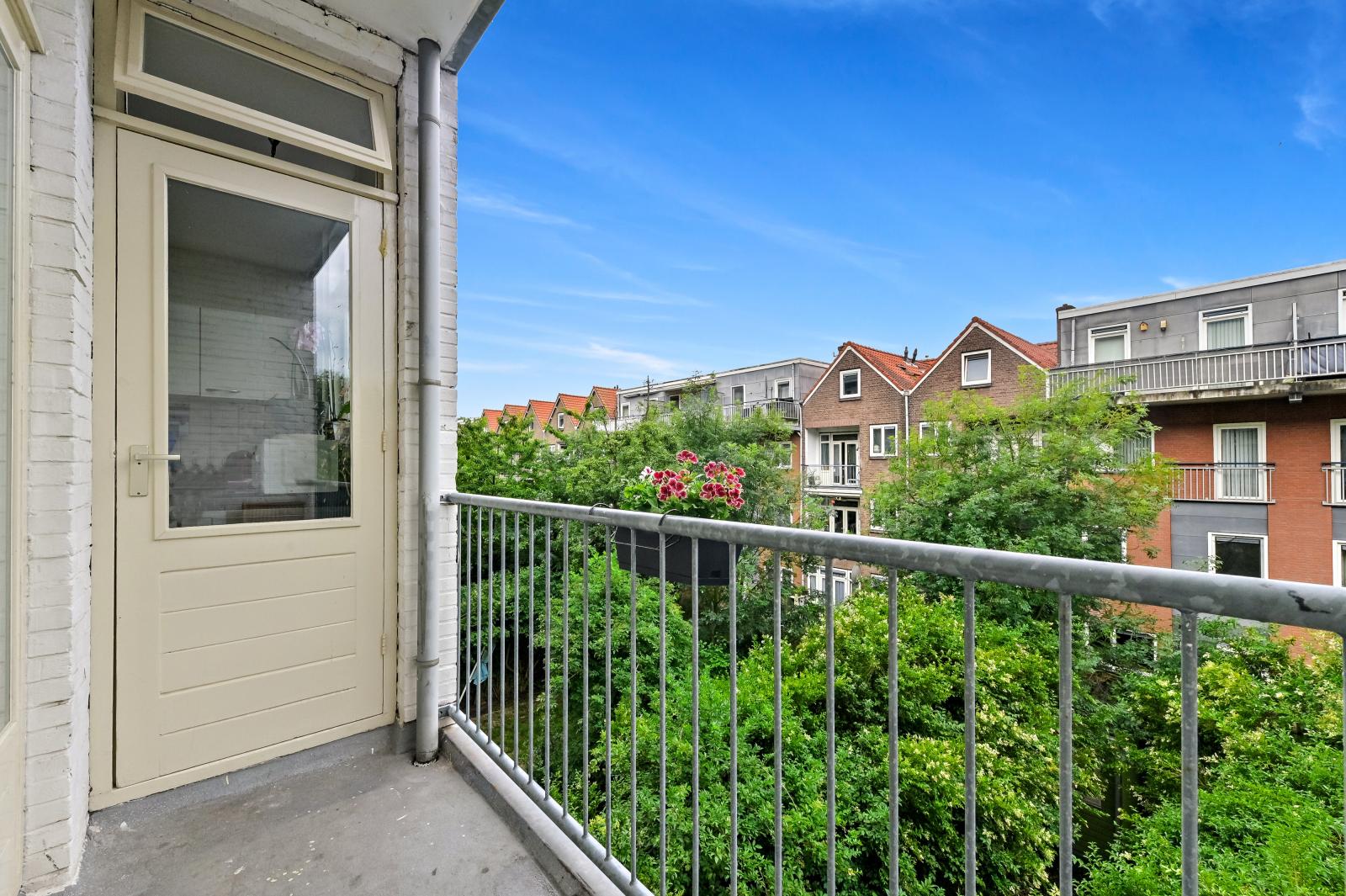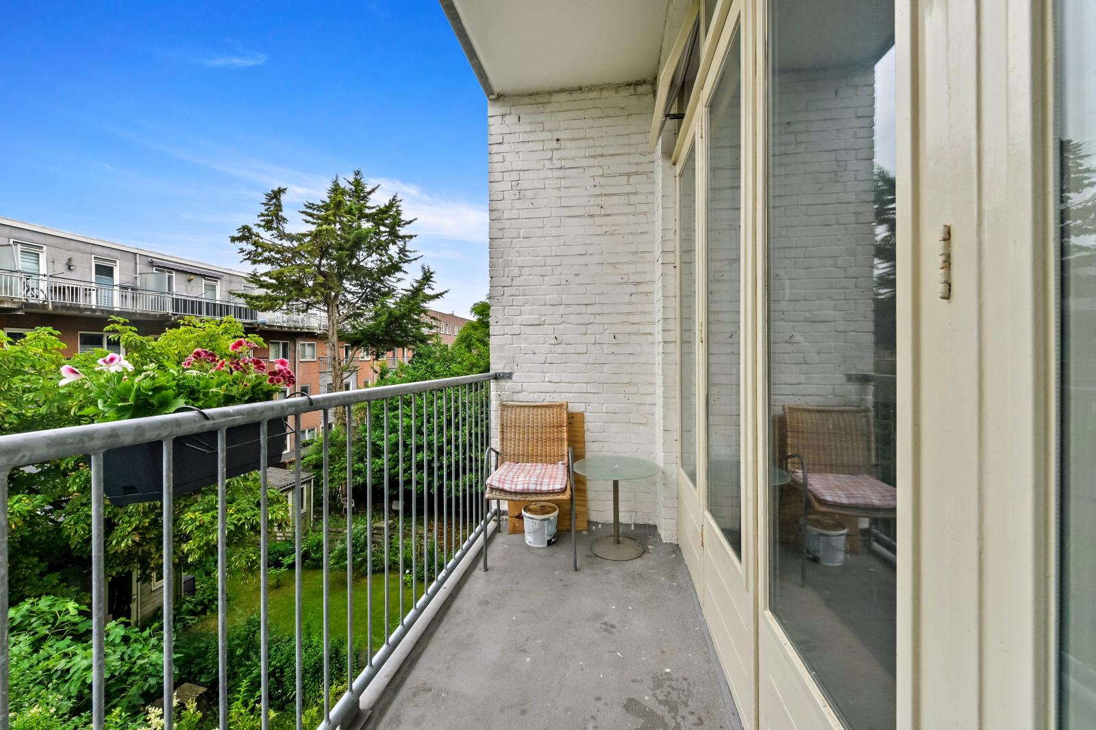 Via het trappenhuis bereik je de voordeur. Aan de voorzijde van de woning vind je een royale en lichte woonkamer, die door het samenvoegen van een voormalige zijkamer extra ruim aanvoelt. Vanuit de hal heb je toegang tot een ruime tussenkamer, een achterkamer met balkon en de keuken, voorzien van een hoekopgestelde keukenopstelling. Deze verdieping heeft ook een apart toilet.