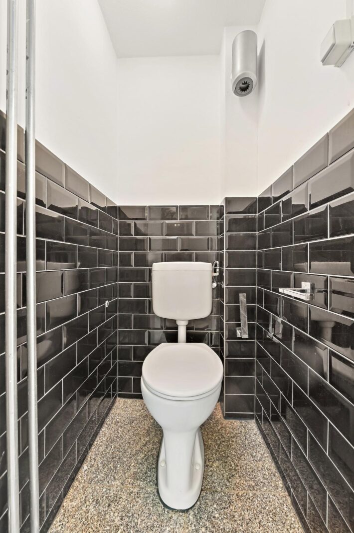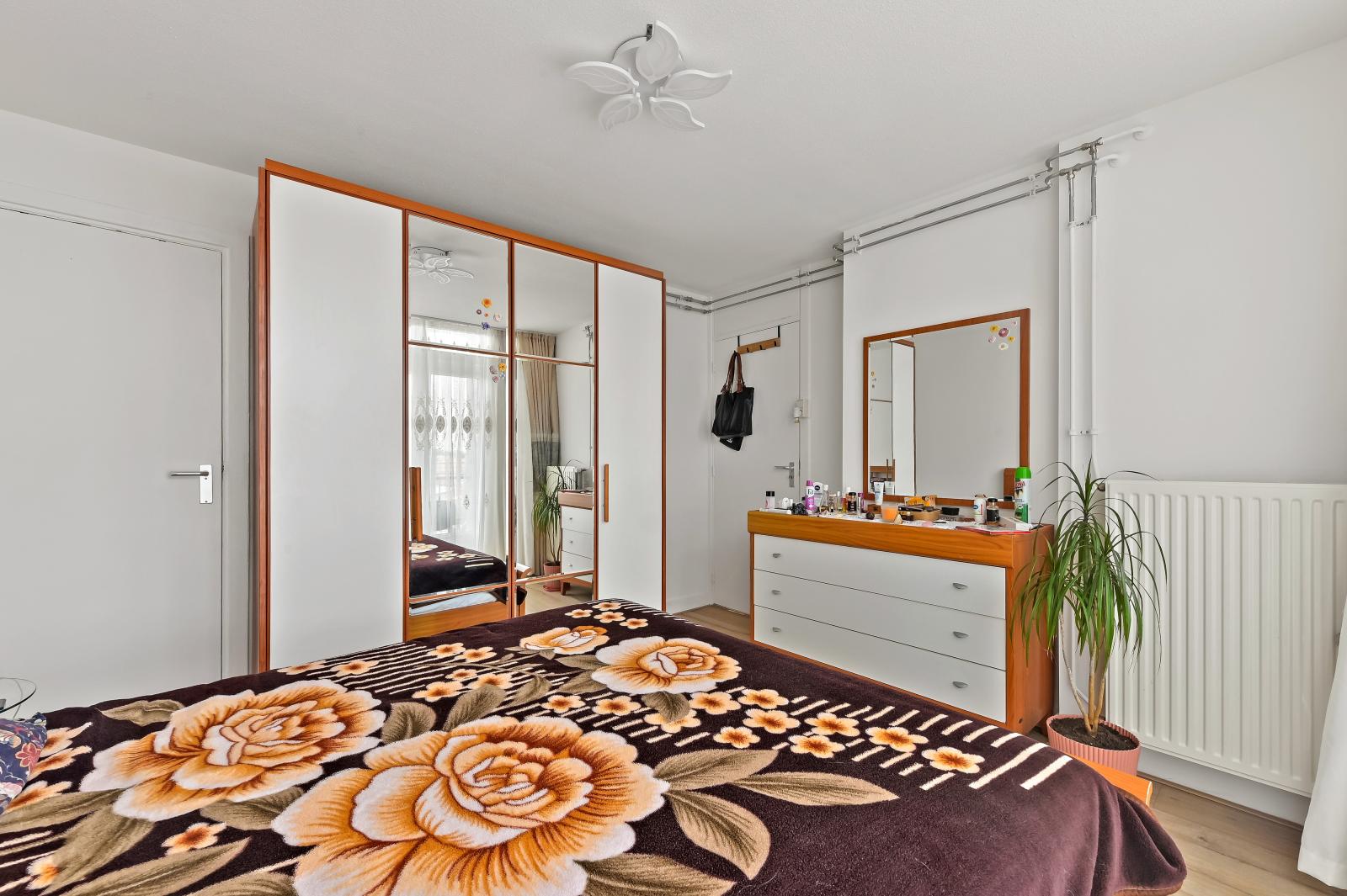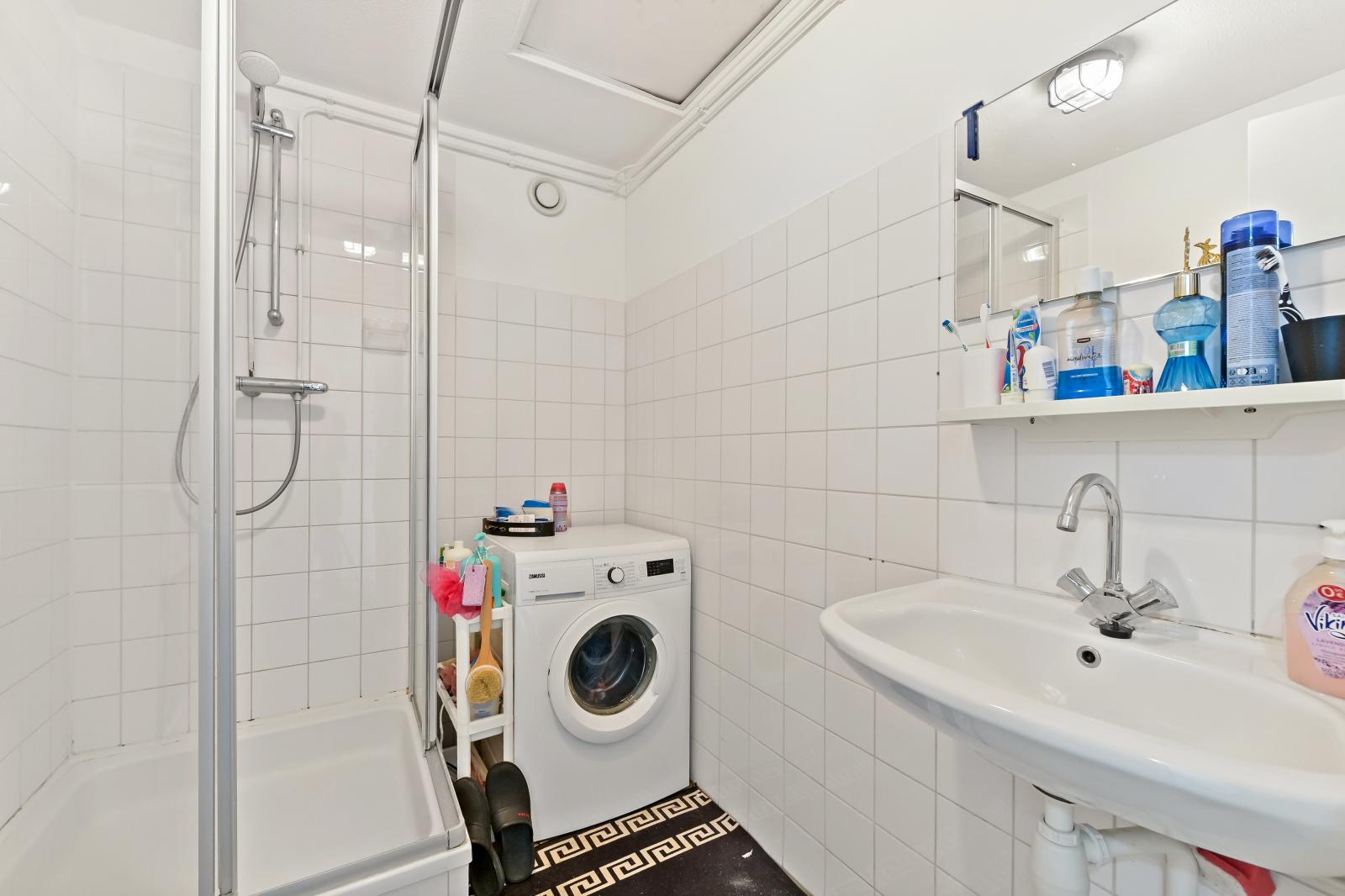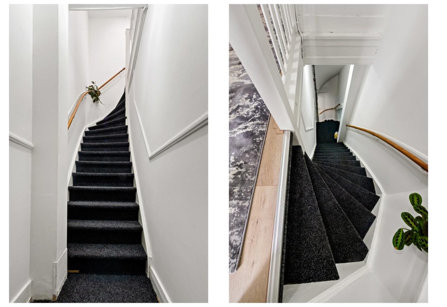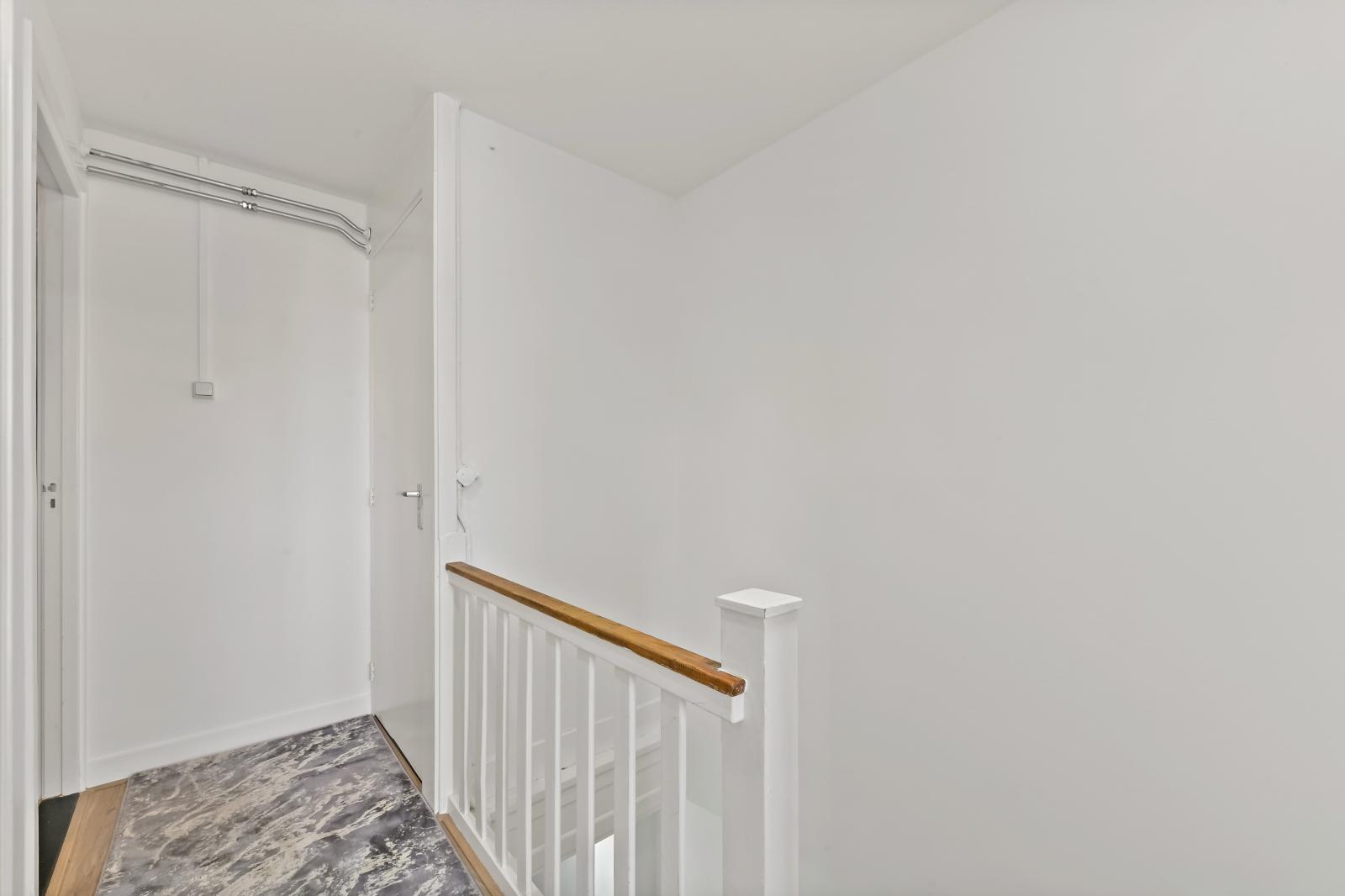 Via het trappenhuis bereik je de voordeur. Aan de voorzijde van de woning vind je een royale en lichte woonkamer, die door het samenvoegen van een voormalige zijkamer extra ruim aanvoelt. Vanuit de hal heb je toegang tot een ruime tussenkamer, een achterkamer met balkon en de keuken, voorzien van een hoekopgestelde keukenopstelling. Deze verdieping heeft ook een apart toilet.