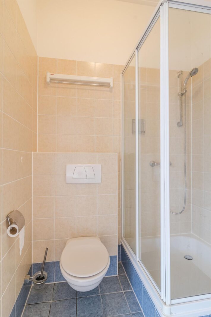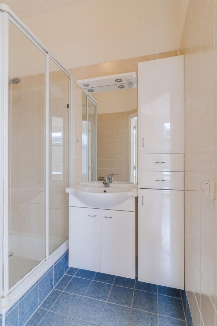 Er is een betegelde badkamer met douchecabine, toilet en wastafelmeubel. De studio is v.v. laminaatvloer, dubbele beglazing en plafond met inbouwspots.