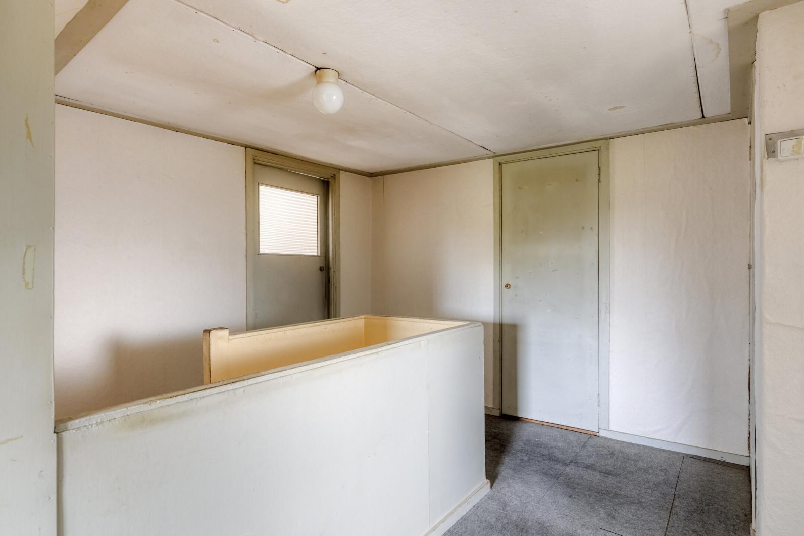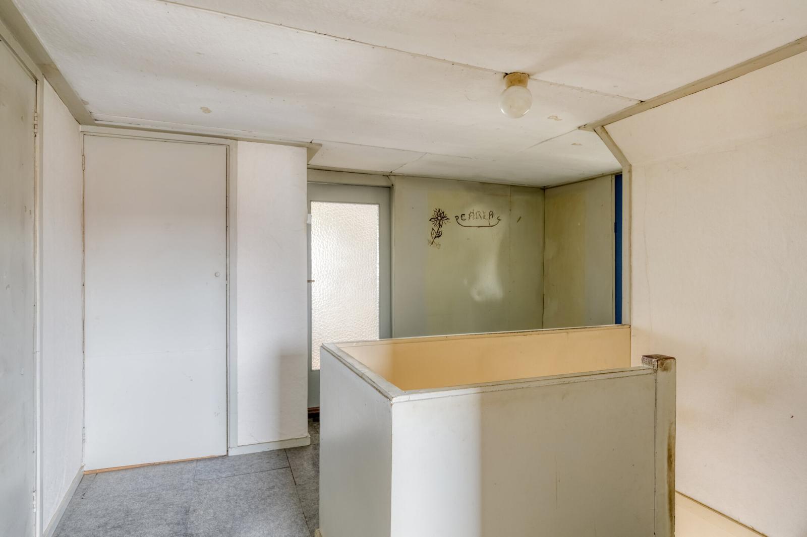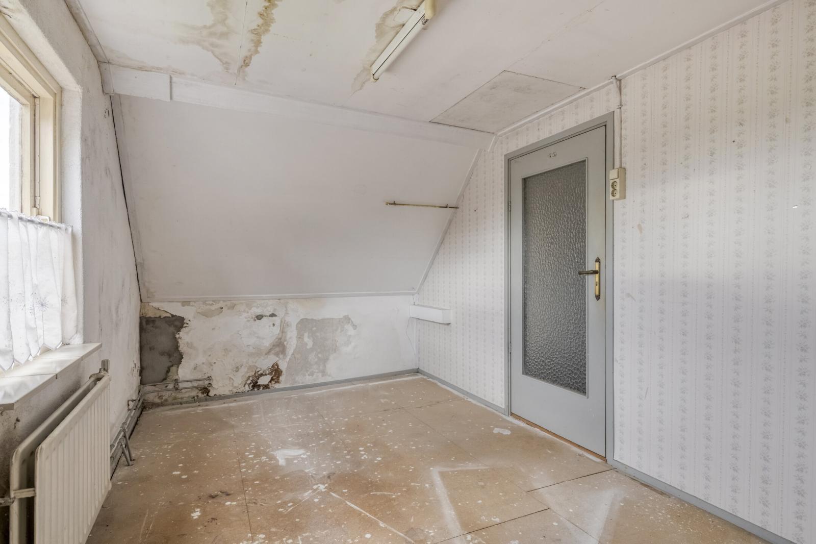 Via de trapopgang in de entreehal bereikt u de overloop met vaste kast en toegang tot drie slaapkamers en een berging. De slaapkamers en het dak zijn aan een grondige renovatie toe.