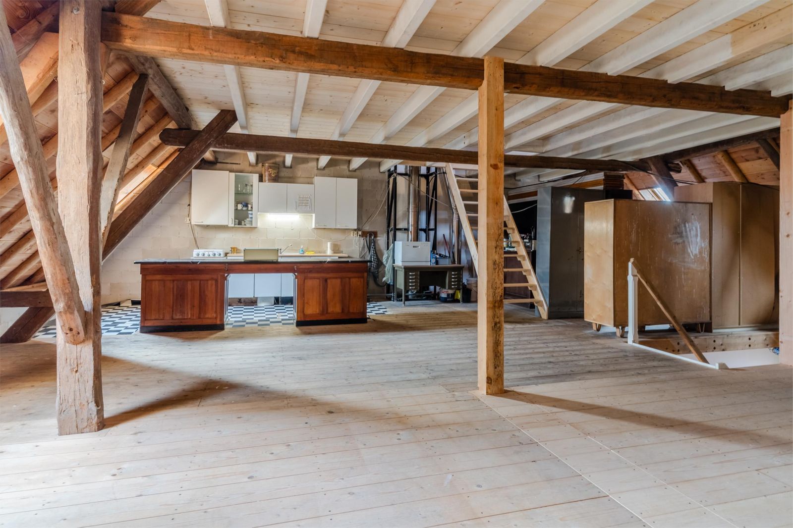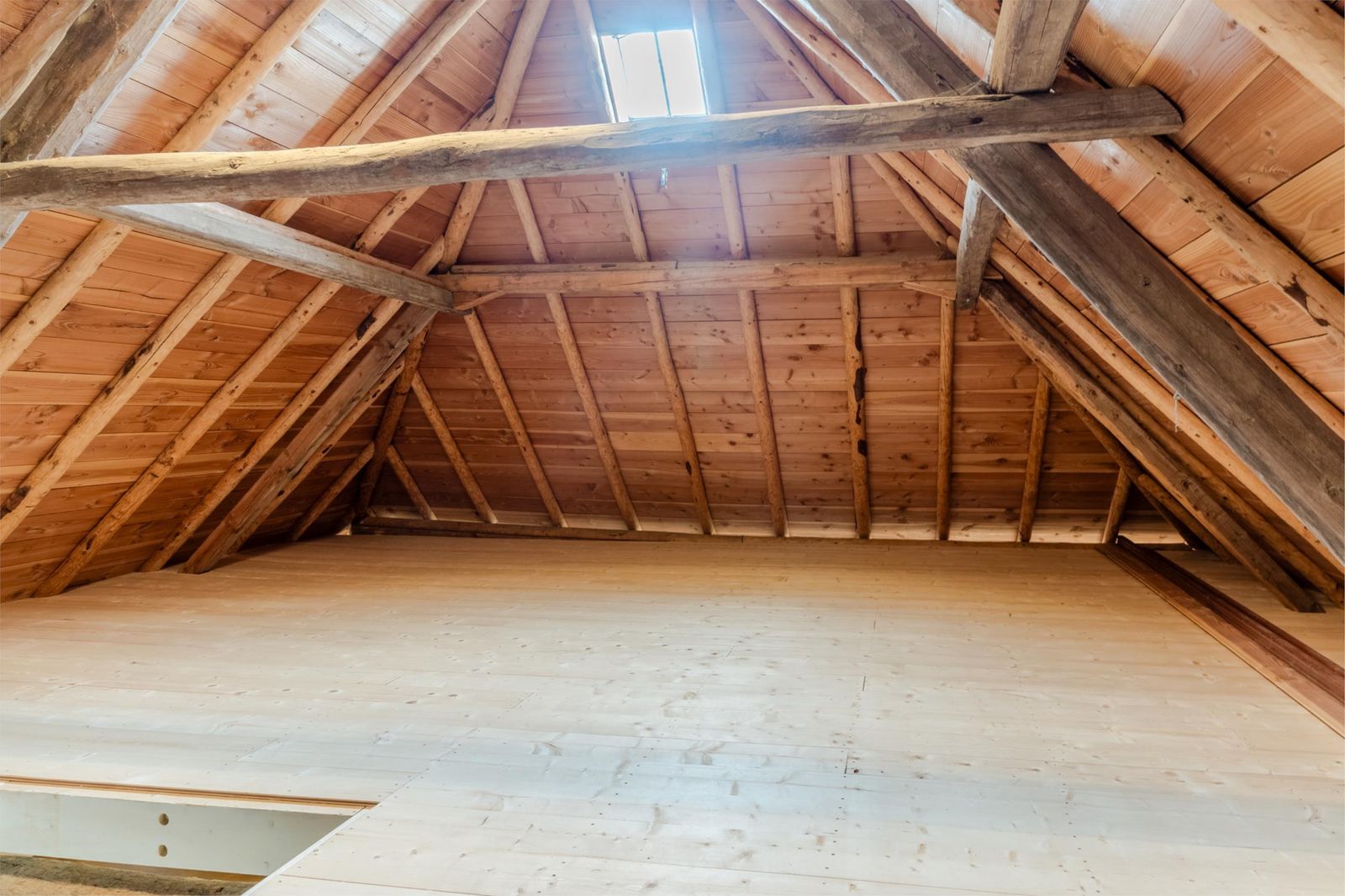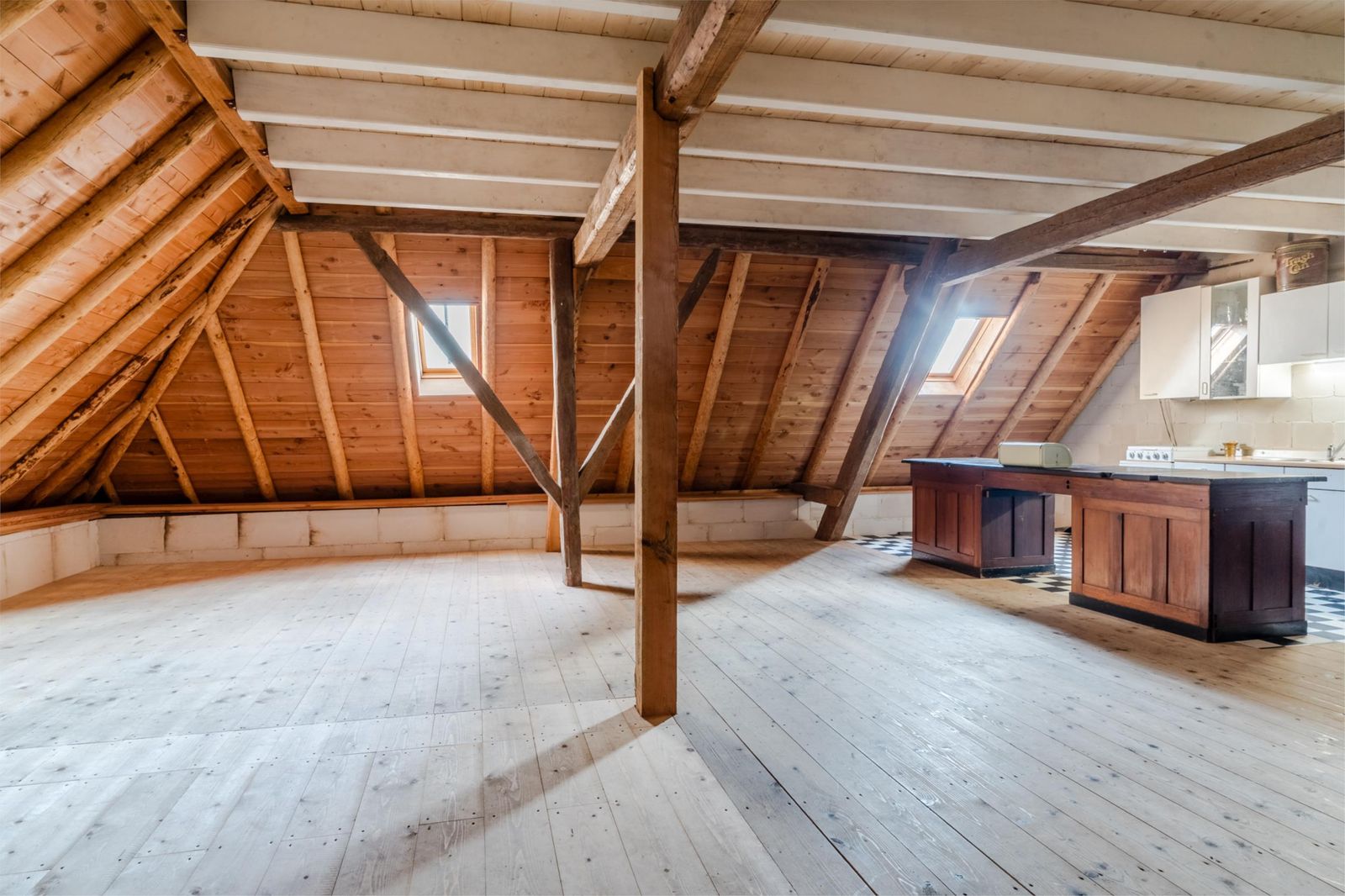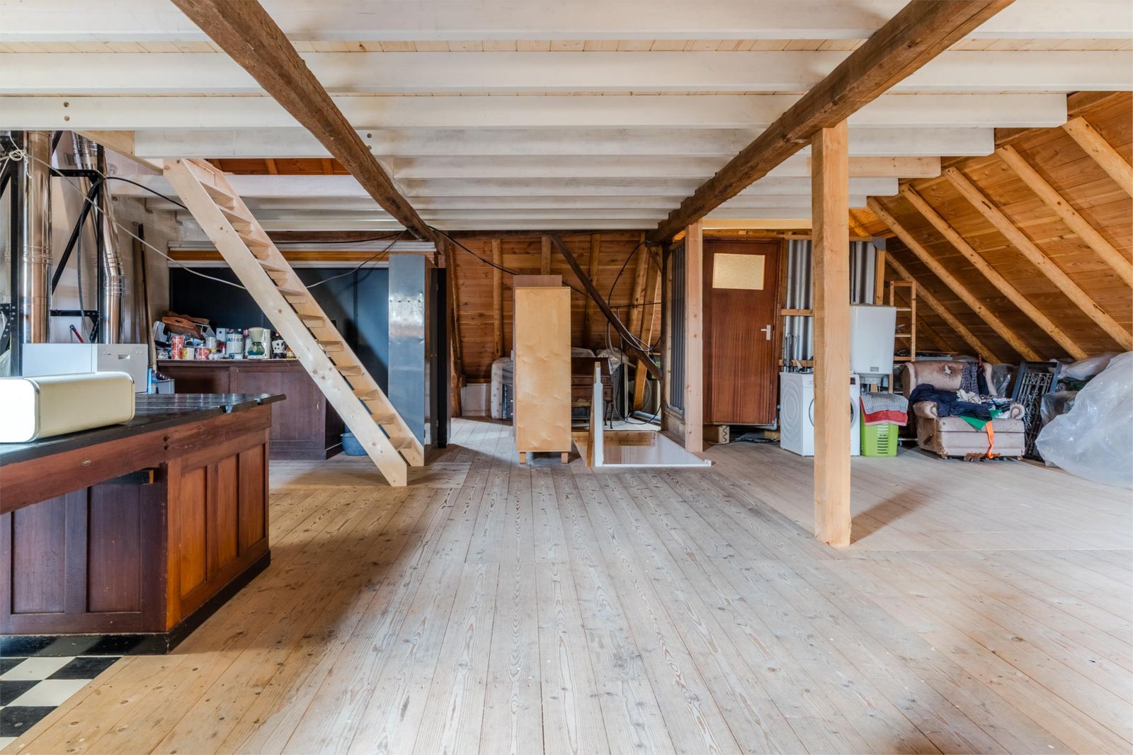 De eerste verdieping is een zeer grote ruimte die nog naar eigen wens ingedeeld kan worden. Er is ruimte voor vier grote slaapkamers. De vier Velux dakramen zorgen voor een goed belichte verdieping. Een keuken en een doucheruimte zijn tijdelijke voorzieningen.
