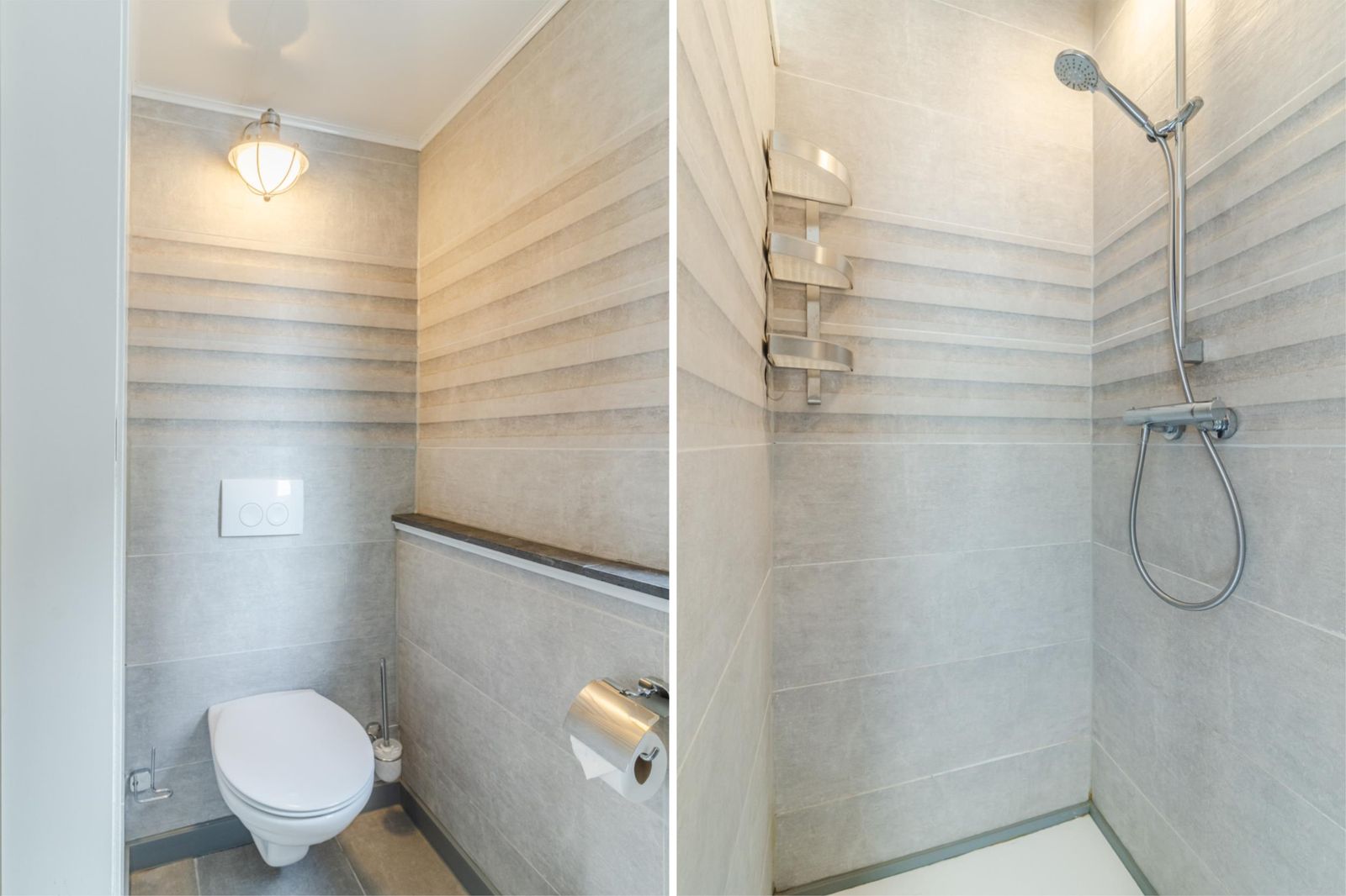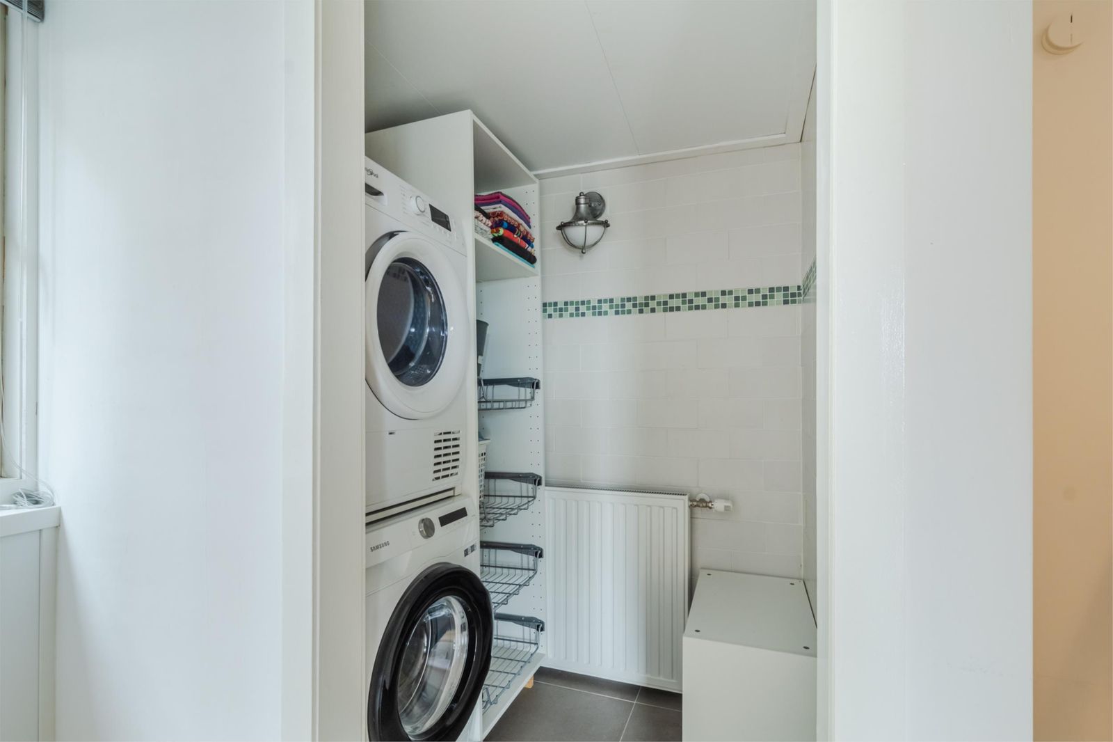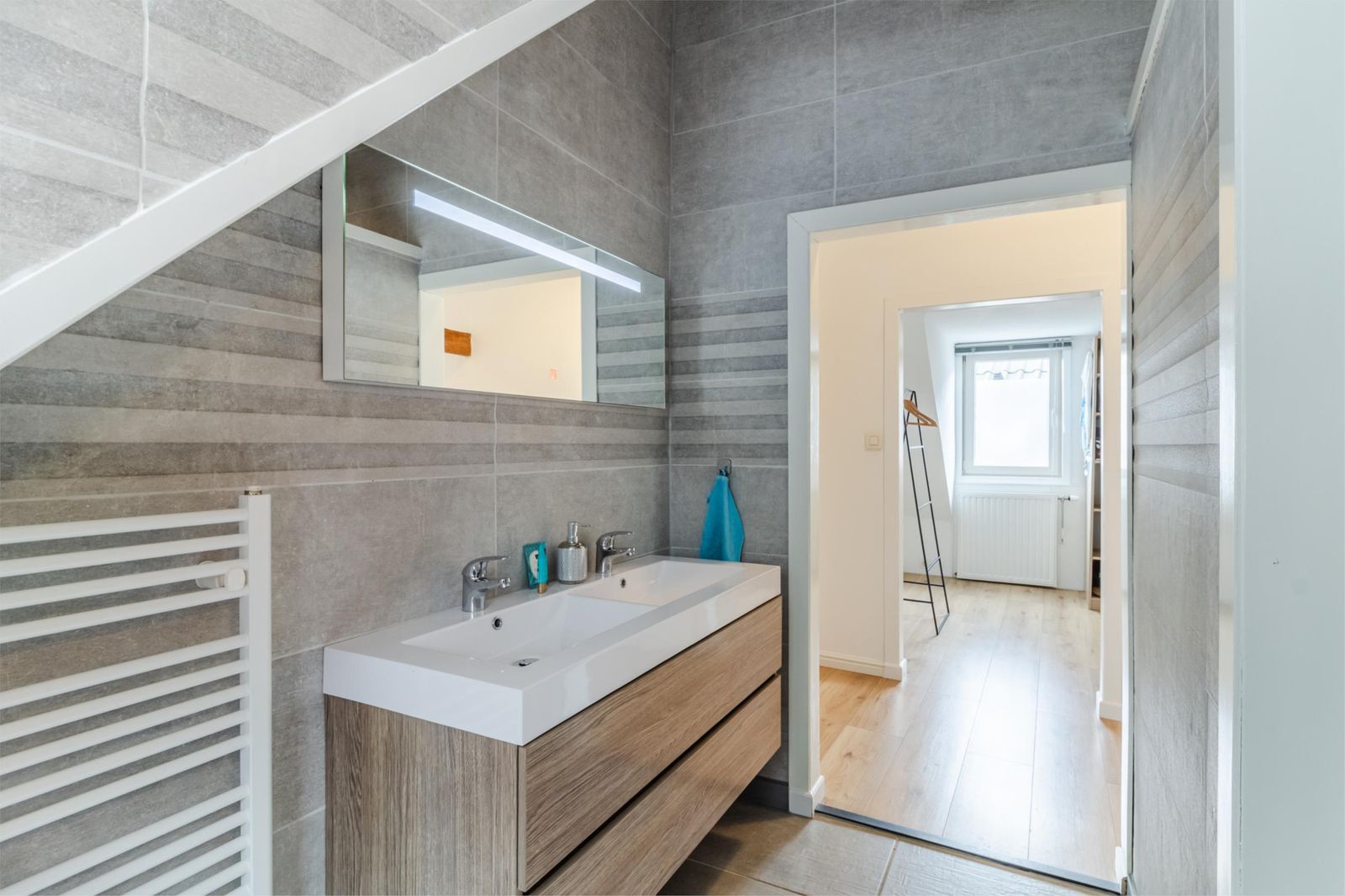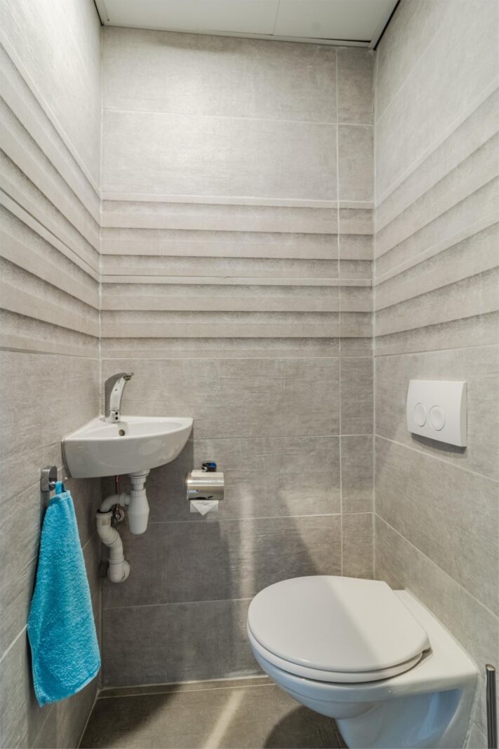 De moderne badkamer beschikt over een ruime inloopdouche, dubbele wastafel en toilet. Daarnaast is er een aparte wasruimte (ca. 1,35 x 1,70 m) met aansluitingen voor wasmachine en droger en een vaste linnenkast.