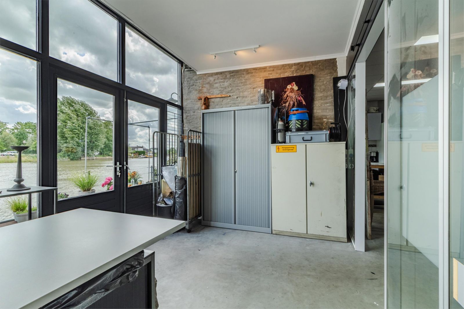 Via de ruime hal met trapopgang en meterkast of een aparte voor deur bereik je een multifunctionele ruimte van ca. 70 m². Deze verdieping beschikt over een eigen keukenblok, twee werk-/hobbykamers, toilet en dubbele openslaande deuren naar het terras aan het water. Dankzij de tweede entree is deze verdieping zelfstandig te gebruiken – perfect als praktijk, gastenverblijf of aparte woonlaag.