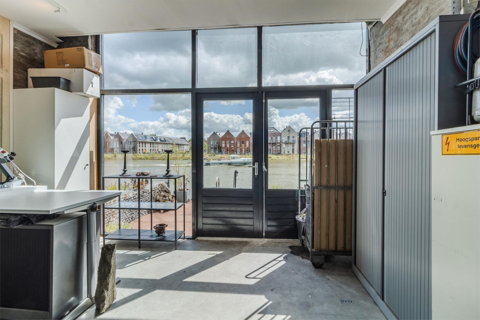 Centrale hal met toegang tot een ruime garderobe en/of kantoor, separaat toilet, voorraadkast en een indrukwekkende woonkamer met open keuken van ca. 85 m². Drie grote raampartijen (ca. 3 x 3 meter) zorgen voor een panoramisch uitzicht over de rivier – alsof je op een cruiseschip zit. Vanuit de woonkamer is er toegang tot het zonnige balkon van ca. 3 x 3 meter.