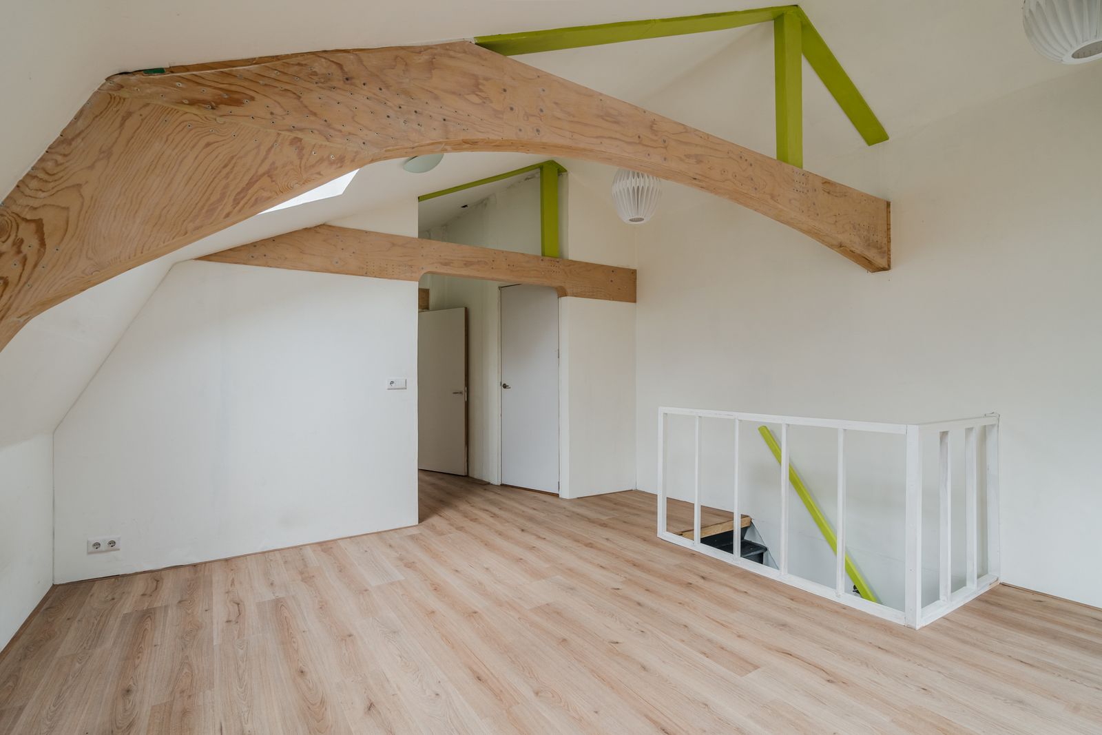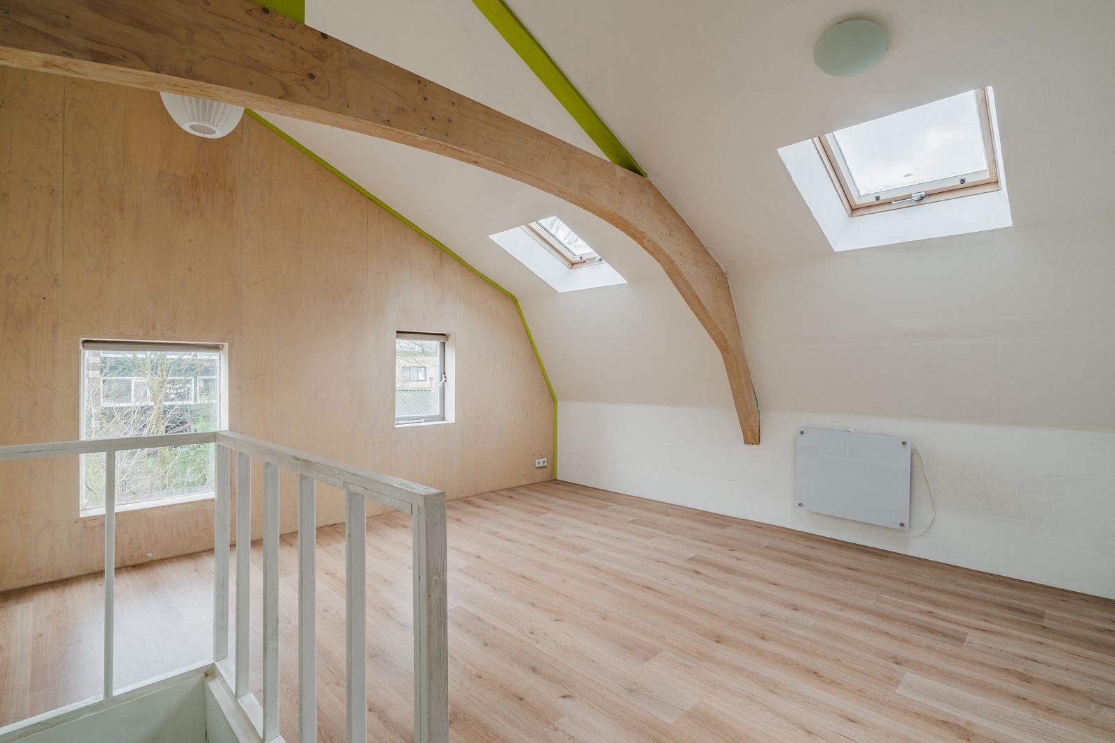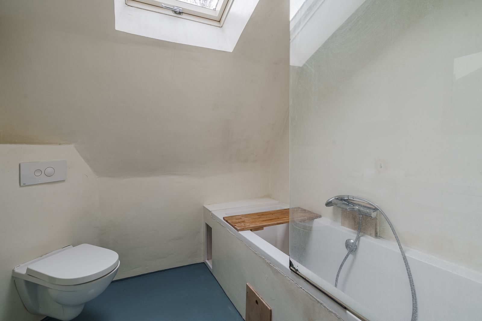 Eerste verdieping: Op de verdieping vindt u een slaapkamer aan de voorzijde met hoog plafond, een tweede slaapkamer is eenvoudig aan de achterzijde in te richten. Dit is nu een open ruimte. De wasapparatuur past in de kast waar de aansluiting aanwezig is en de opstelling van de mechanische ventilatie. De badkamer beschikt over een ligbad, toilet en wastafelmeubel.