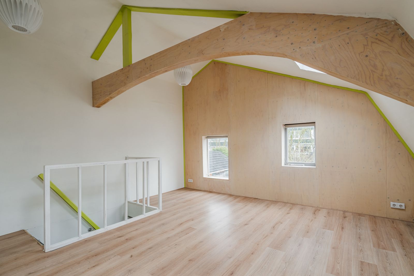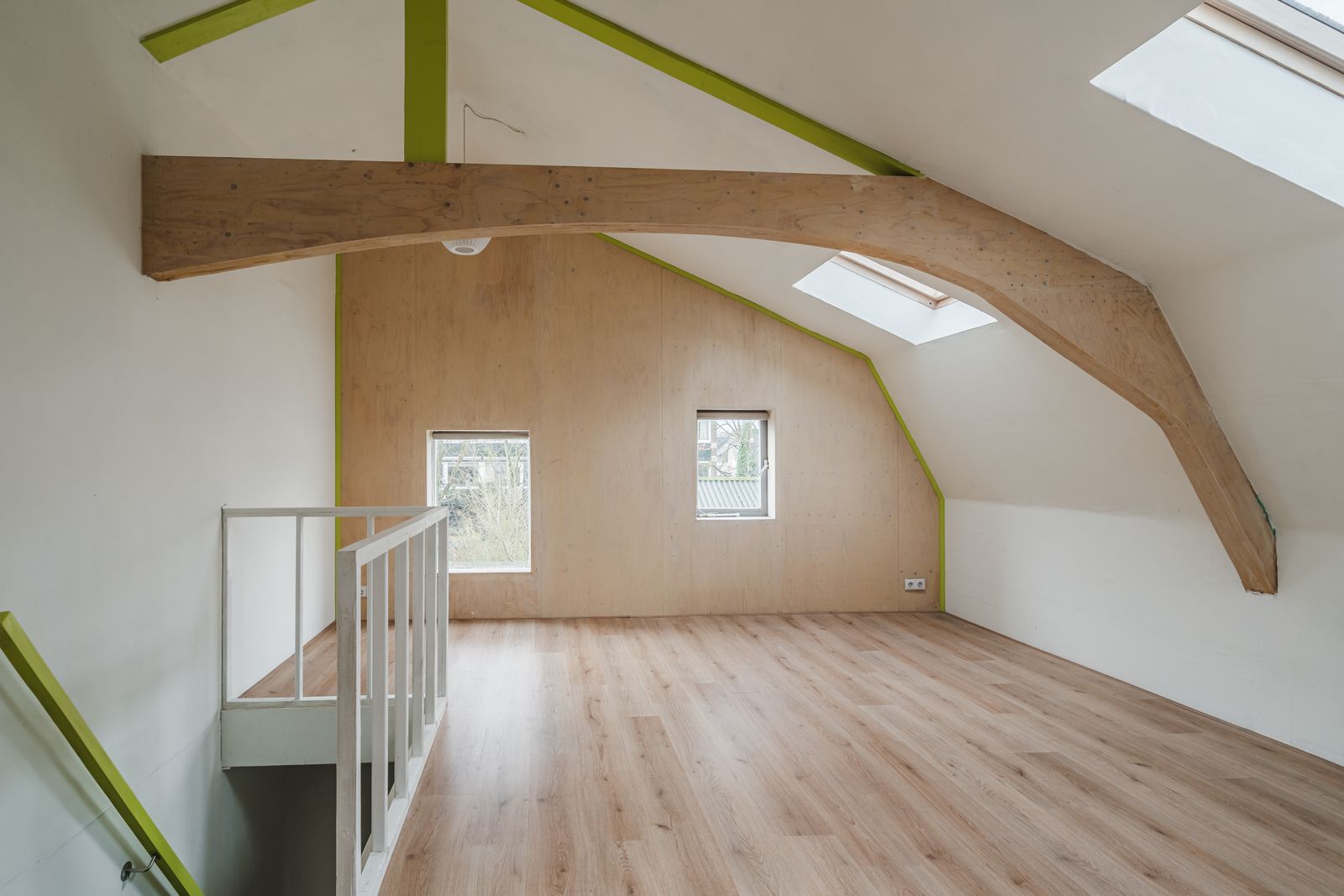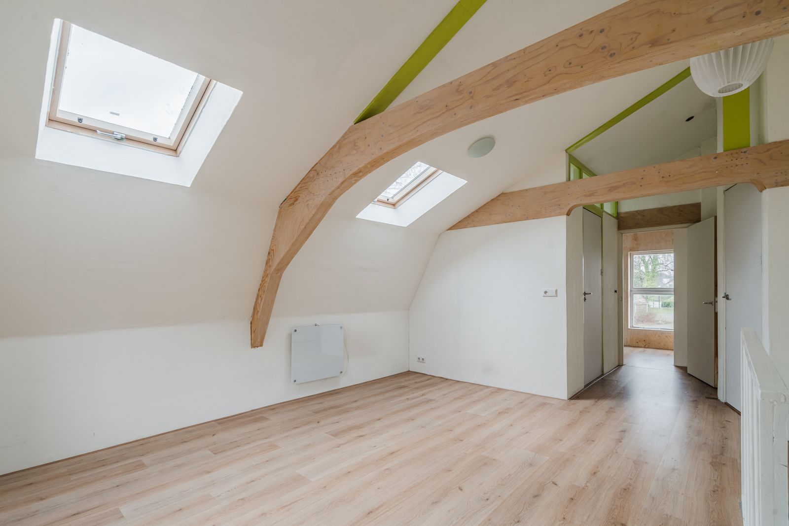 Eerste verdieping: Op de verdieping vindt u een slaapkamer aan de voorzijde met hoog plafond, een tweede slaapkamer is eenvoudig aan de achterzijde in te richten. Dit is nu een open ruimte. De wasapparatuur past in de kast waar de aansluiting aanwezig is en de opstelling van de mechanische ventilatie. De badkamer beschikt over een ligbad, toilet en wastafelmeubel.
