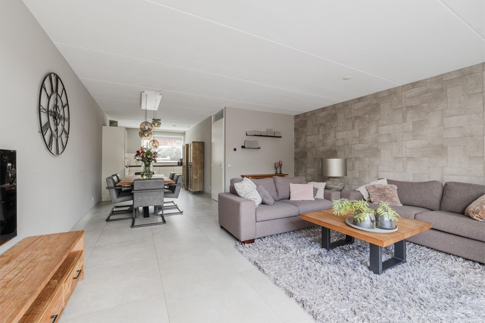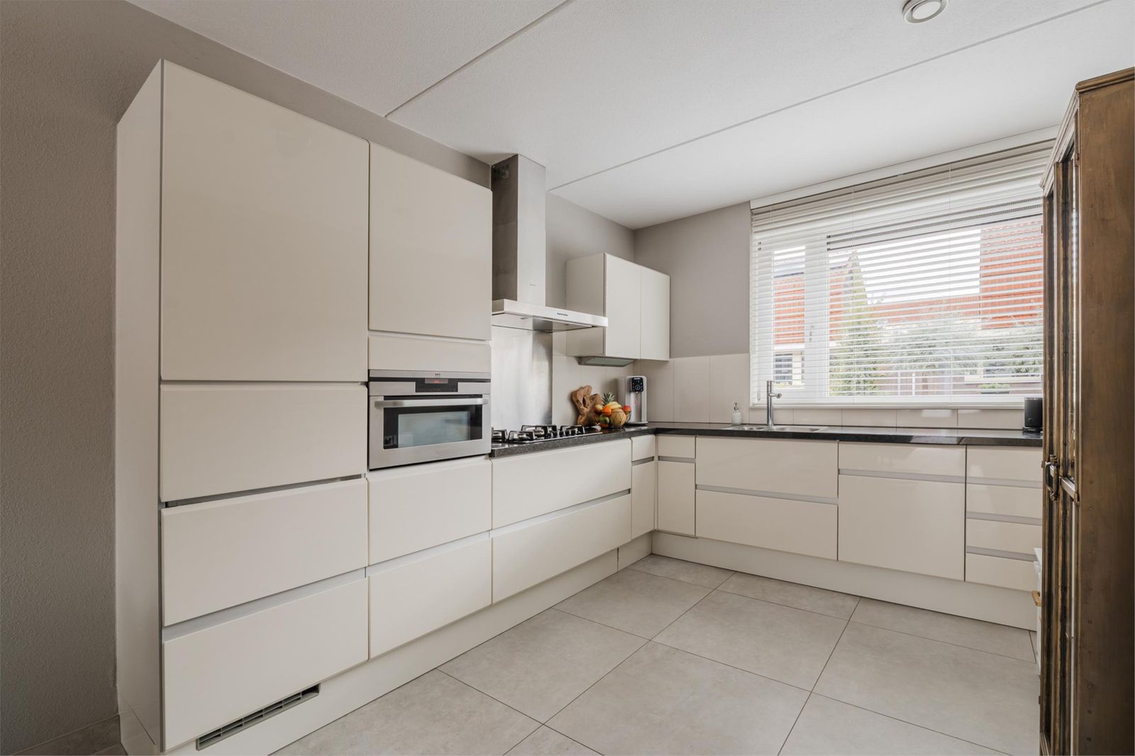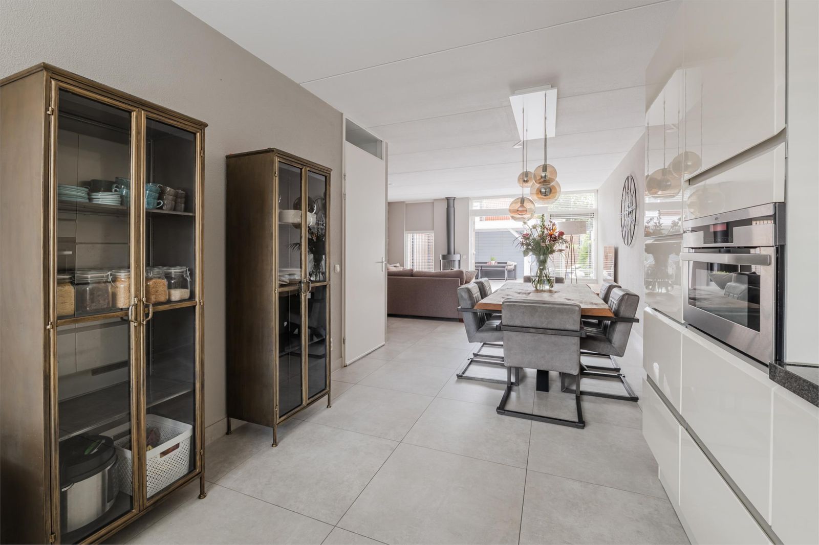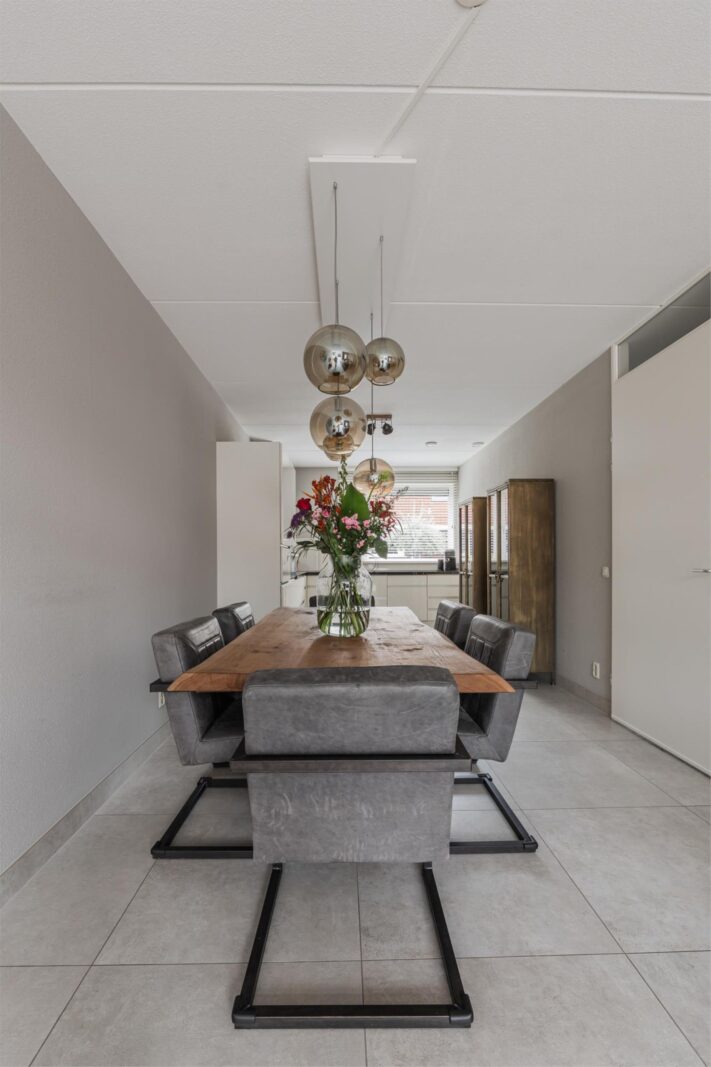 Bij binnenkomst tref je de hal met toilet, meterkast, trapopgang en handige kelderkast. Aan de voorzijde ligt de moderne open keuken, voorzien van diverse inbouwapparatuur en ruimte voor een royale eettafel.