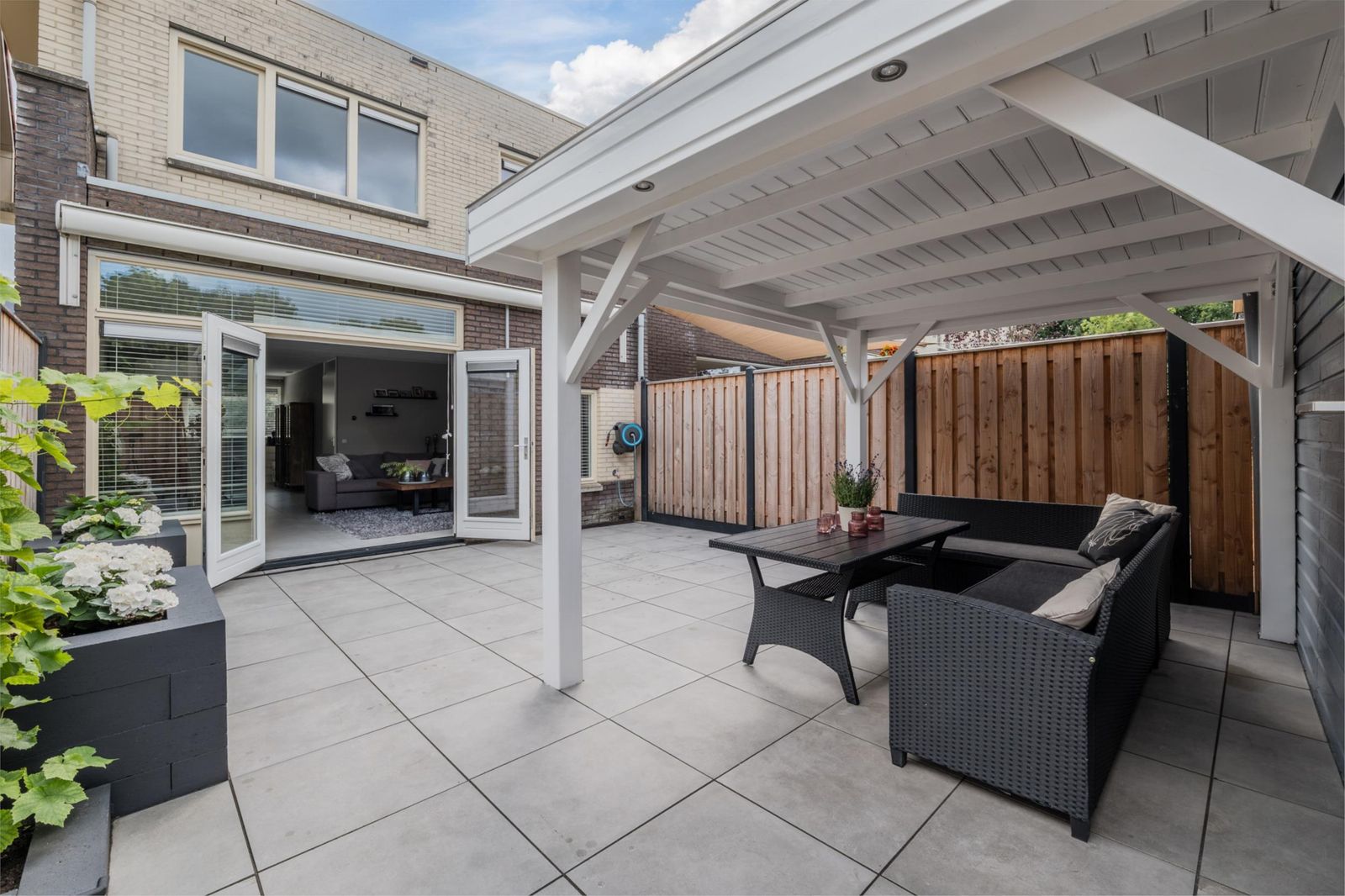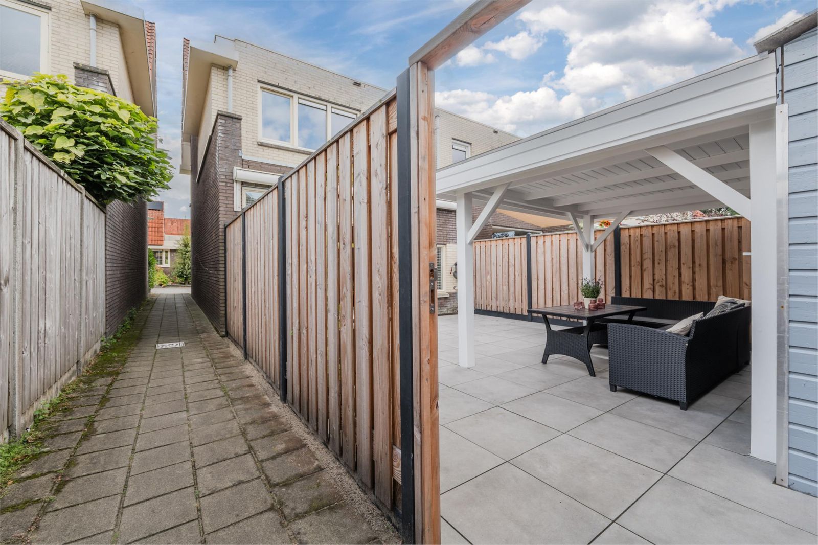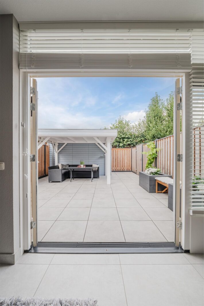 De achtertuin is in 2024 volledig vernieuwd en aangelegd met keramische tegels, een nieuwe schutting en een royale veranda met verlichting. De ligging op het westen zorgt voor zon tot in de avond, terwijl de beschutte ligging nauwelijks inkijk geeft. Aan de voorzijde vind je een brede oprit, eveneens nieuw betegeld in 2024, met ruimte voor twee auto’s.