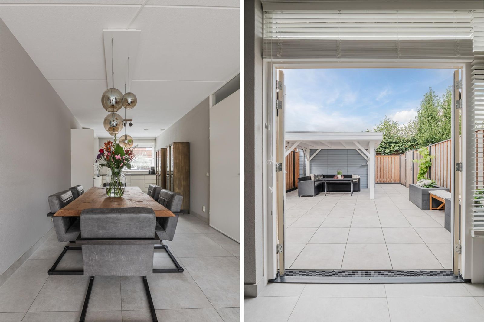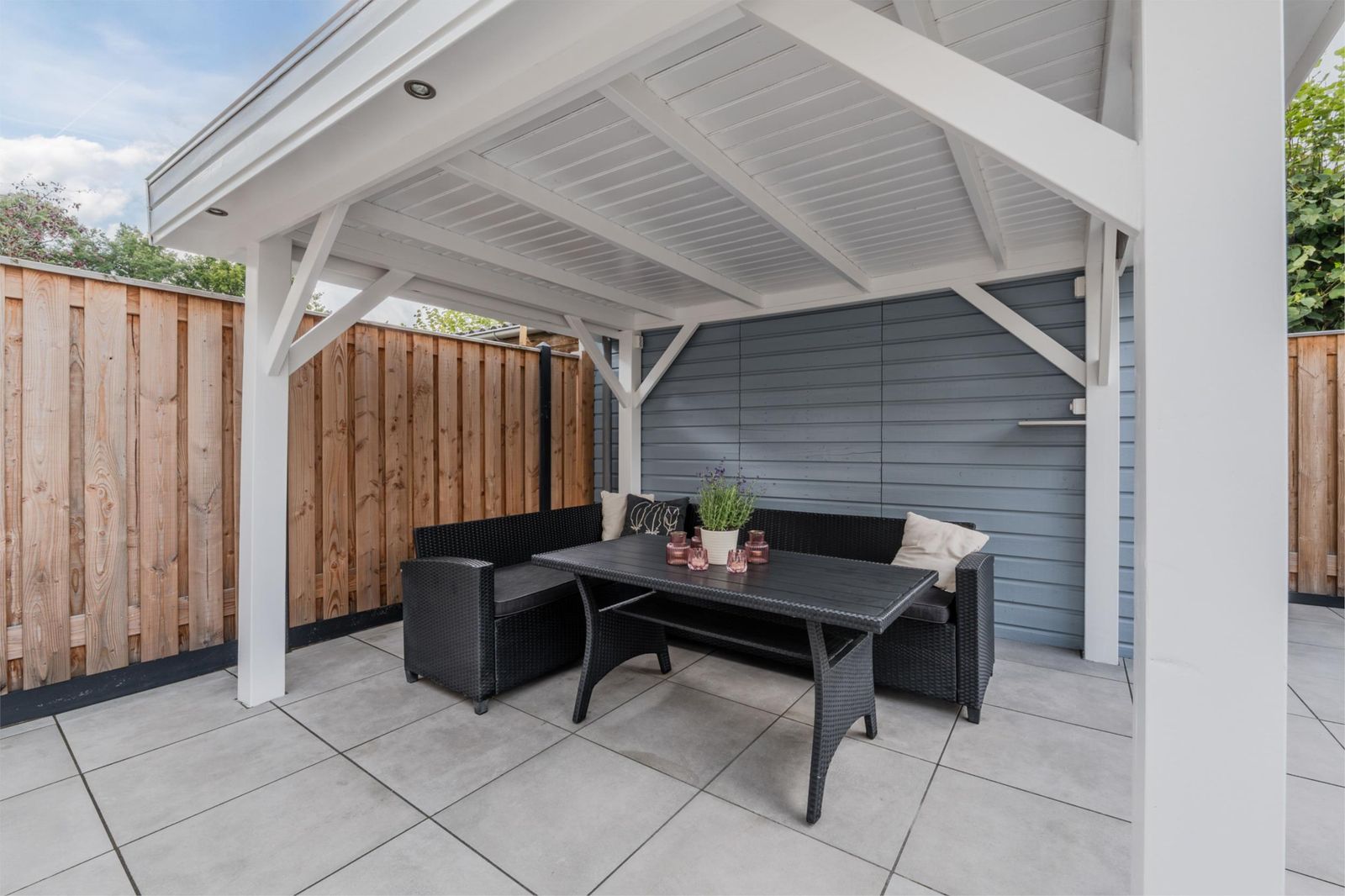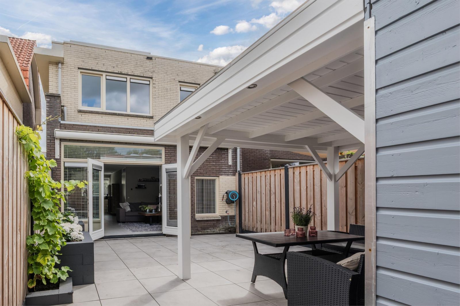 De achtertuin is in 2024 volledig vernieuwd en aangelegd met keramische tegels, een nieuwe schutting en een royale veranda met verlichting. De ligging op het westen zorgt voor zon tot in de avond, terwijl de beschutte ligging nauwelijks inkijk geeft. Aan de voorzijde vind je een brede oprit, eveneens nieuw betegeld in 2024, met ruimte voor twee auto’s.