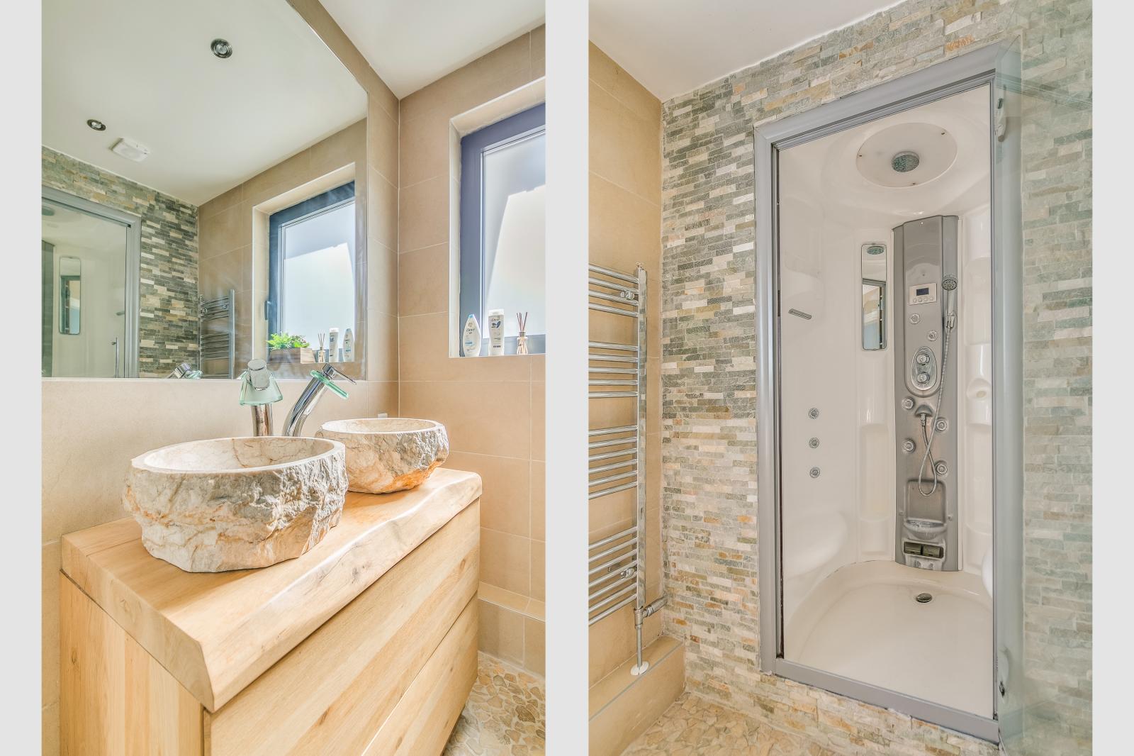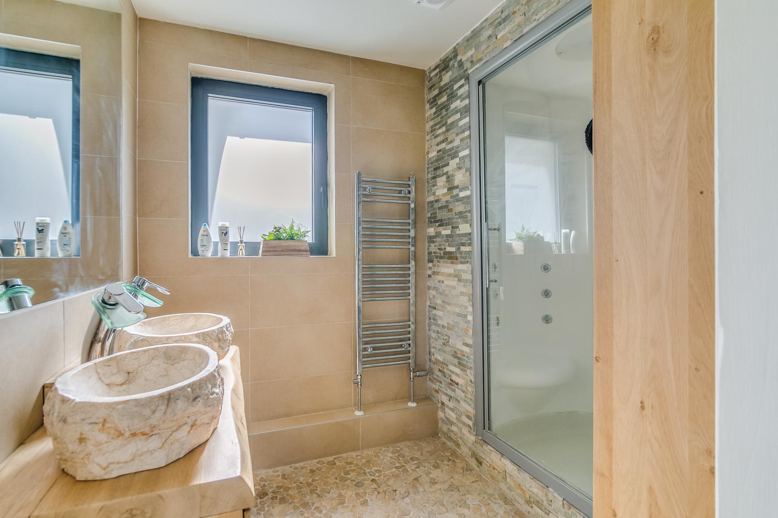 Also on the ground floor is a bedroom with an adjacent modern bathroom. This makes the property highly suitable for single-level living or comfortably accommodating guests.