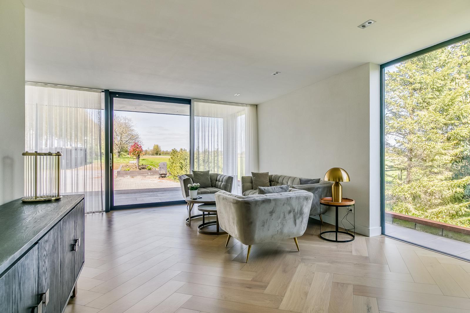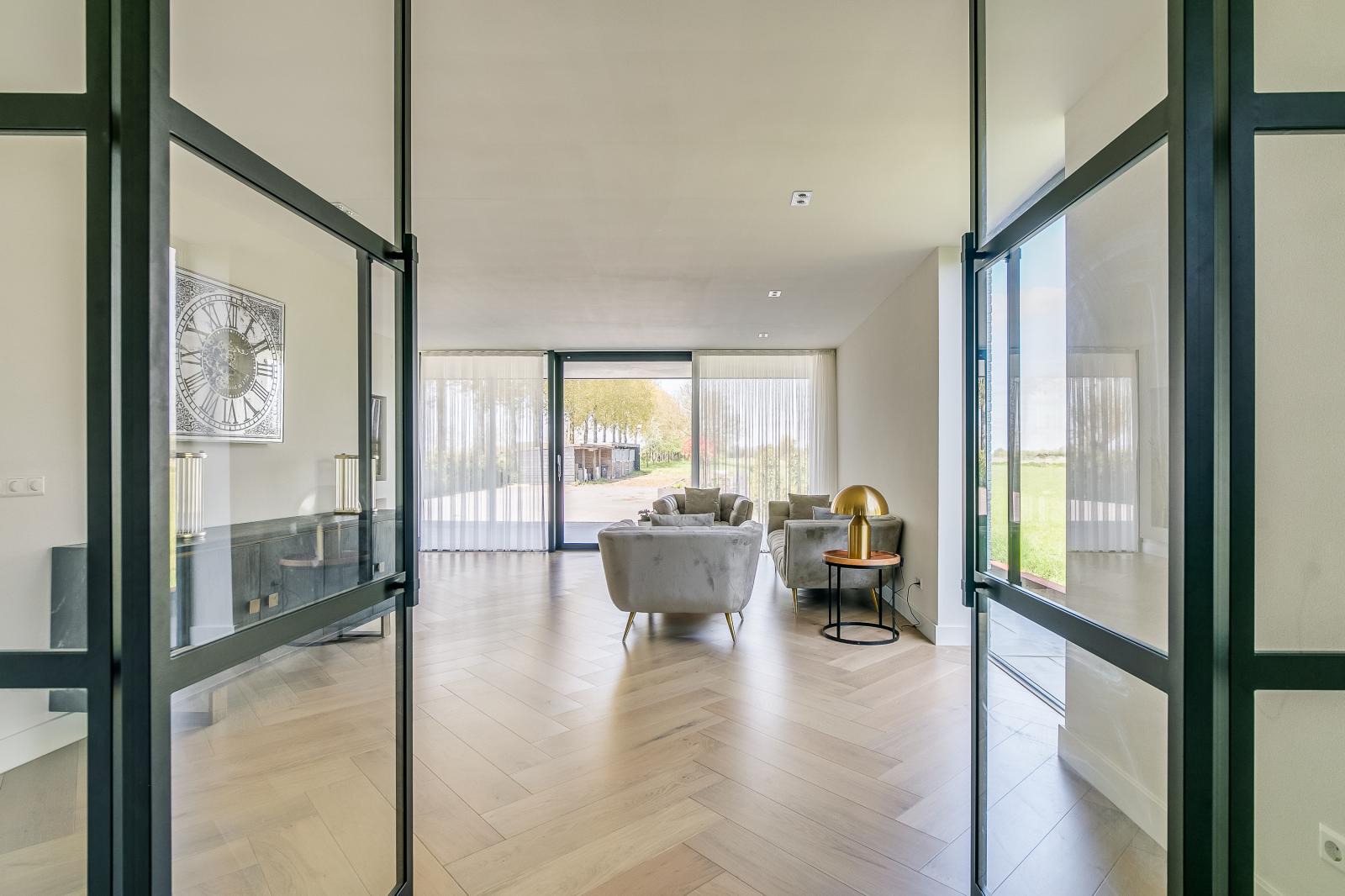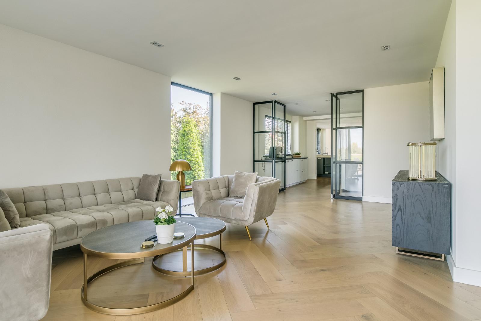 Via de royale oprijlaan bereik je de woning, waar direct de ruimte en het representatieve karakter opvallen. De entree is licht en geeft toegang tot de verschillende leefruimtes. Op de begane grond bevinden zich twee ruime woonkamers, elk met een eigen sfeer en gebruiksmogelijkheid. De woonkeuken vormt het hart van de woning en is voorzien van een kookeiland en diverse luxe inbouwapparatuur. Grote raampartijen en schuifpuien zorgen voor veel daglicht en een directe verbinding met de tuin en het terras.