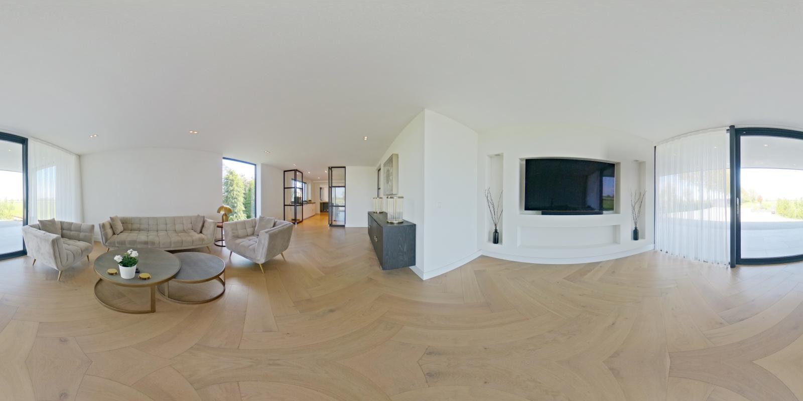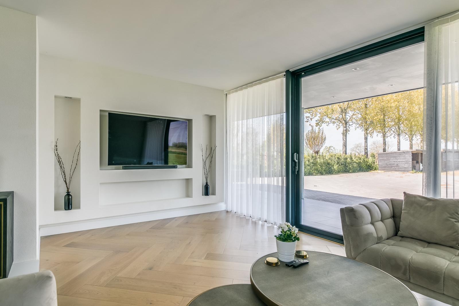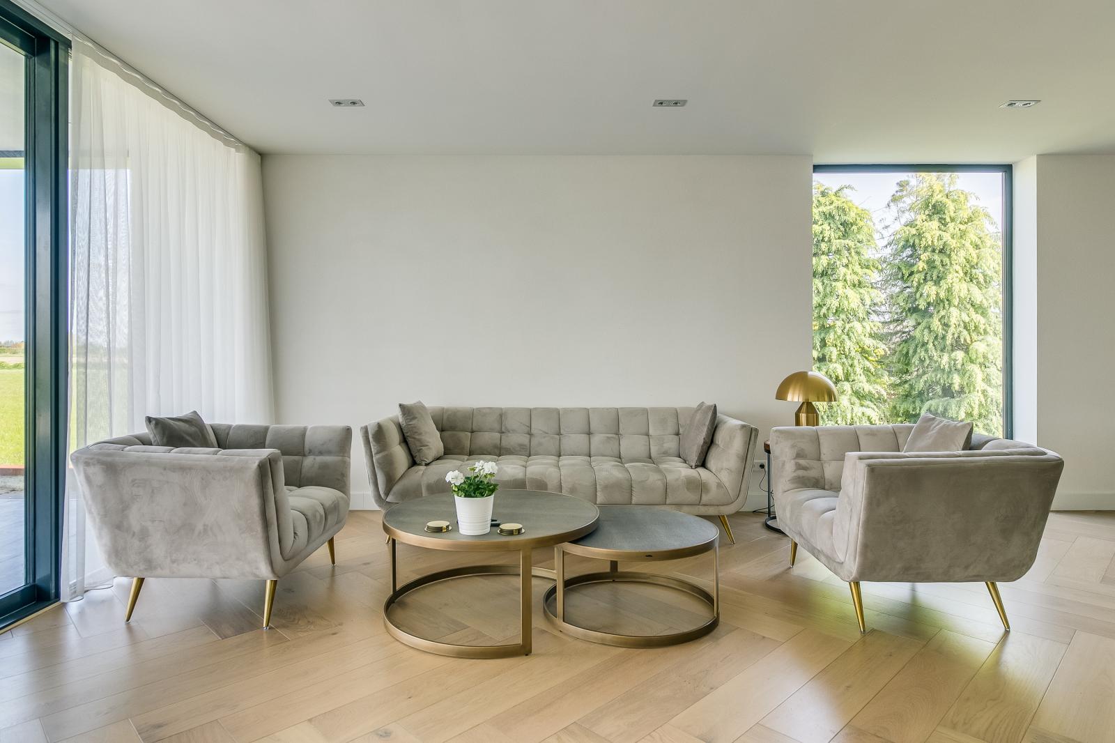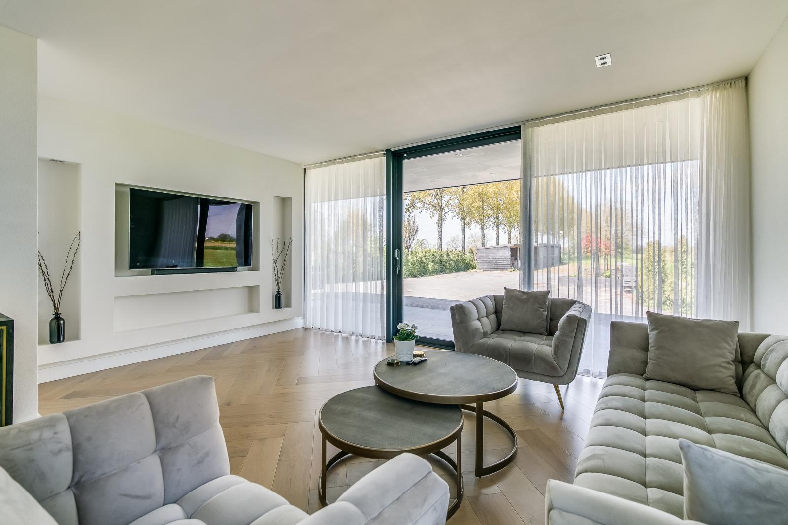Via de royale oprijlaan bereik je de woning, waar direct de ruimte en het representatieve karakter opvallen. De entree is licht en geeft toegang tot de verschillende leefruimtes. Op de begane grond bevinden zich twee ruime woonkamers, elk met een eigen sfeer en gebruiksmogelijkheid. De woonkeuken vormt het hart van de woning en is voorzien van een kookeiland en diverse luxe inbouwapparatuur. Grote raampartijen en schuifpuien zorgen voor veel daglicht en een directe verbinding met de tuin en het terras.