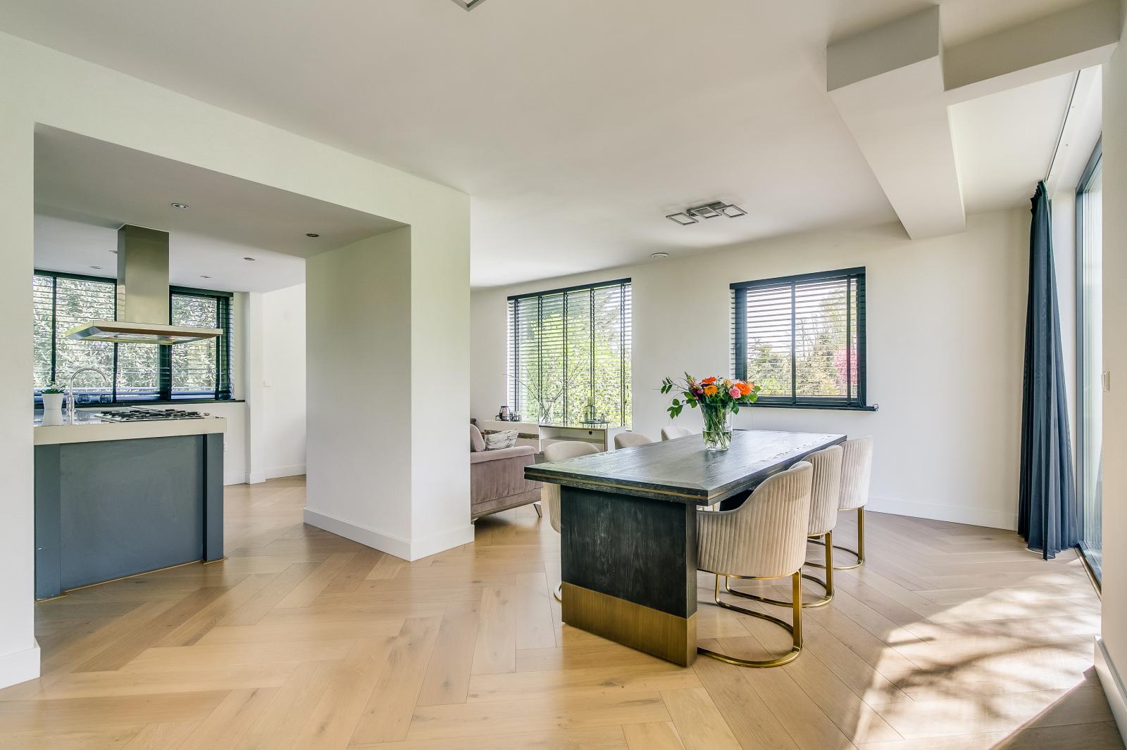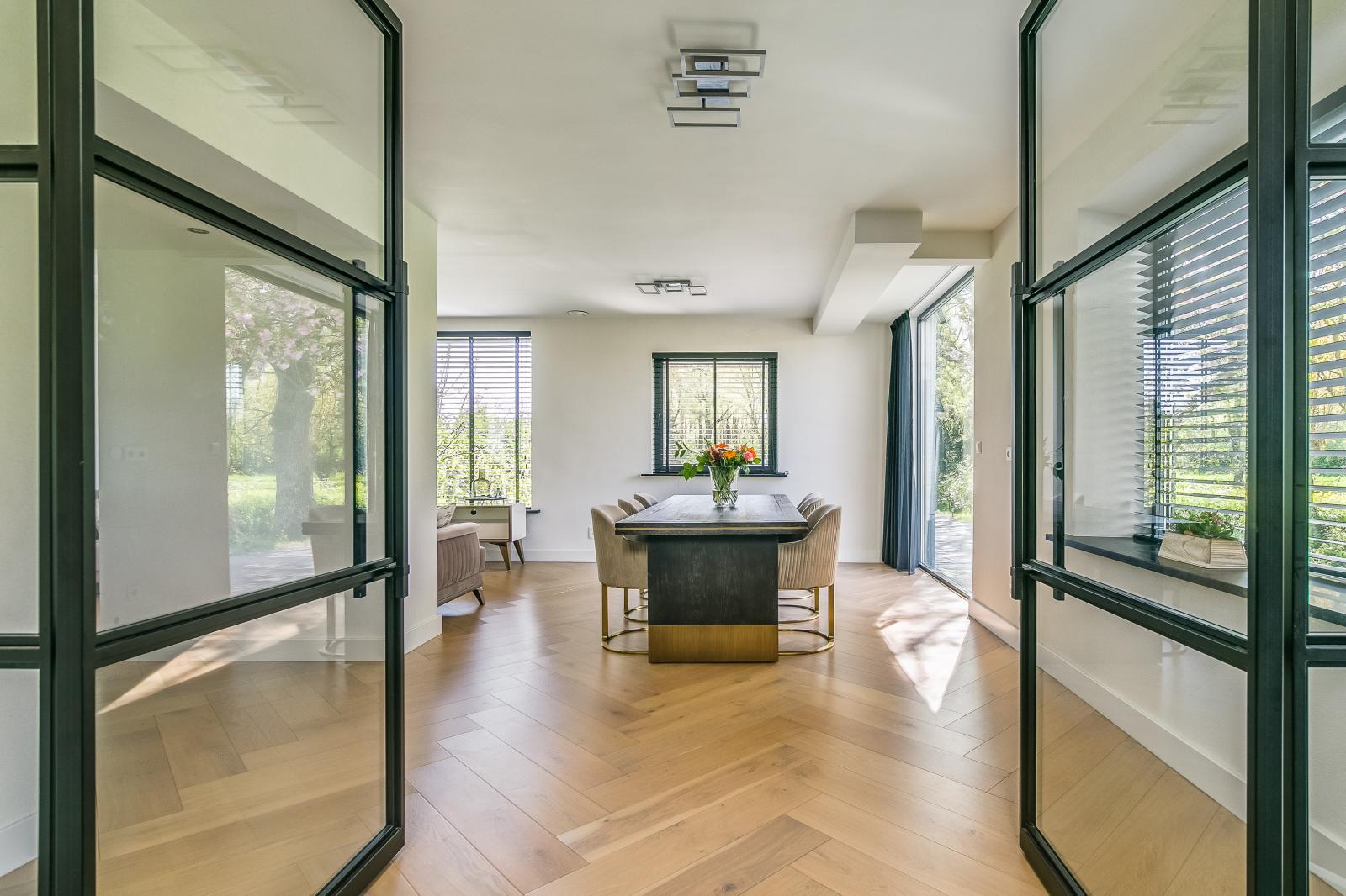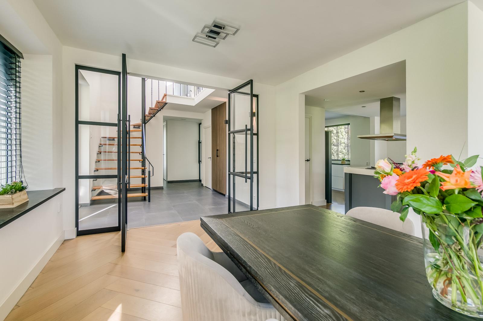 The property is accessed via a spacious private driveway, immediately highlighting its scale and well-kept appearance. The entrance is bright and provides access to the various living areas. The ground floor features two generously sized living rooms, each with its own function and atmosphere. The kitchen forms the heart of the home and is equipped with a cooking island and high-end built-in appliances. Large windows and sliding doors ensure an abundance of natural light and a seamless connection to the garden and terrace.