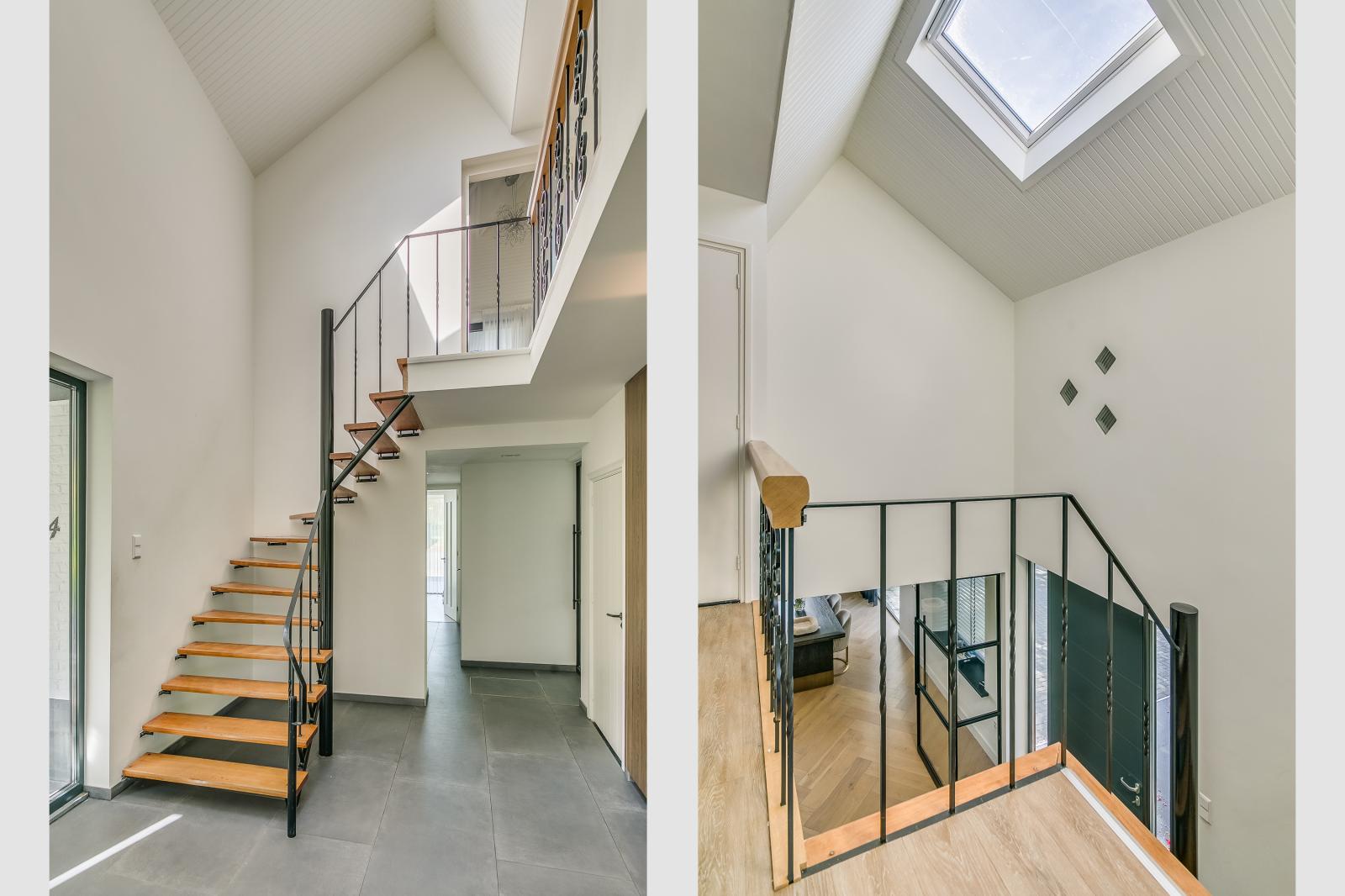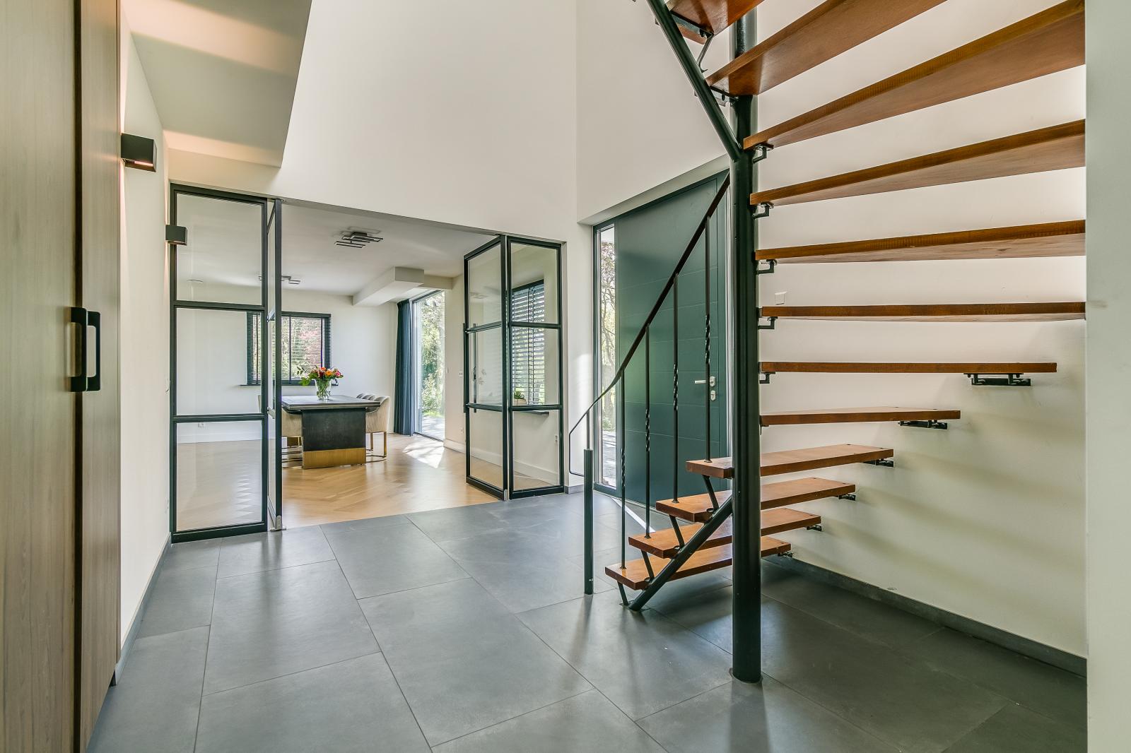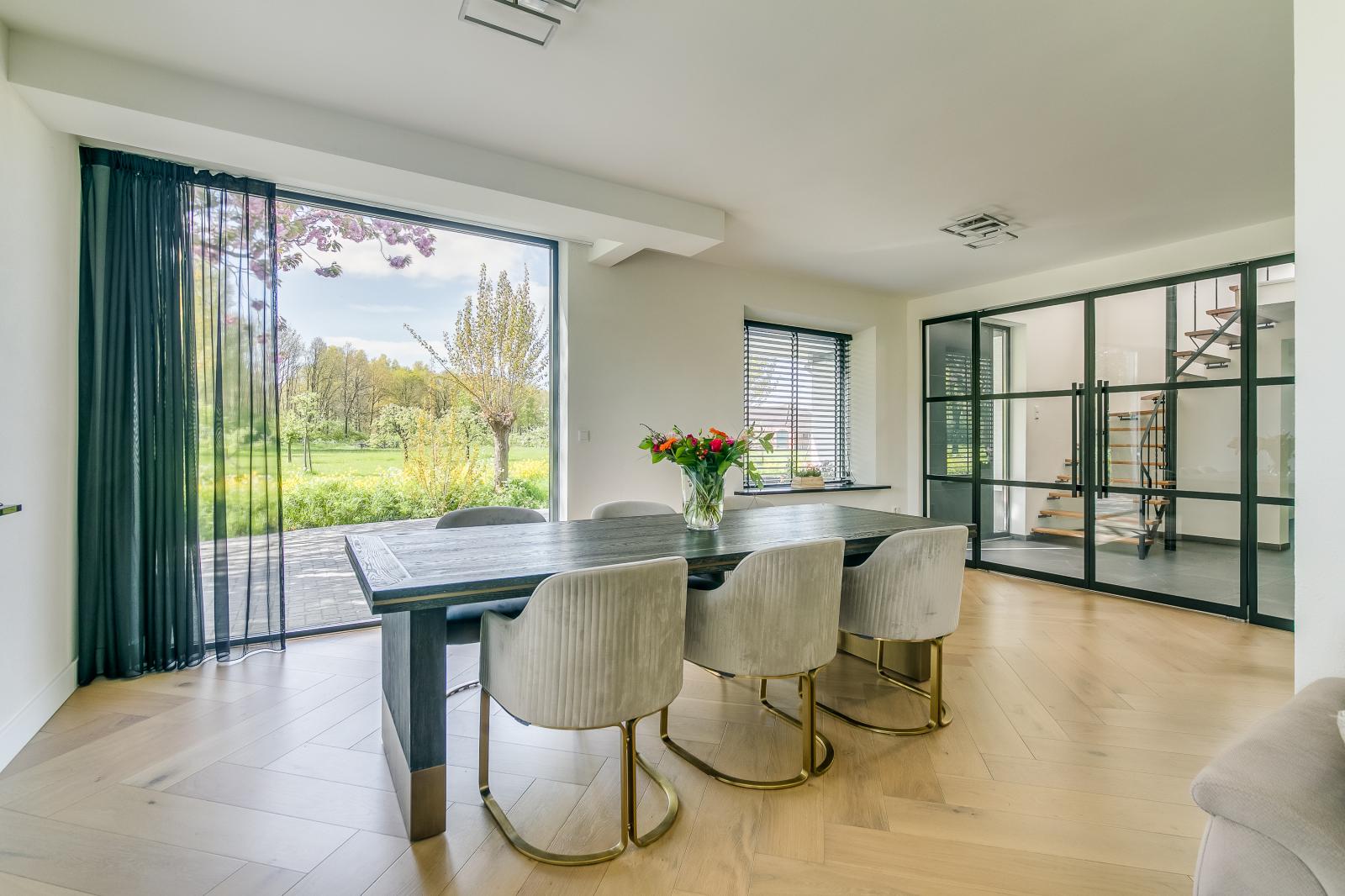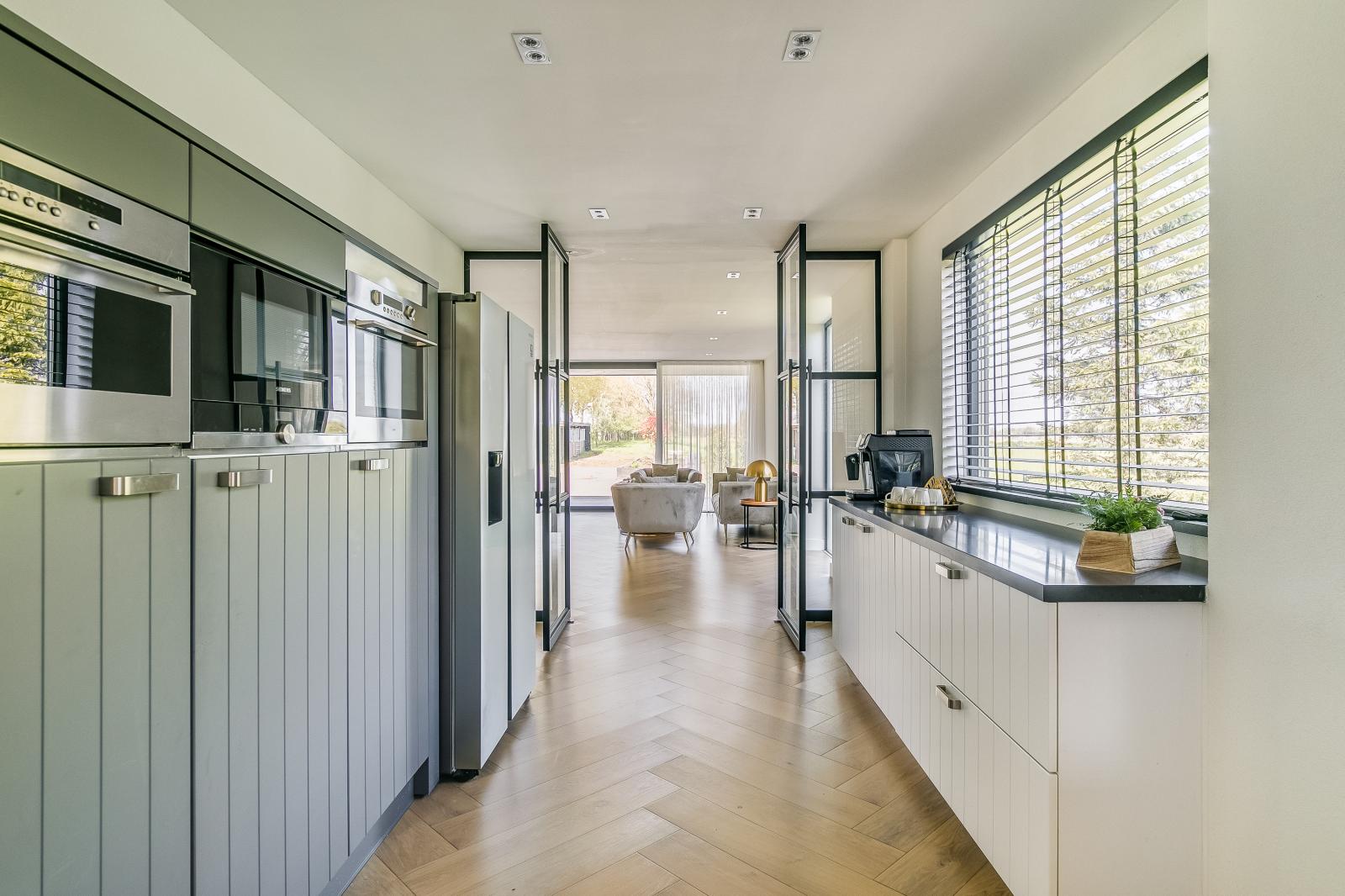 The property is accessed via a spacious private driveway, immediately highlighting its scale and well-kept appearance. The entrance is bright and provides access to the various living areas. The ground floor features two generously sized living rooms, each with its own function and atmosphere. The kitchen forms the heart of the home and is equipped with a cooking island and high-end built-in appliances. Large windows and sliding doors ensure an abundance of natural light and a seamless connection to the garden and terrace.