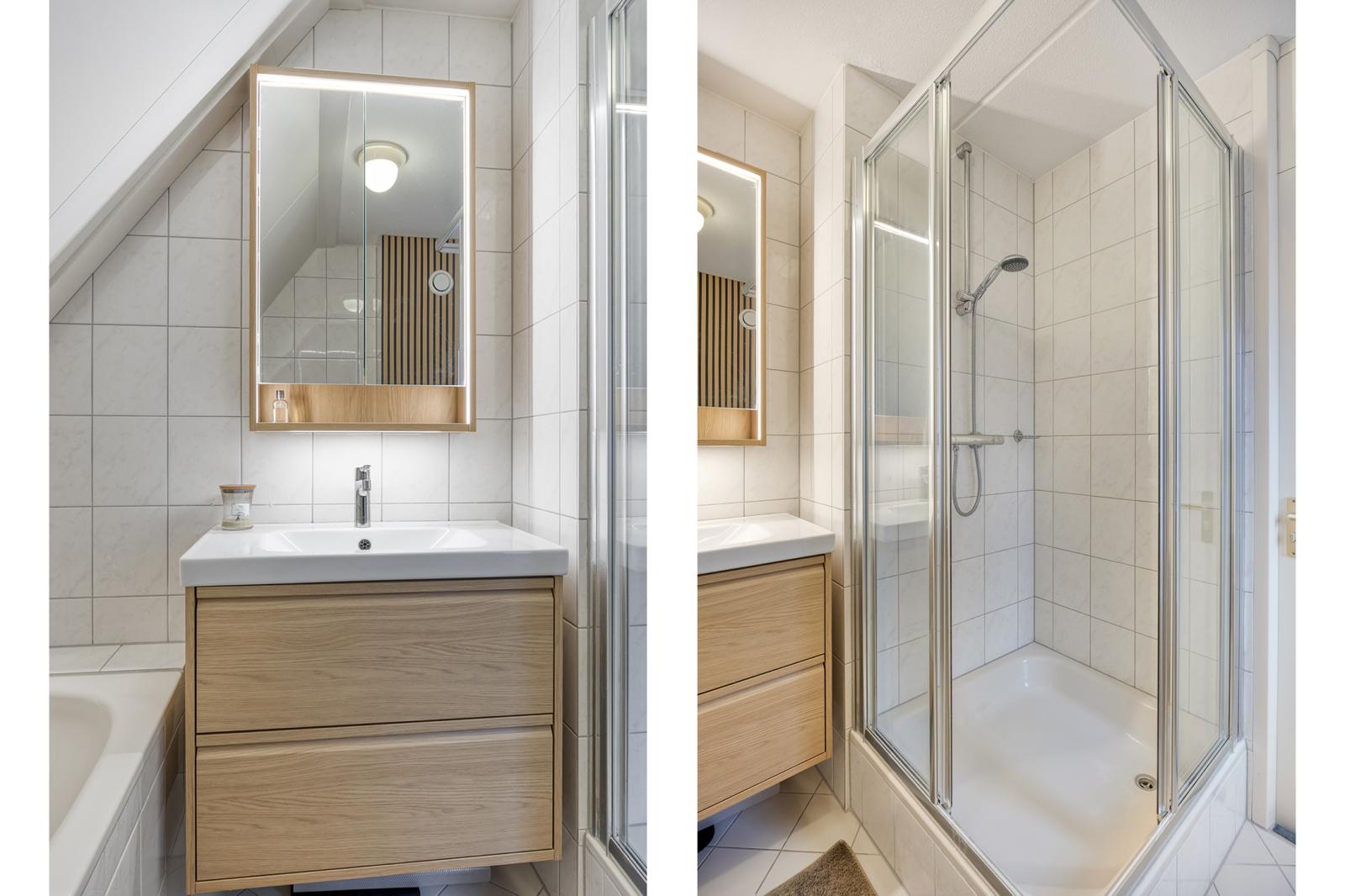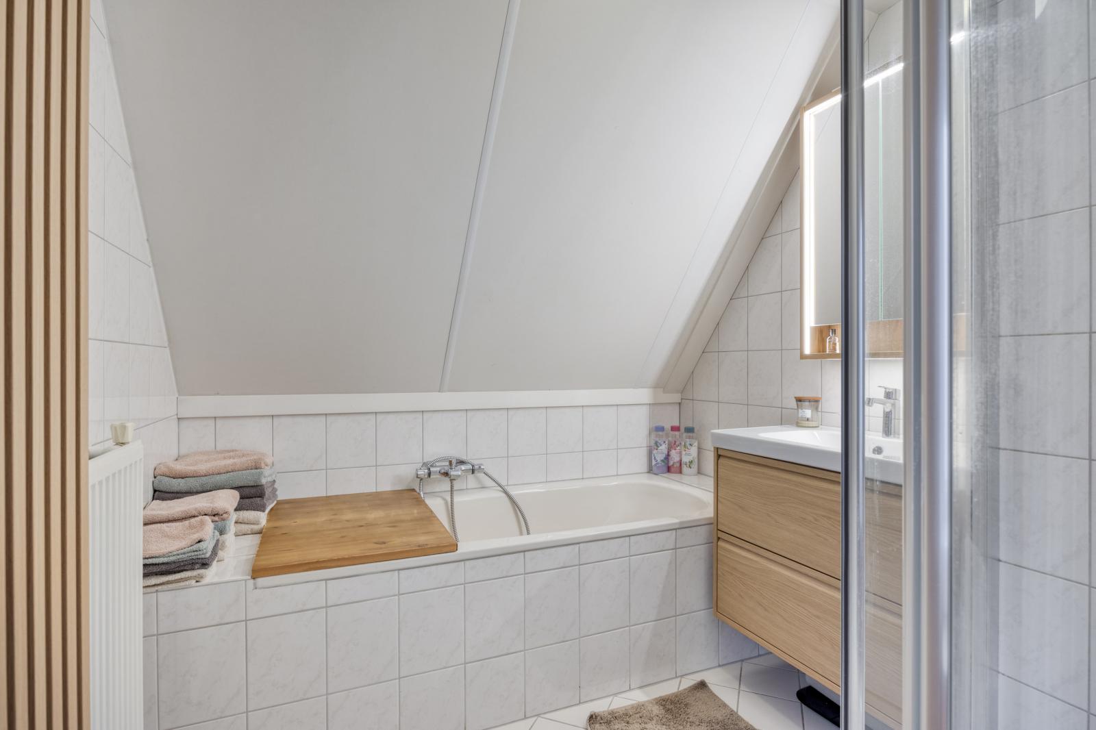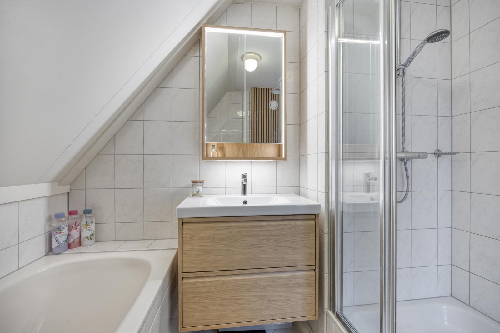 Overloop met aansluitend twee royale slaapkamers (optie voor drie slaapkamers), een badkamer en separaat toilet. De badkamer beschikt over een douchehoek, een ligbad en een wastafelmeubel.