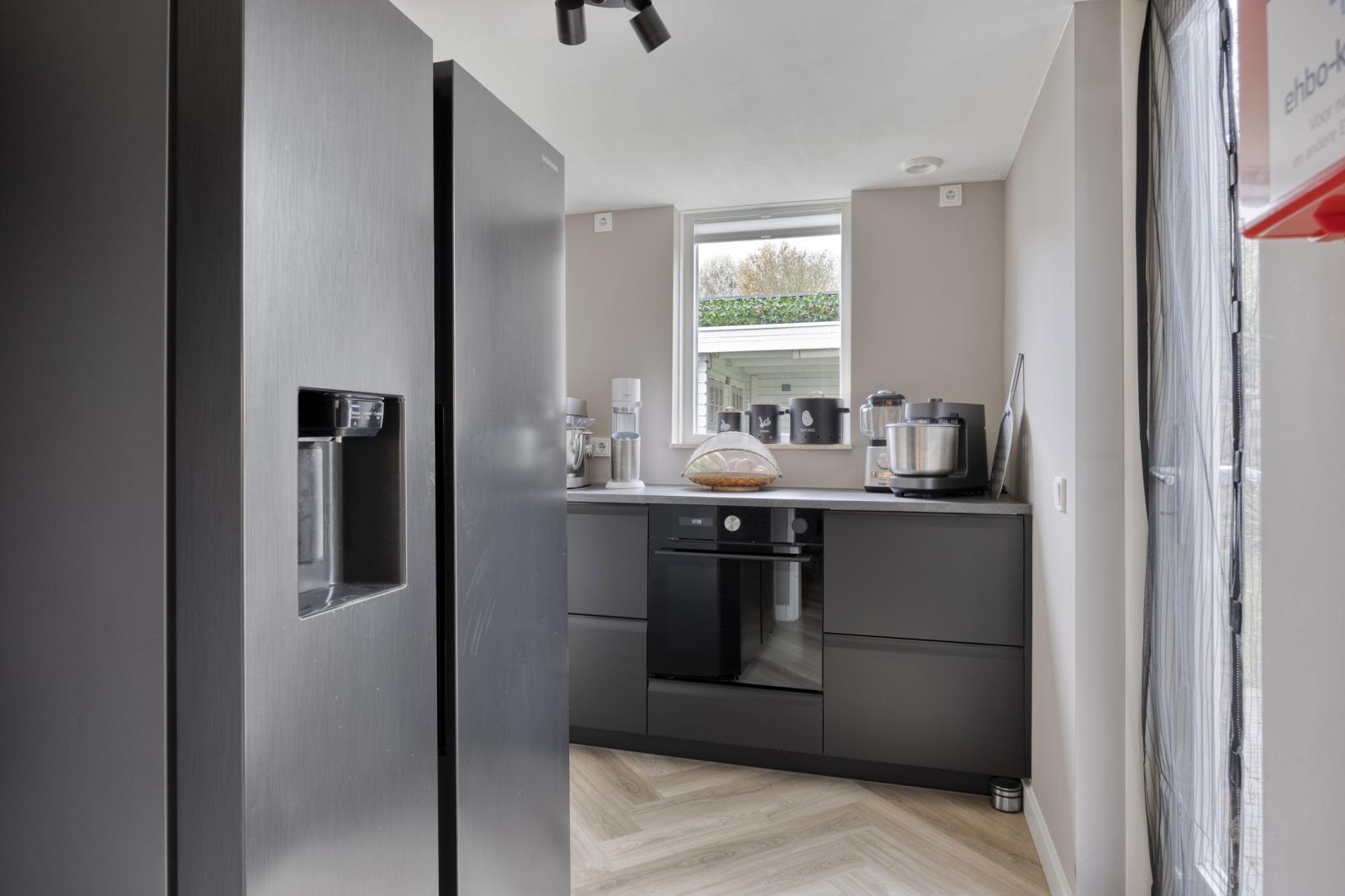 Entree, hal met nieuwe meterkast (glasvezel aanwezig), garderobe, toiletruimte met fonteintje, open trap naar de eerste verdieping en doorgang naar het woongedeelte. De woonkamer is straatgericht en heeft een ruime doorgang naar de geweldige keuken voorzien van Quooker kraan, vaatwasser, carrouselkast, inductie kookplaat met 5 zones waaronder twee multiflex zones, afzuigkap, lades met verlichting en veel bovenkasten. Via de keuken bereikt u de bijkeuken voorzien van een Amerikaanse koel/vries combinatie met ijsblokjes/crushed ice en koud water unit (ter overname), keukenblok voorzien van stoomoven en wederom lades met verlichting. Doorgang naar de ruime berging en naar de tuin.