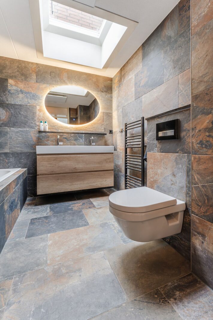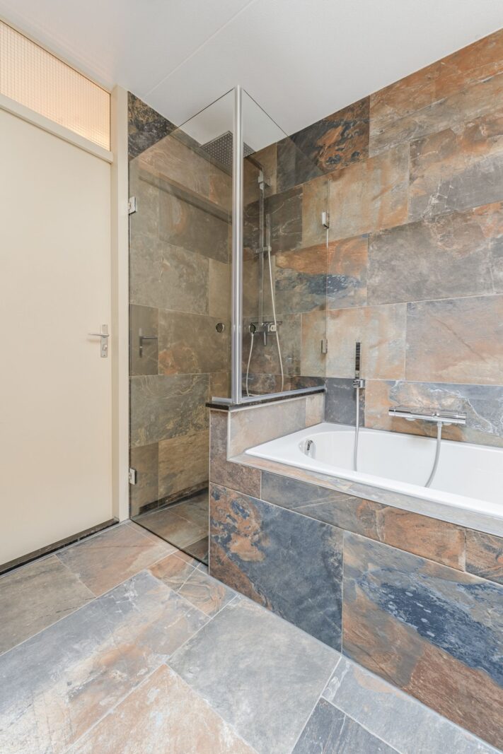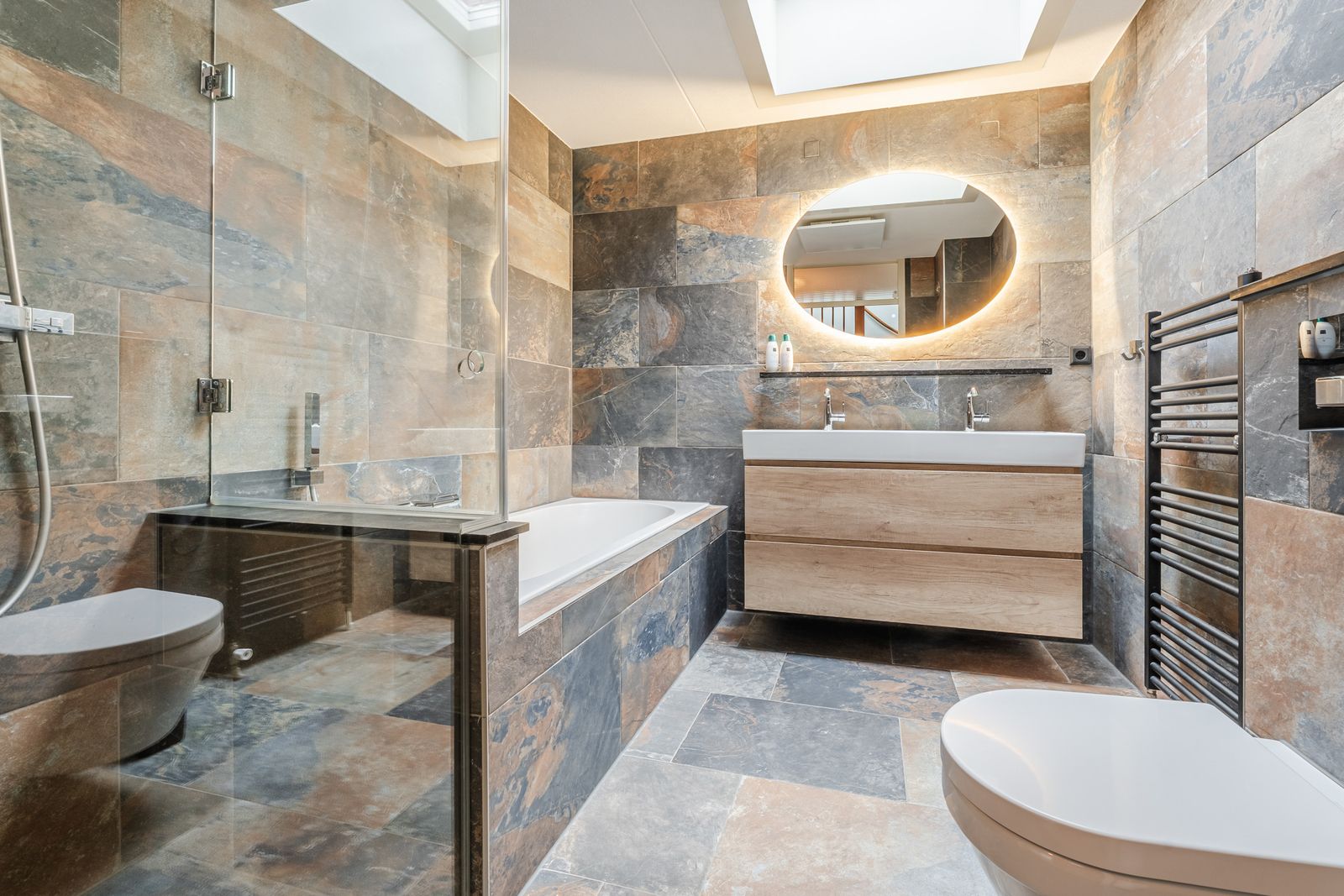 De badkamer is compleet uitgevoerd met toilet, dubbele wastafel, douche met regendouche en een apart ligbad. Dankzij de lichtkoepel kunt u vanuit het ligbad genieten van de sterrenhemel, wat deze ruimte extra bijzonder maakt.