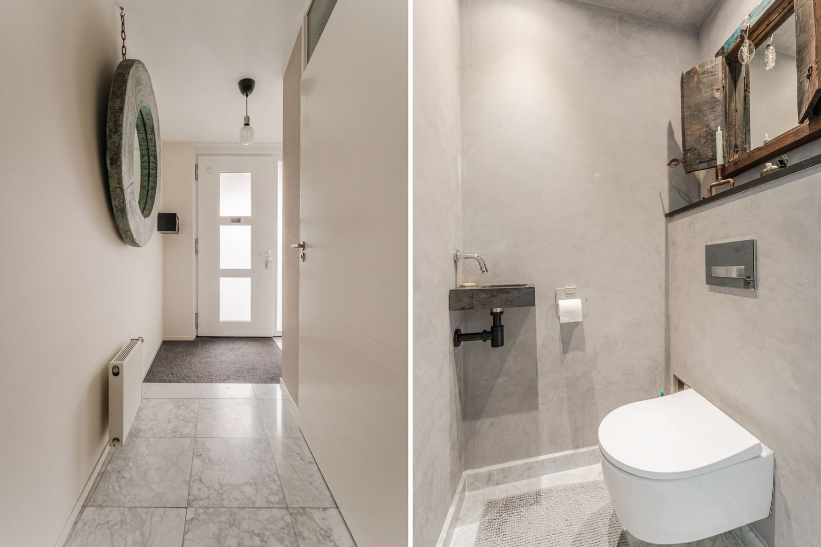 Bij binnenkomst in de hal bevinden zich de open trap naar de eerste verdieping, het toilet en de toegang tot de multifunctionele inpandige garage. Via twee openslaande deuren komt u in de ruime en lichte woonkamer met open keuken.