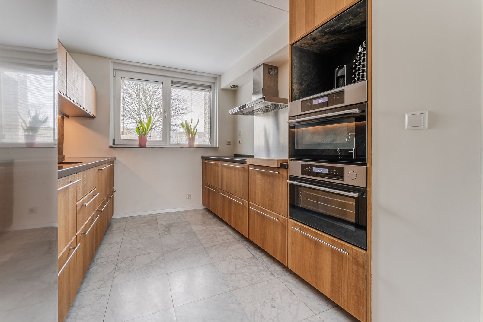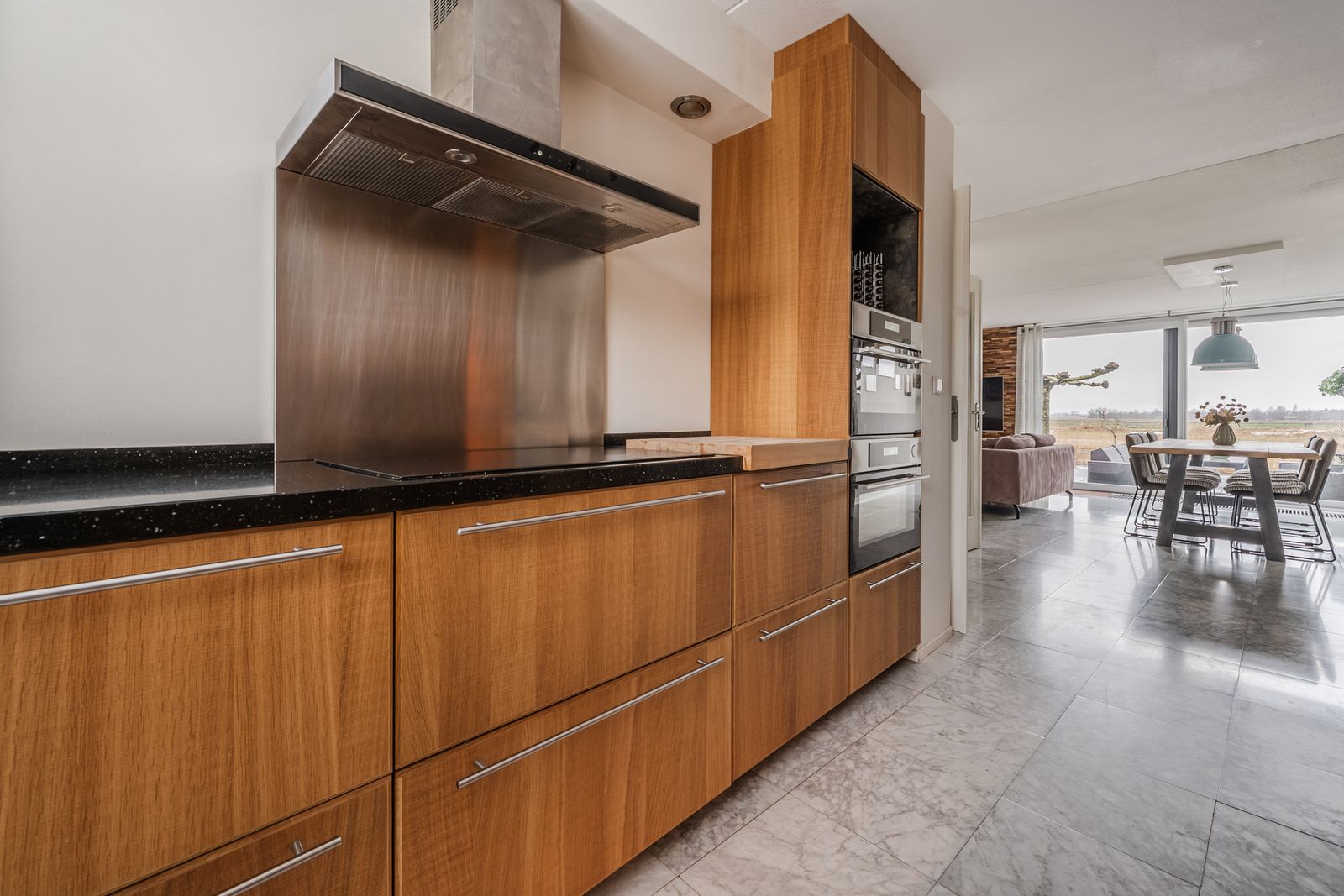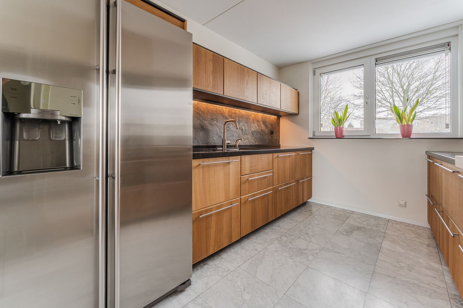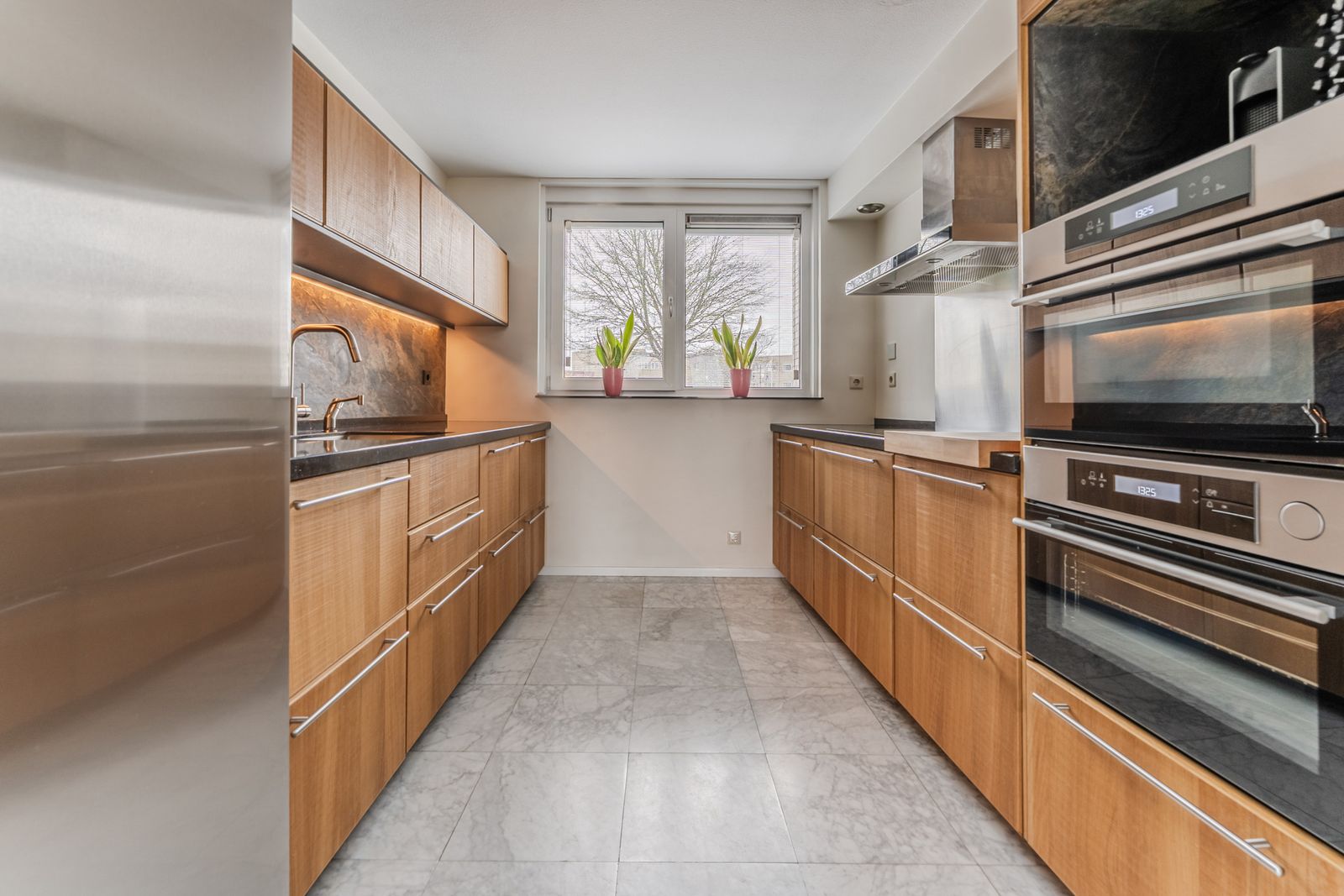 De keuken is voorzien van diverse inbouwapparatuur, waaronder een inductiekookplaat, stoomoven en Quooker, en biedt volop werk- en bergruimte. Dankzij de grote schuifpui en het extra raam in de steeg voelt de woonkamer bijzonder licht en ruim aan.