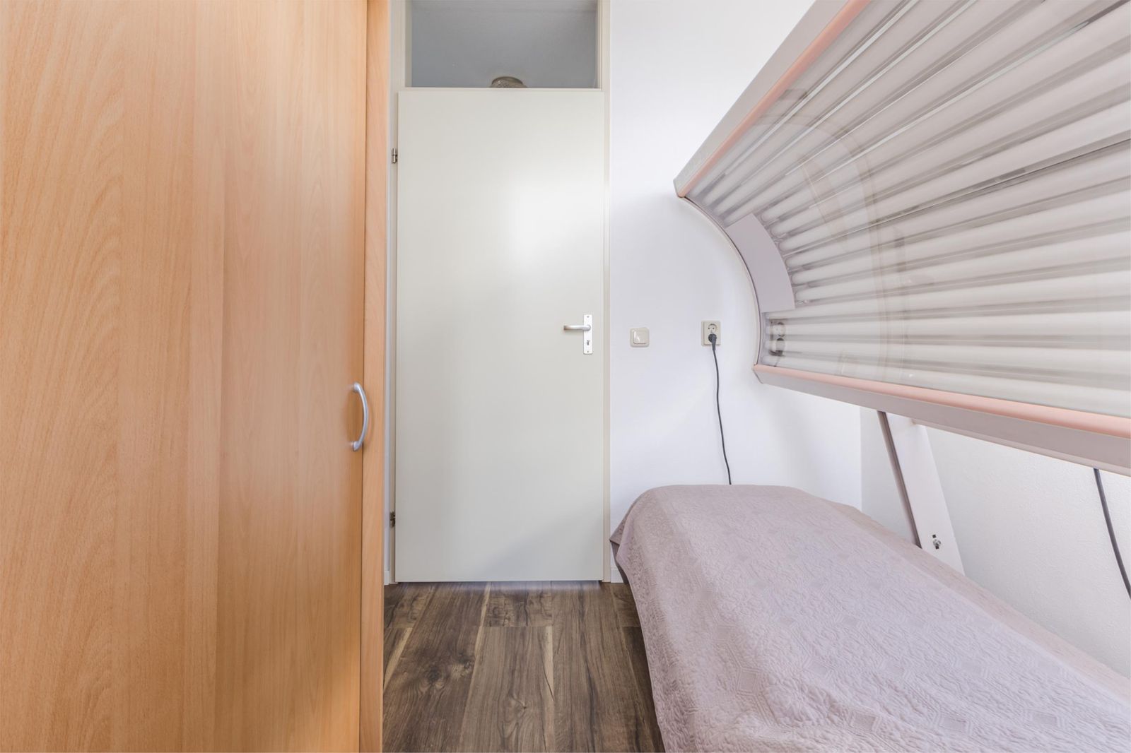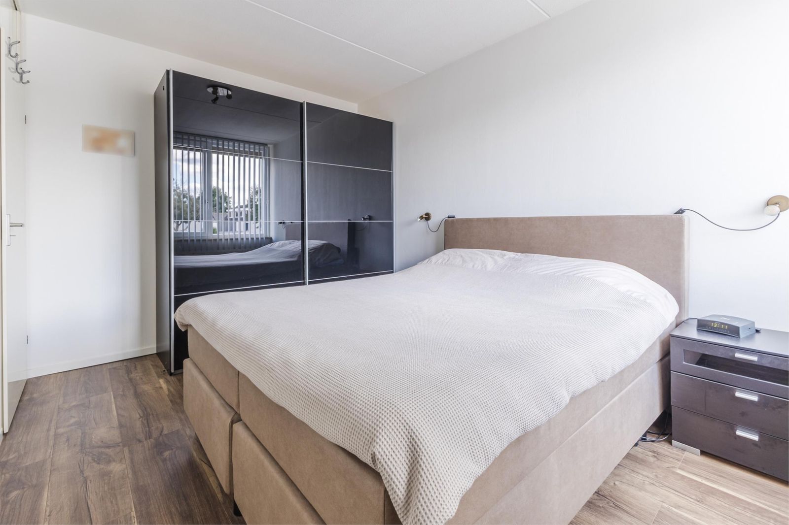 Aan de overloop grenzen drie slaapkamers en de badkamer. De hoofdslaapkamer is gelegen aan de voorzijde van de woning. De tweede slaapkamer ligt aan de achterzijde van de woning en heeft een leuk uitzicht op de tuin, de derde slaapkamer ligt eveneens aan de achterzijde en heeft een extra zijraam. Op de slaapkamers en op de overloop ligt een laminaatvloer. De volledig betegelde badkamer heeft een douche, ligbad, een royale meubel met dubbele wastafels met kast en een toilet.