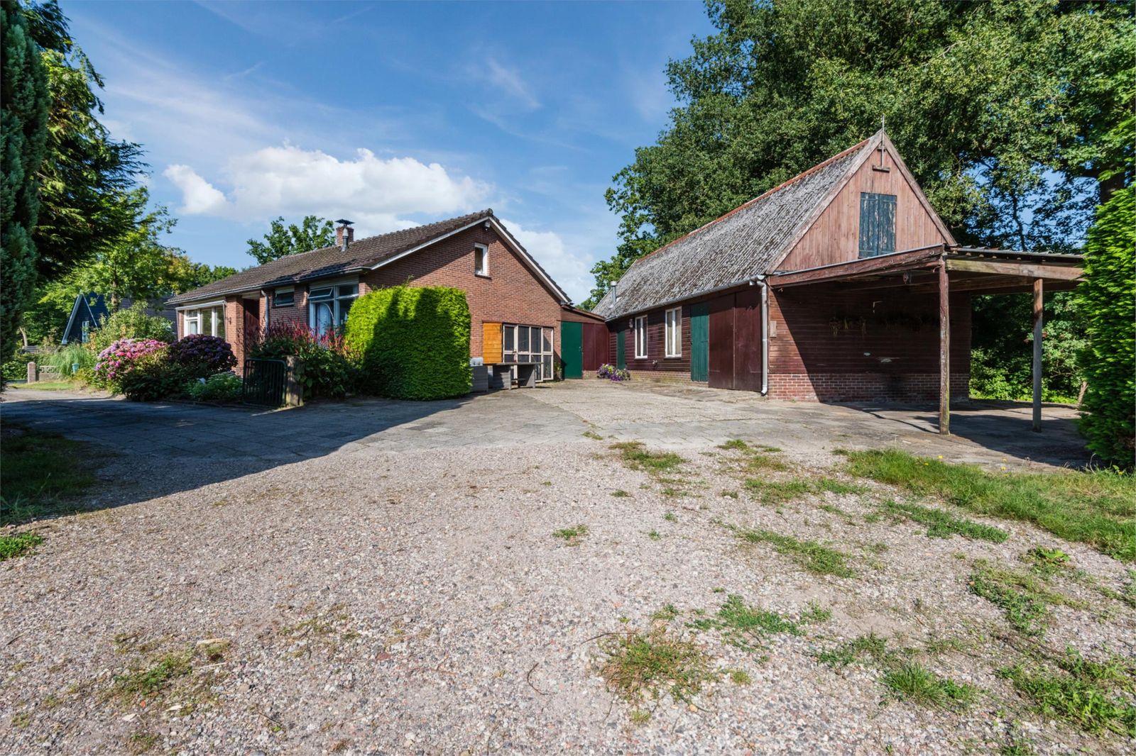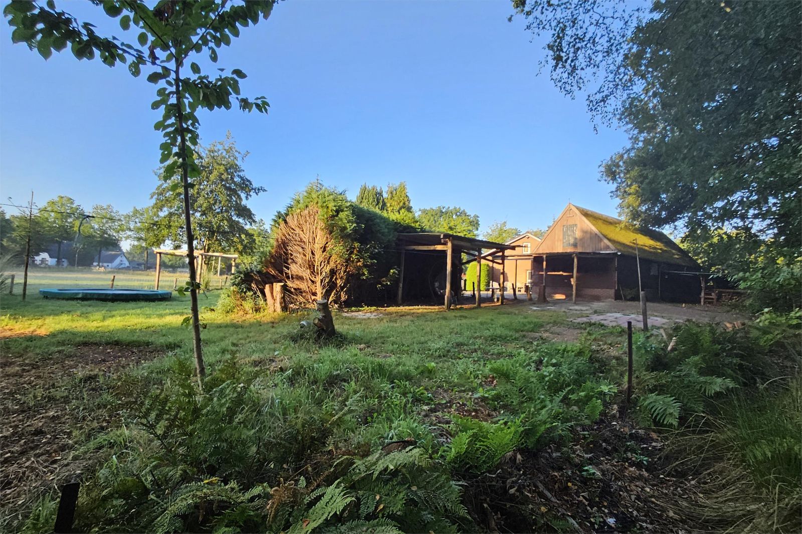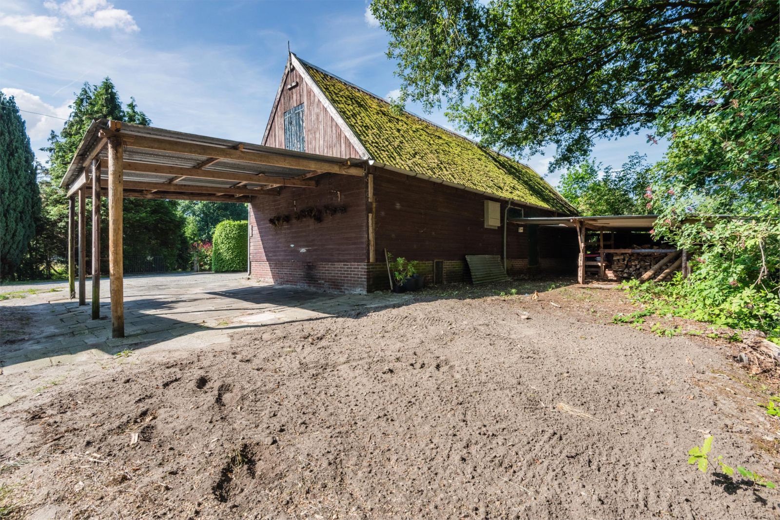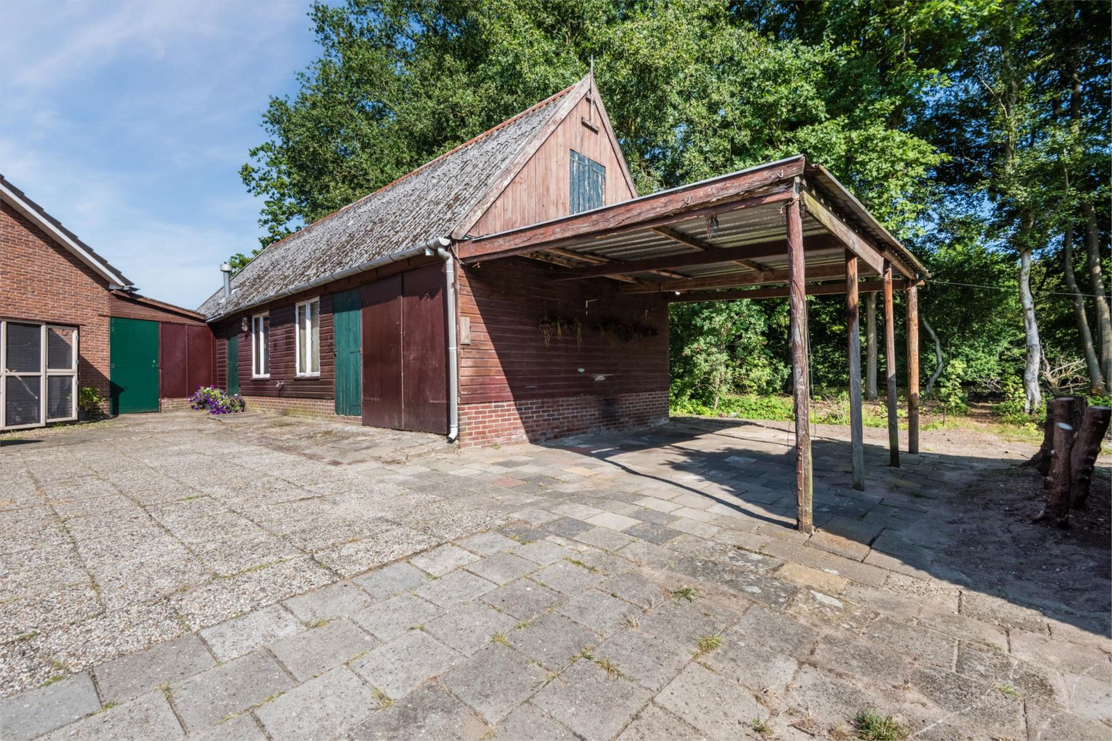 Via de keuken is de tuinkamer (eenvoudige aanbouw) bereikbaar en aansluitend de houten berging. Op het perceel staat verder nog een vrijstaande houten garage, een carport en diverse oude opstallen.