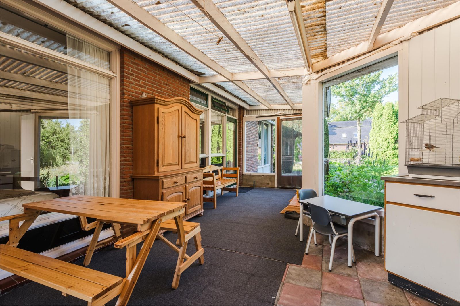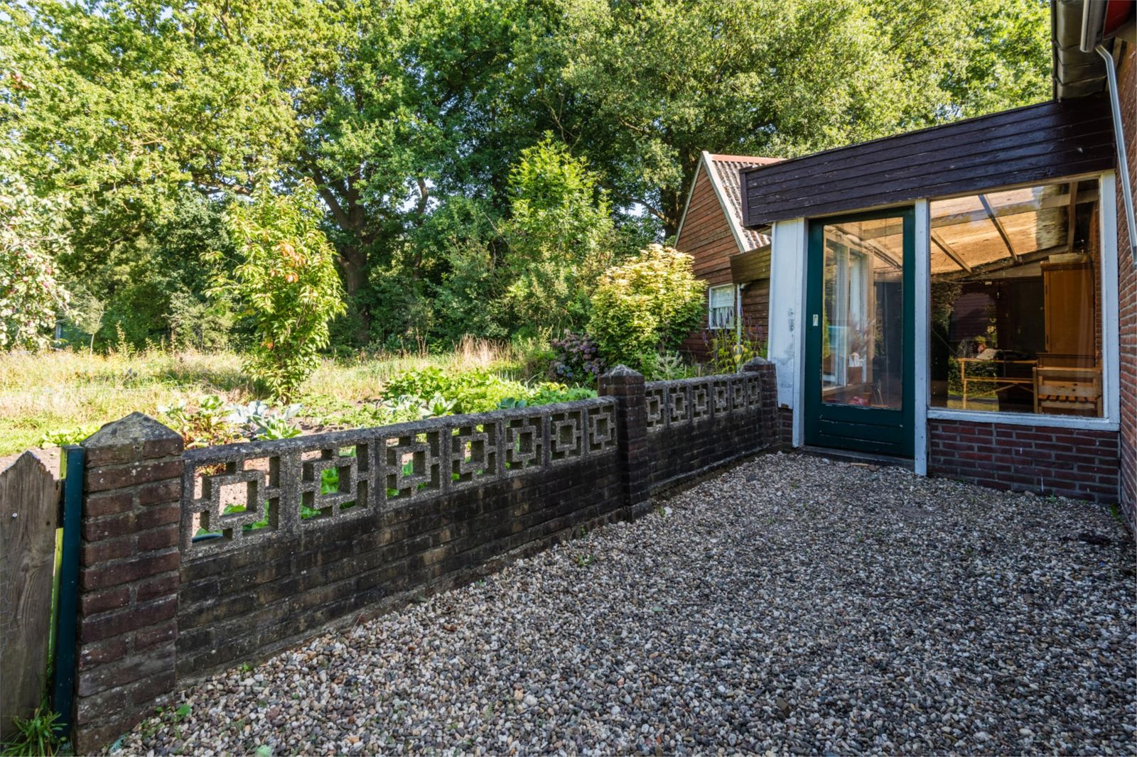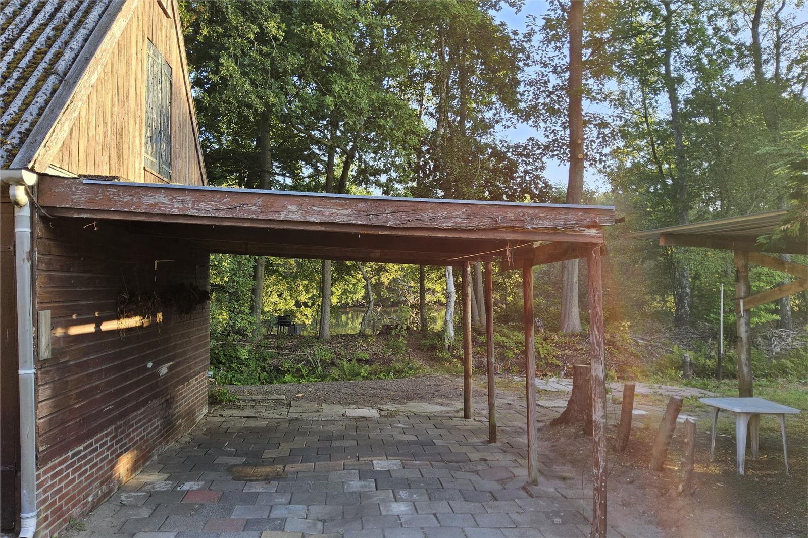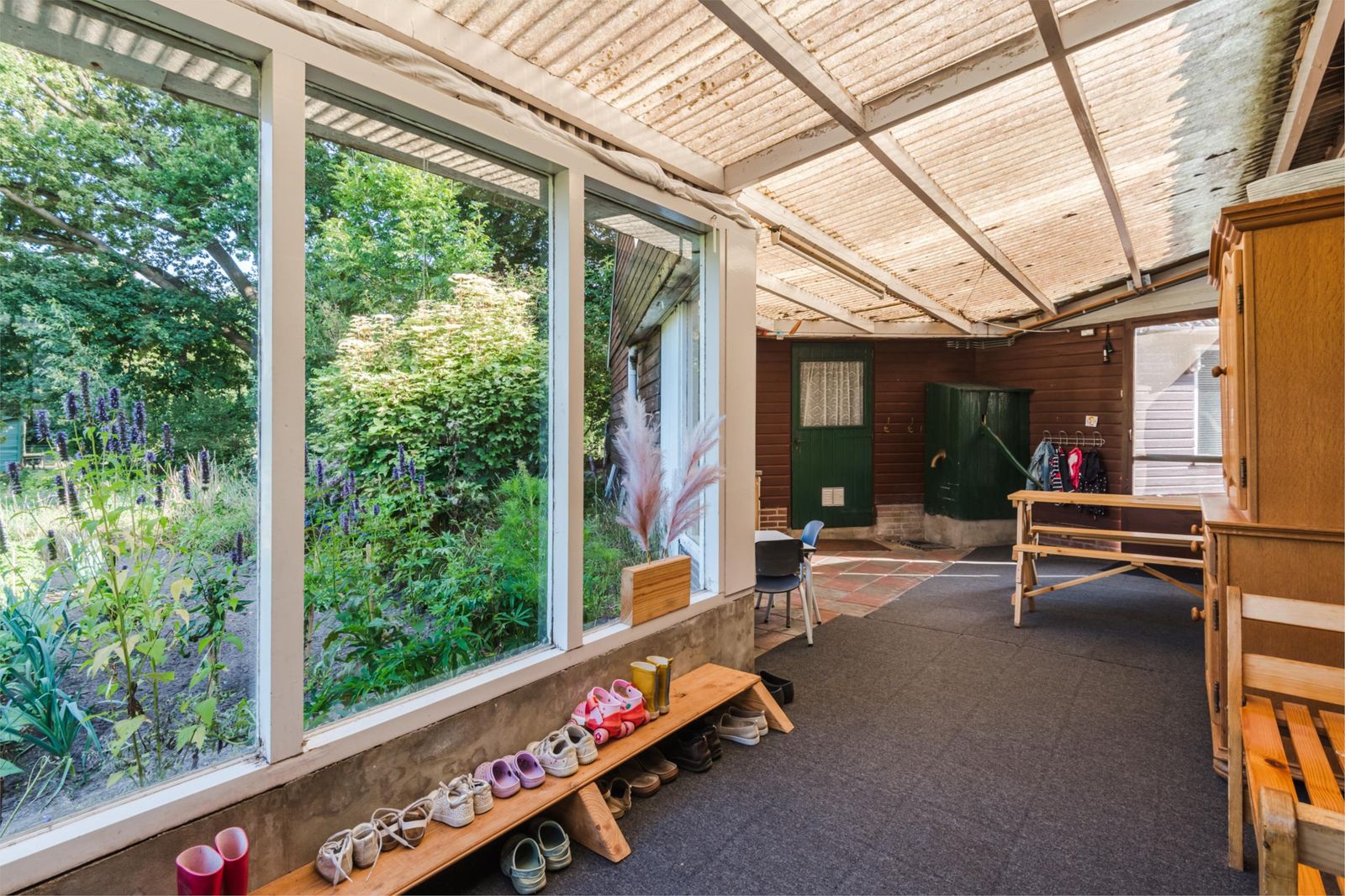 Via de keuken is de tuinkamer (eenvoudige aanbouw) bereikbaar en aansluitend de houten berging. Op het perceel staat verder nog een vrijstaande houten garage, een carport en diverse oude opstallen.