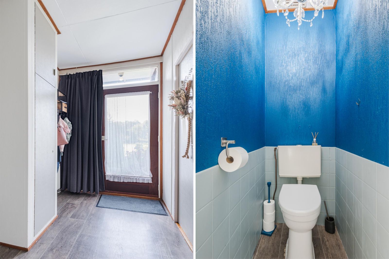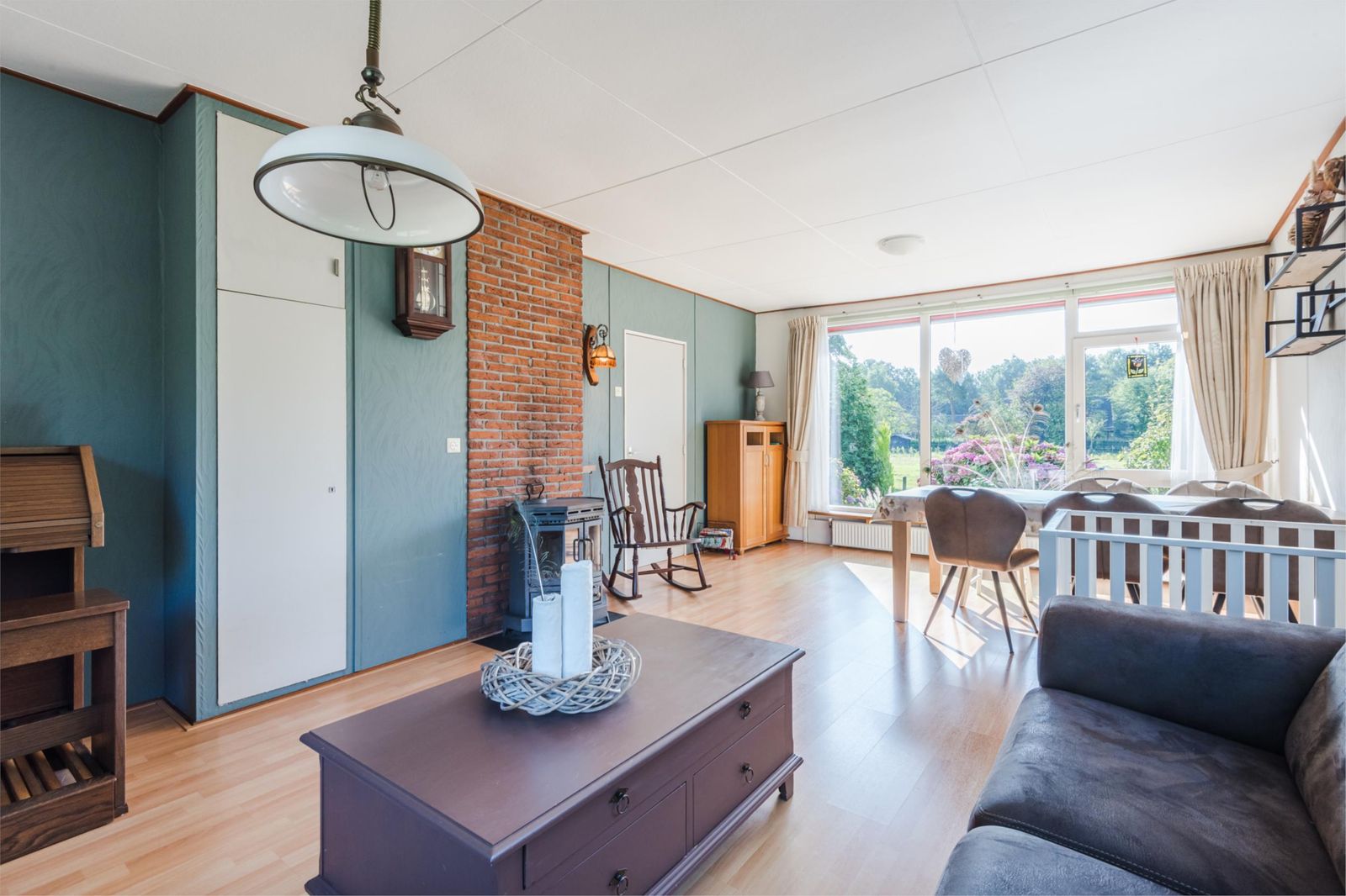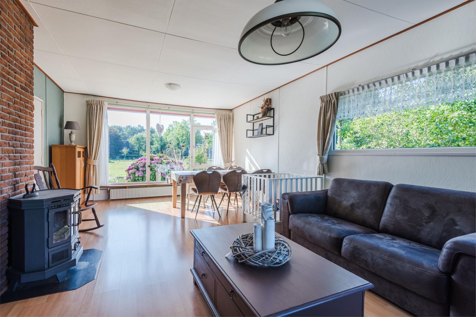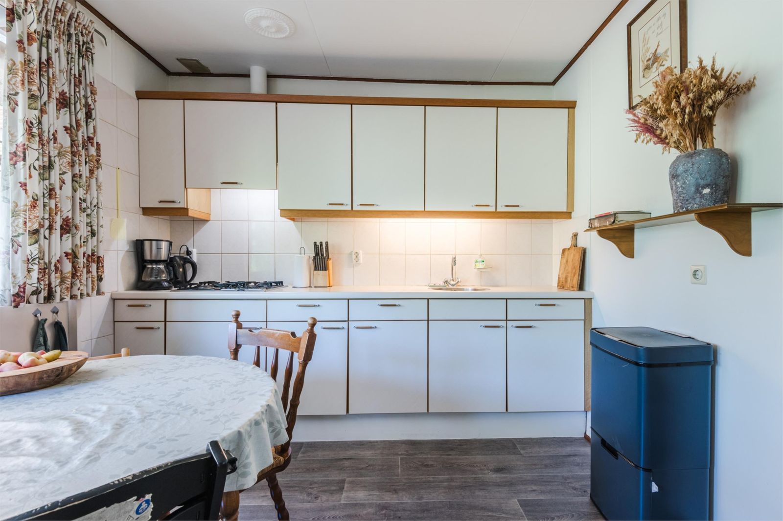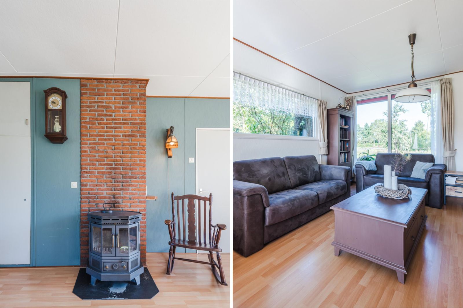 Hal, toilet en meterkast, lichte woonkamer aan de voorzijde met aan drie zijden ramen. De woonkamer is voorzien van een houtkachel en kunststof kozijnen (2016). Dichte keuken voorzien van eenvoudig keukenblok met gaskookplaat en afzuigkap.