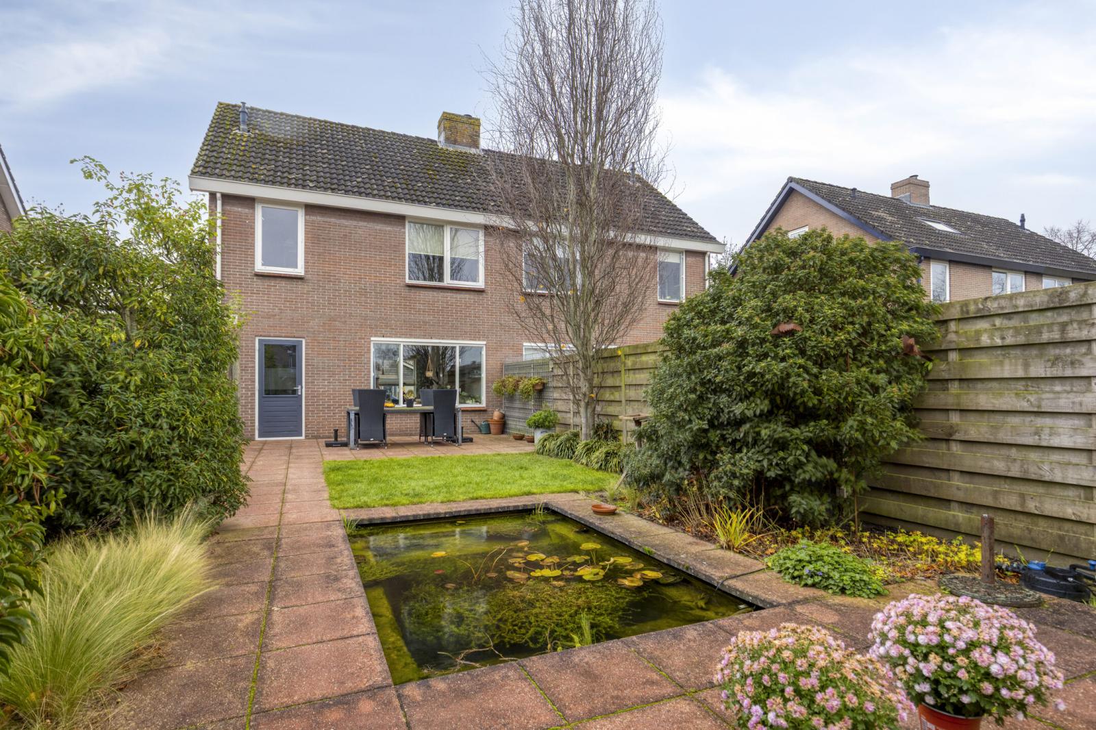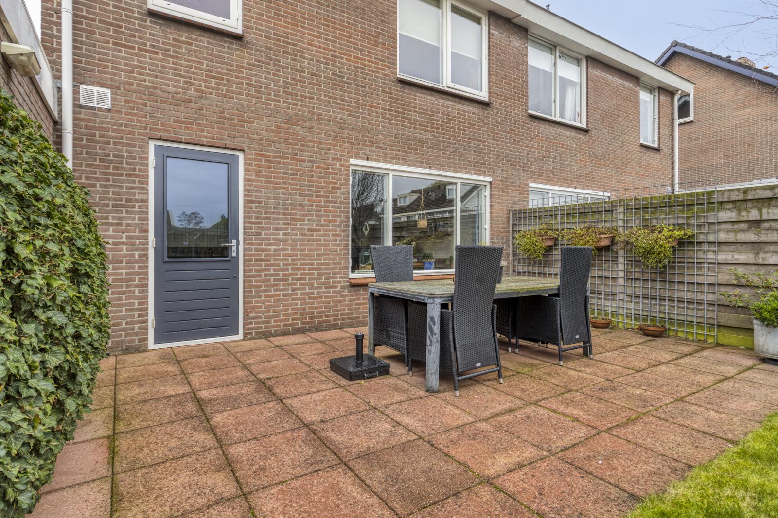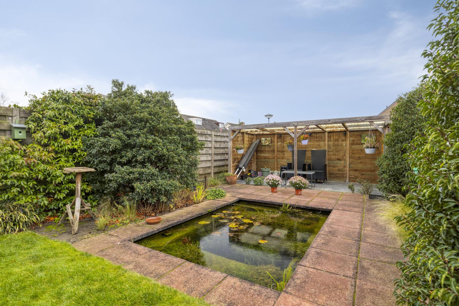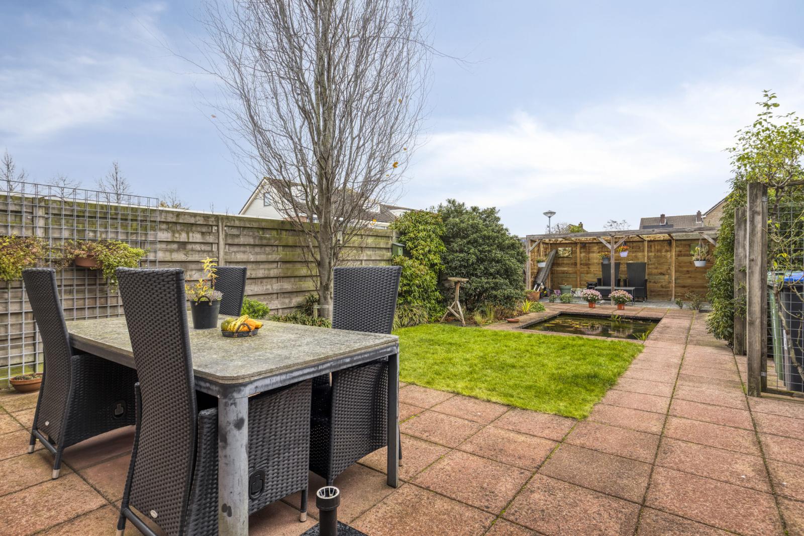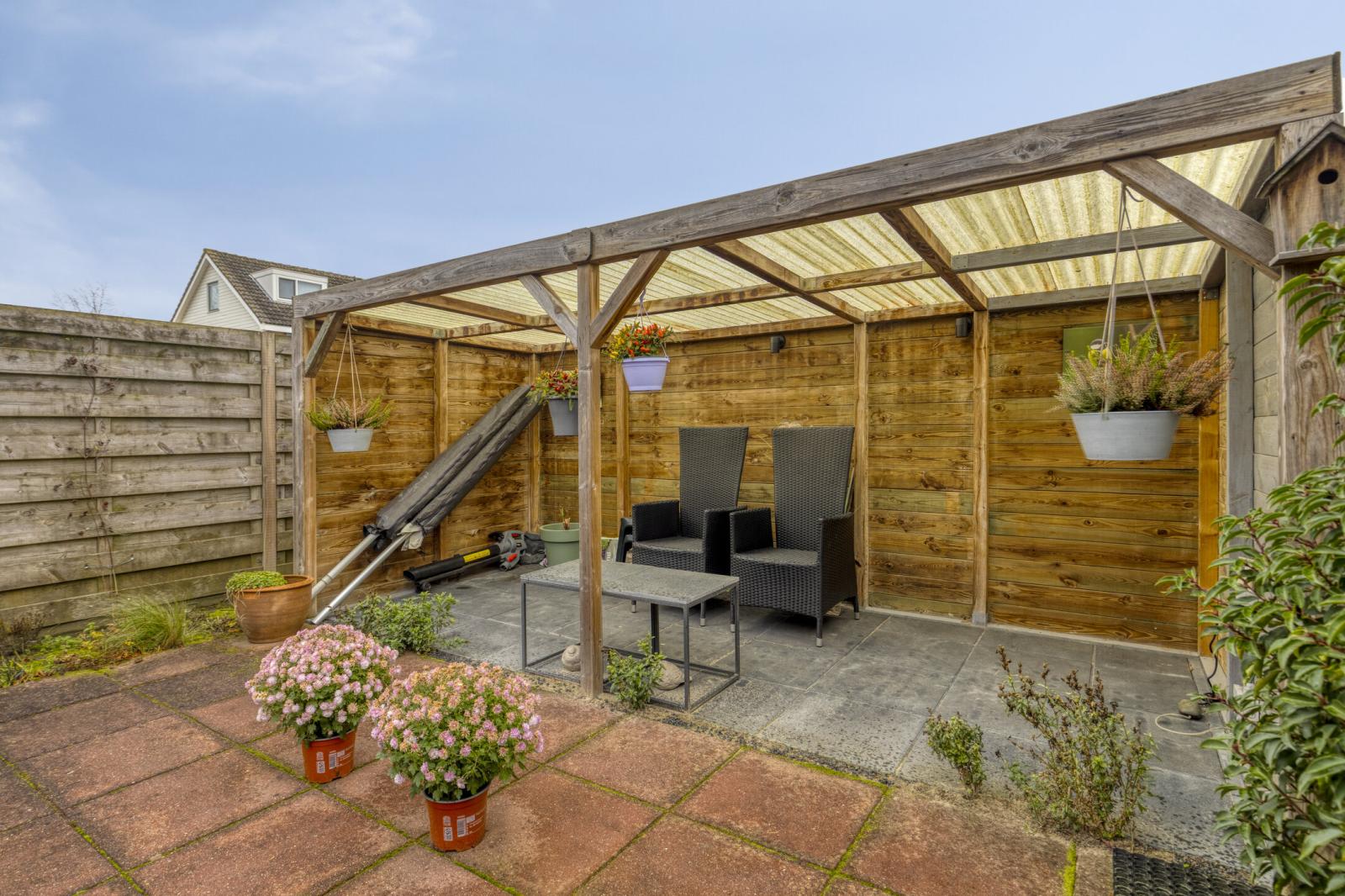 De achtertuin is ca. 13 meter diep, ca. 6 meter breed en ligt op het noordwesten. De tuin is onderhoudsvriendelijk ingericht met een combinatie van bestrating en groen. Achterin de tuin bevindt zich een gezellige overkapping, perfect als beschutte zithoek in alle seizoenen. De tuin is bereikbaar via een poort aan de zijkant van het huis.