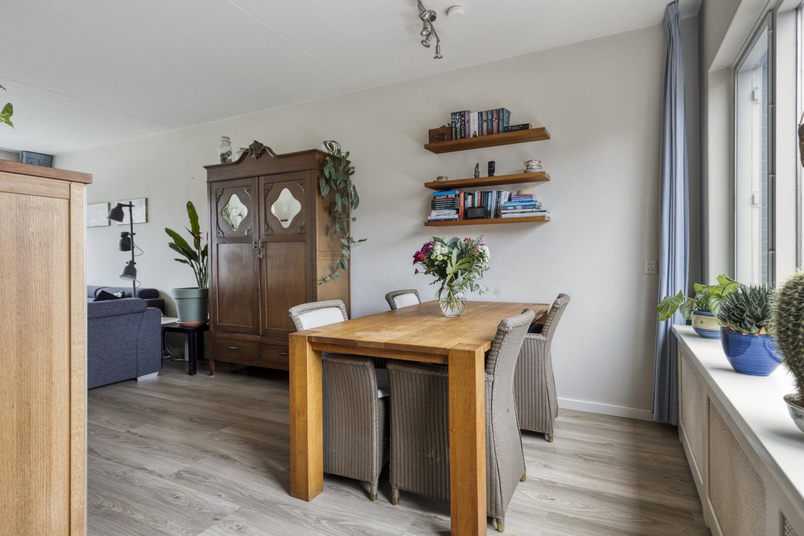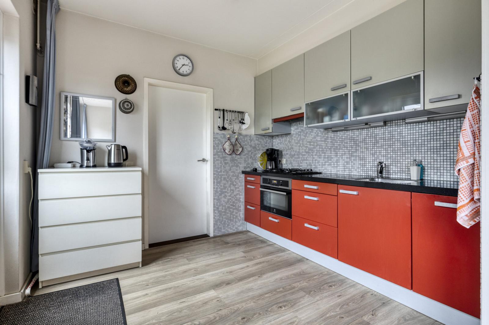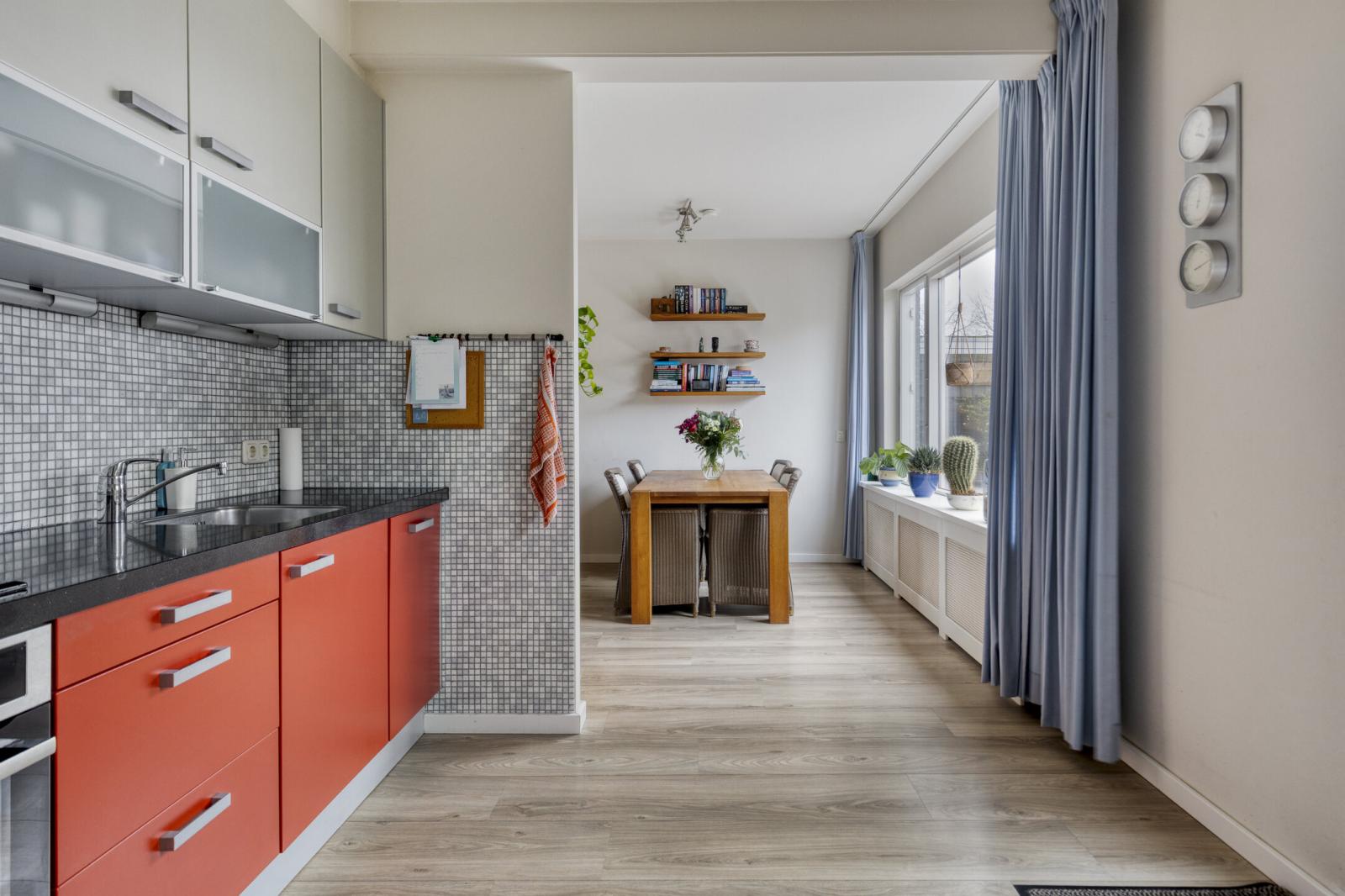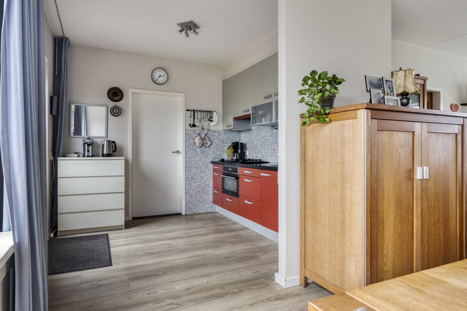Binnenkomst in de hal met meterkast en toilet met fonteintje. Vanuit de hal stap je in de lichte woonkamer met grote raampartijen, wat zorgt voor een prettige lichtinval en een ruimtelijk gevoel. Aan de achterzijde bevindt zich de halfopen keuken, voorzien van een gasfornuis, combimagnetron, vaatwasser en afzuigkap.